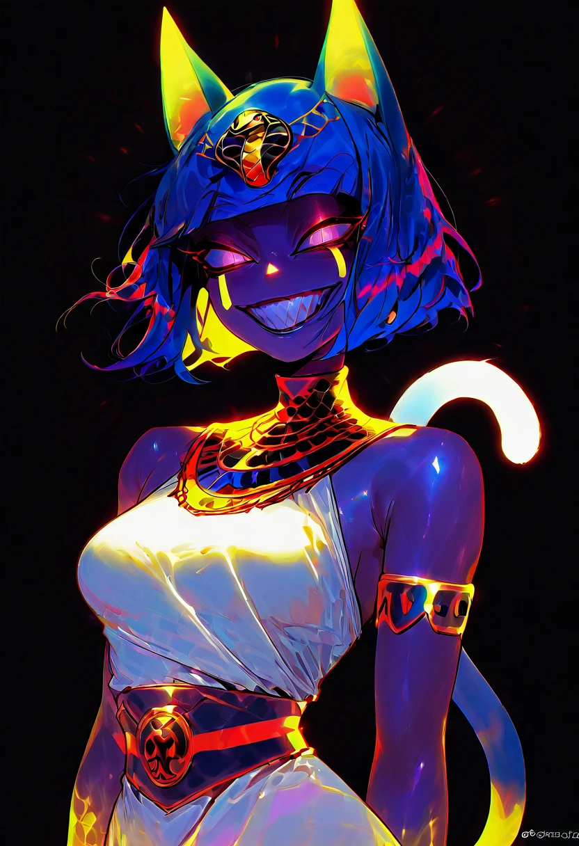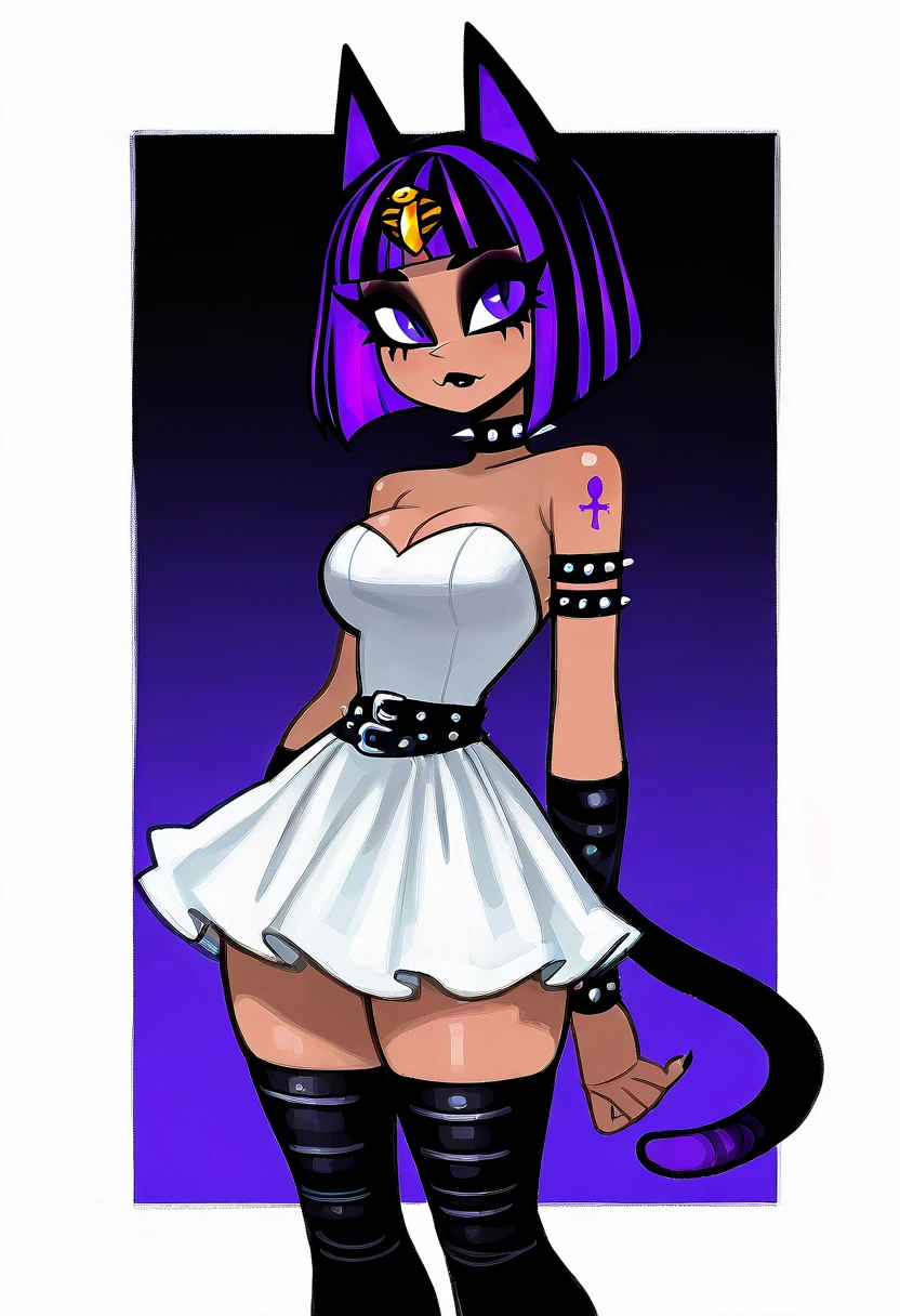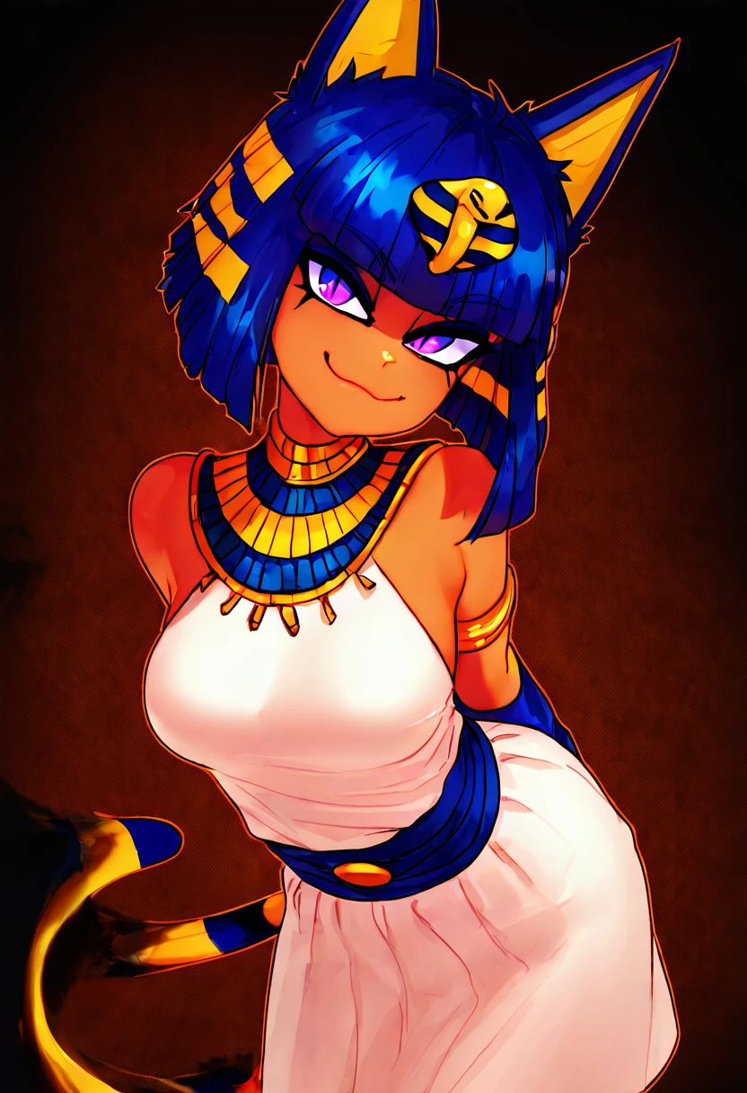 zzAnkha, purple eyes, animal crossing, animal ears, armlet, blonde hair, blue hair, blunt bangs, blunt ends, bob cut, cat ears, cat girl, cat tail, dark skin, eye of horus, eyelashes, eyes visible through hair, facial tattoo, humanization,