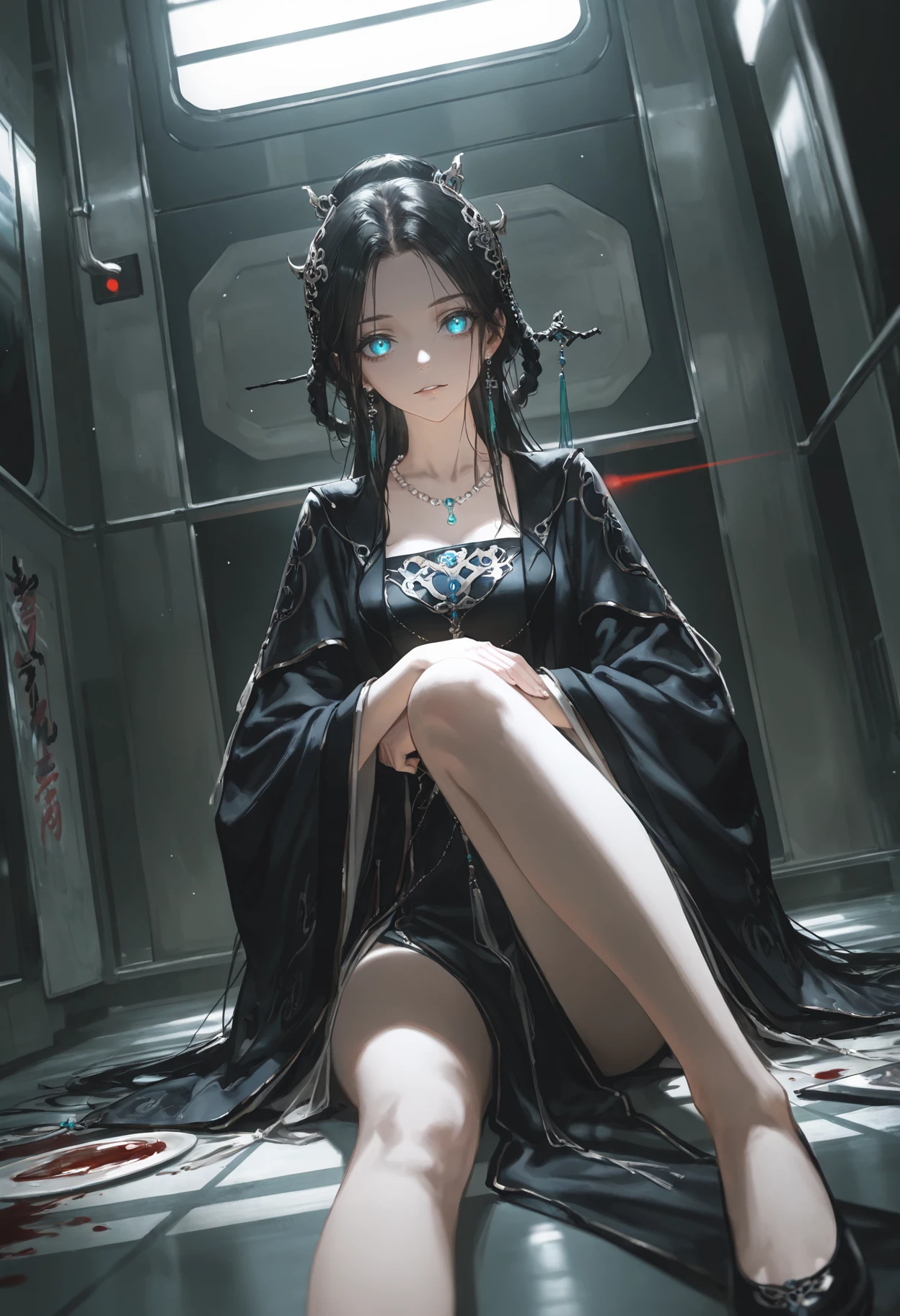 Yugu,black hair,green ends,blue eyes,long hair,updo hairdo,