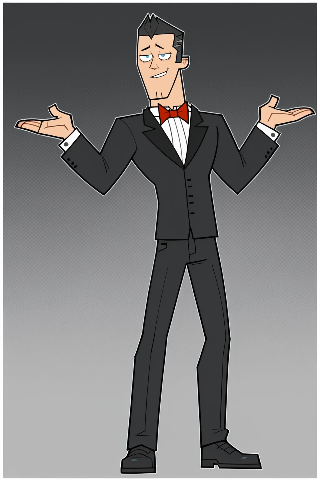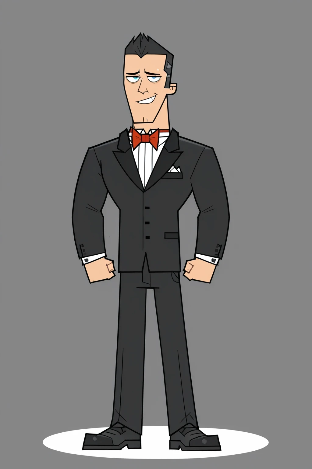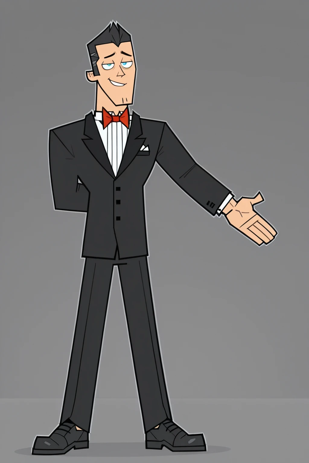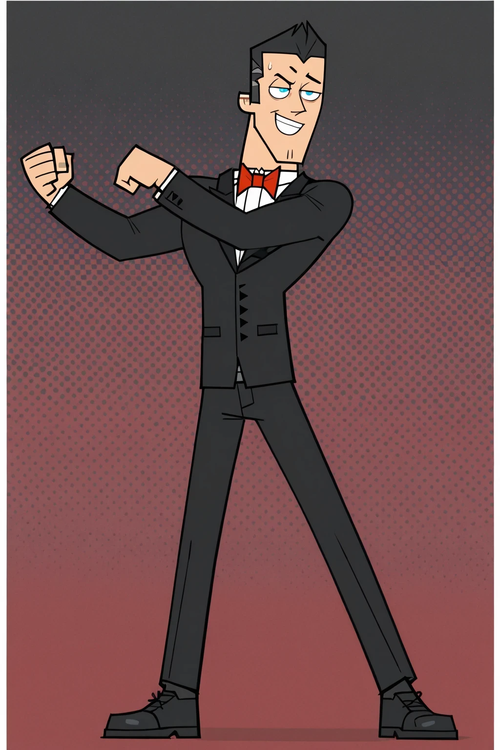JoshTDACM, 1boy, formal black suit with sharp tailoring, white shirt, vibrant red bowtie, black trousers, spiky black hair, black shoes, blue eyes, josh (tdi)