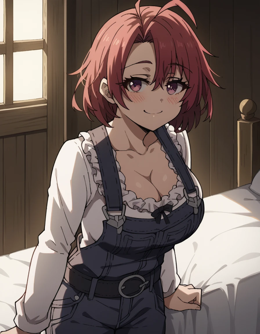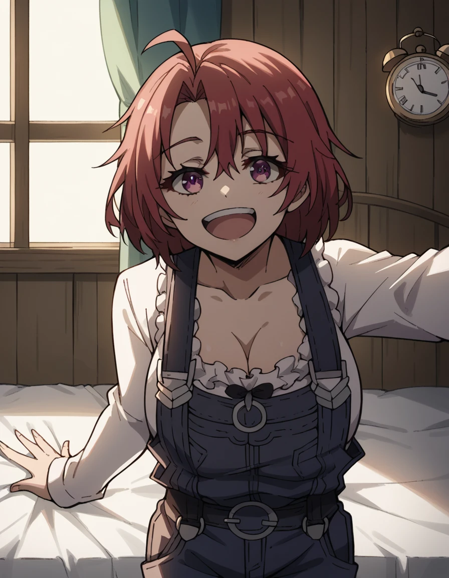 cow girl, ahoge, red hair, purple eyes, short hair,