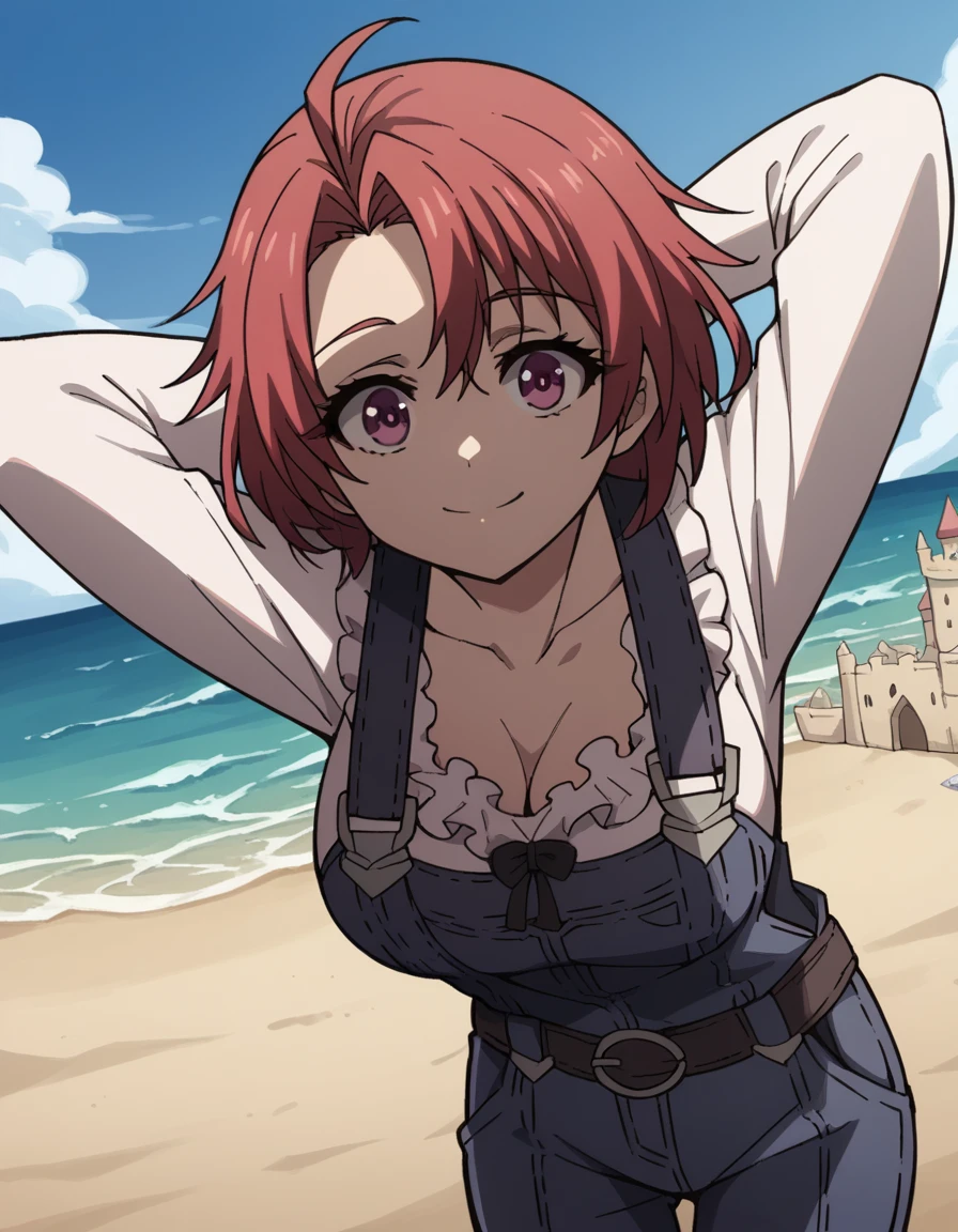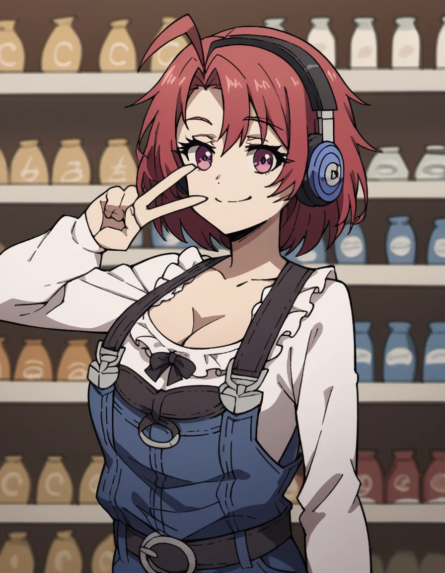 cleavage, collarbone, frills, long sleeves, overalls, suspenders,