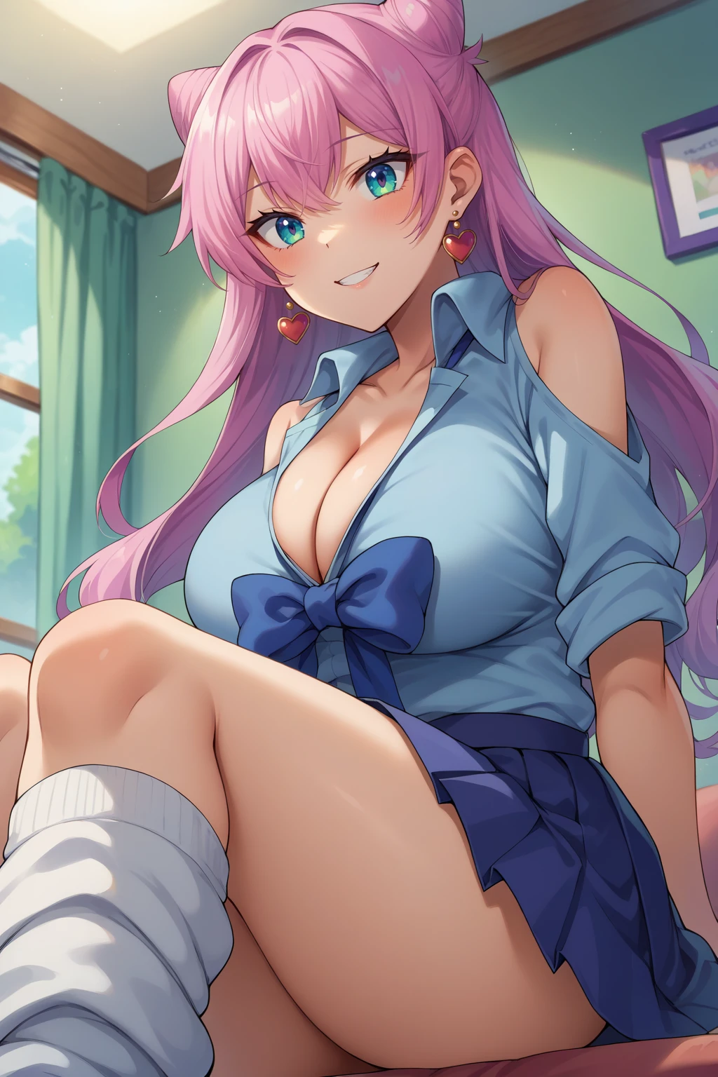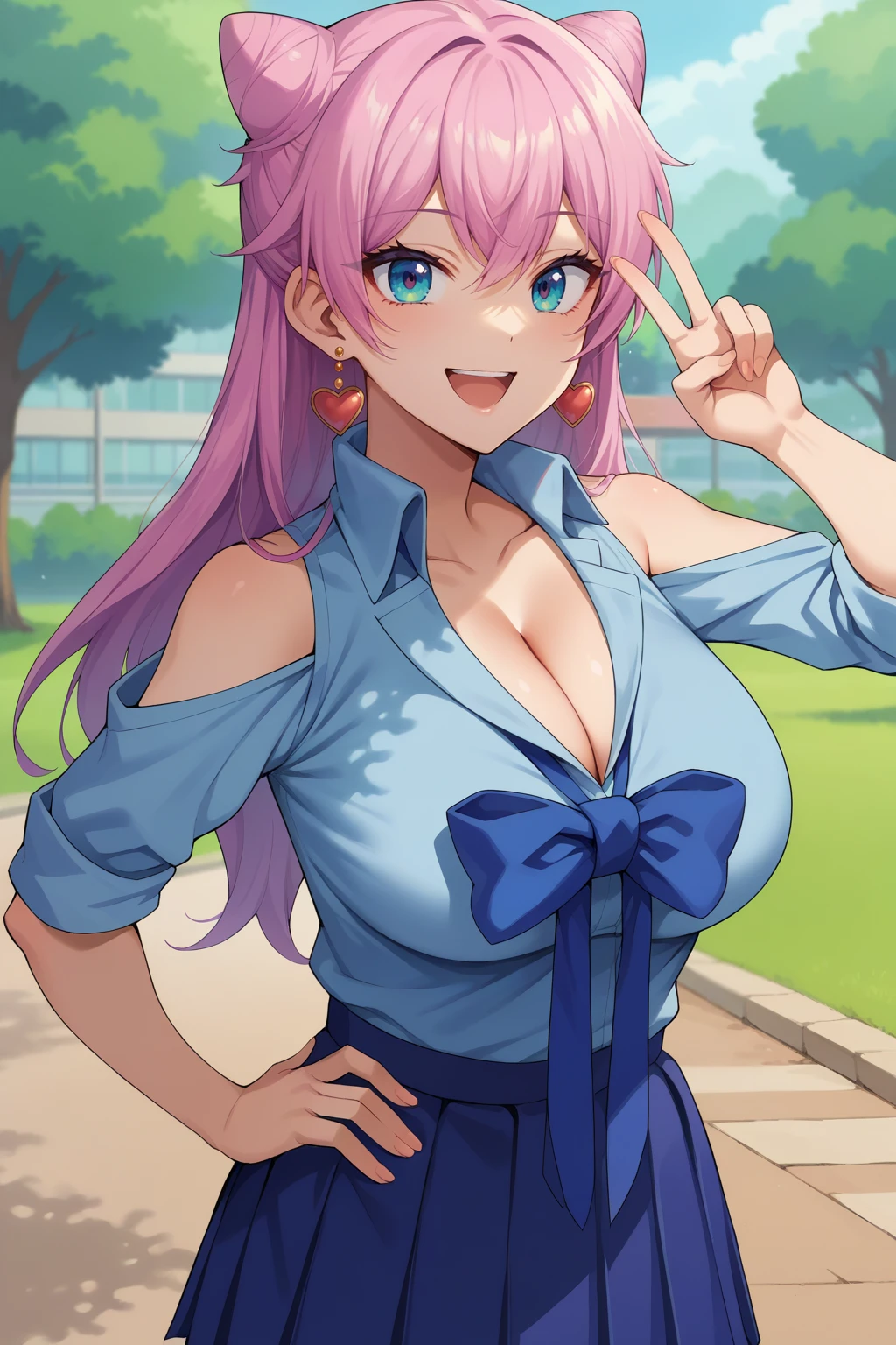 cone hair bun, double bun, heart earrings, blue collared shirt, shoulder cutout, cleavage, blue bow, sleeves rolled up, pleated skirt, loose socks