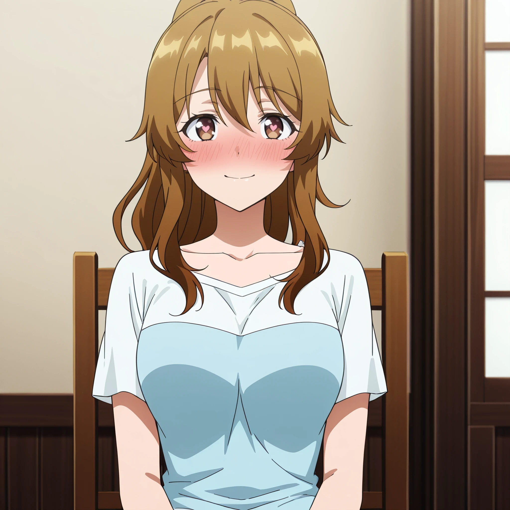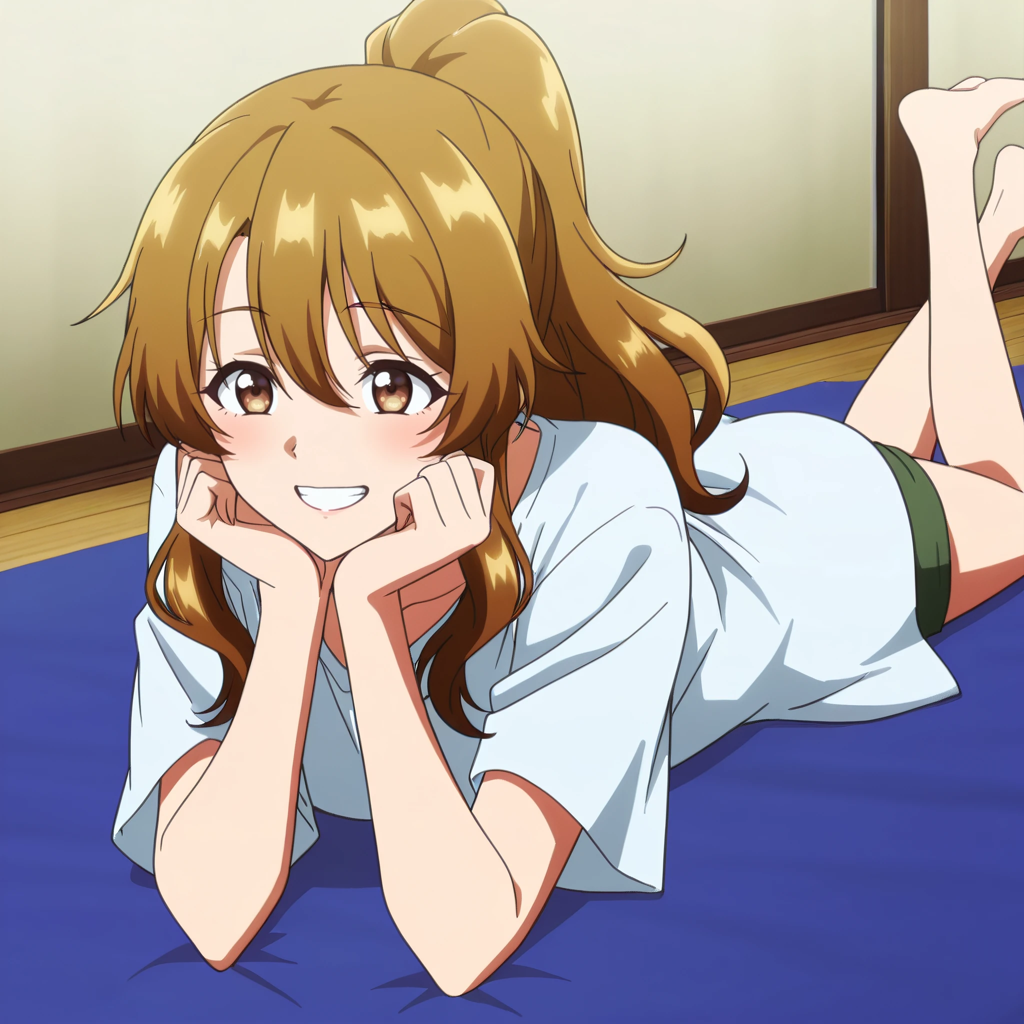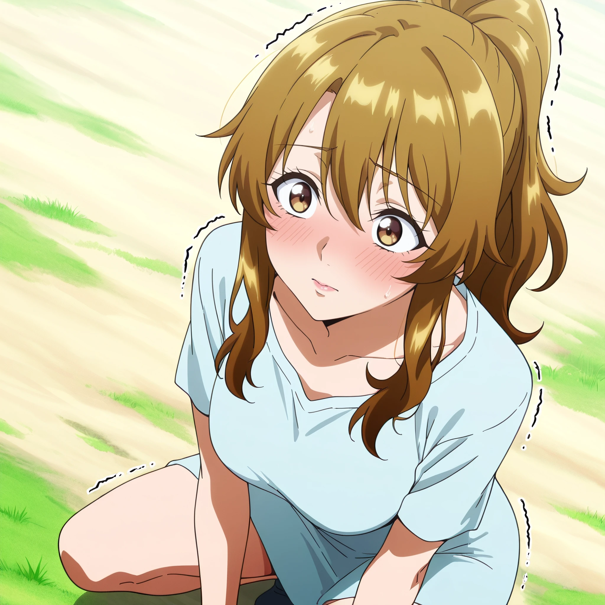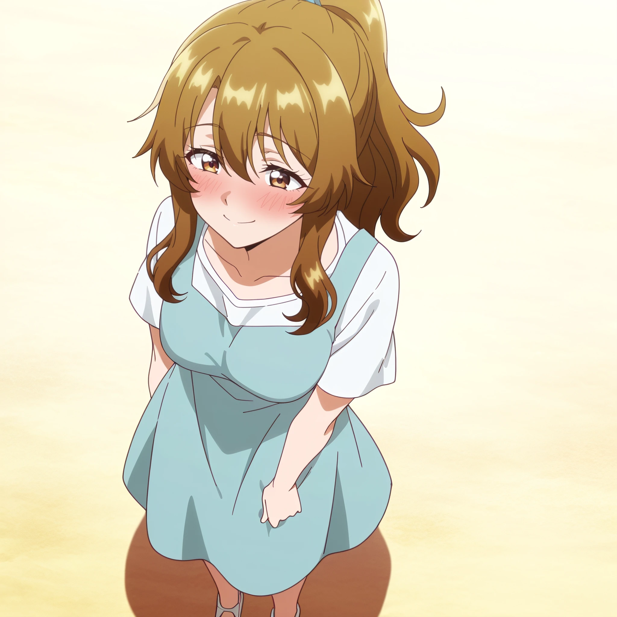 A4OSaineria, brown hair, long hair, brown eyes, ponytail, eyebrows visible through hair, bangs, hair between eyes, sidelocks,