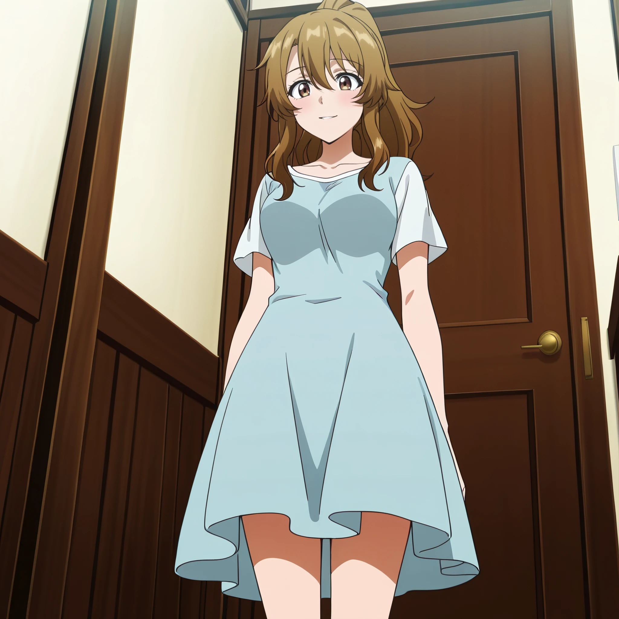 shirt, short sleeves, collarbone, white shirt, t-shirt, dress, blue dress,