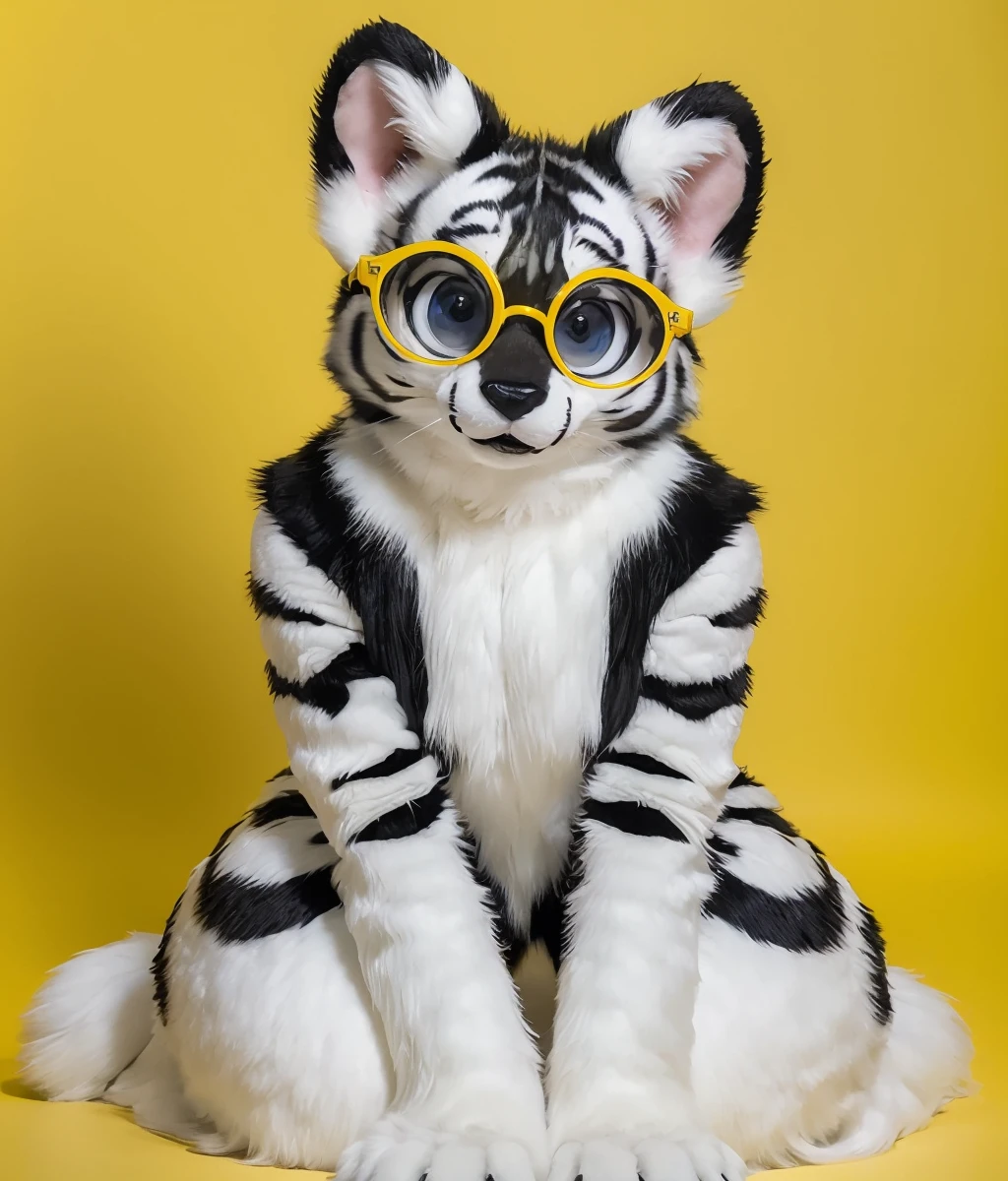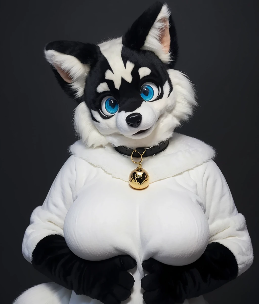 Tag:furry,big eyes,fur collar,paw gloves,large tail,fluffy,chuchumy,solo,no humans,cuteg,simple background,fursuit,Fursona,
