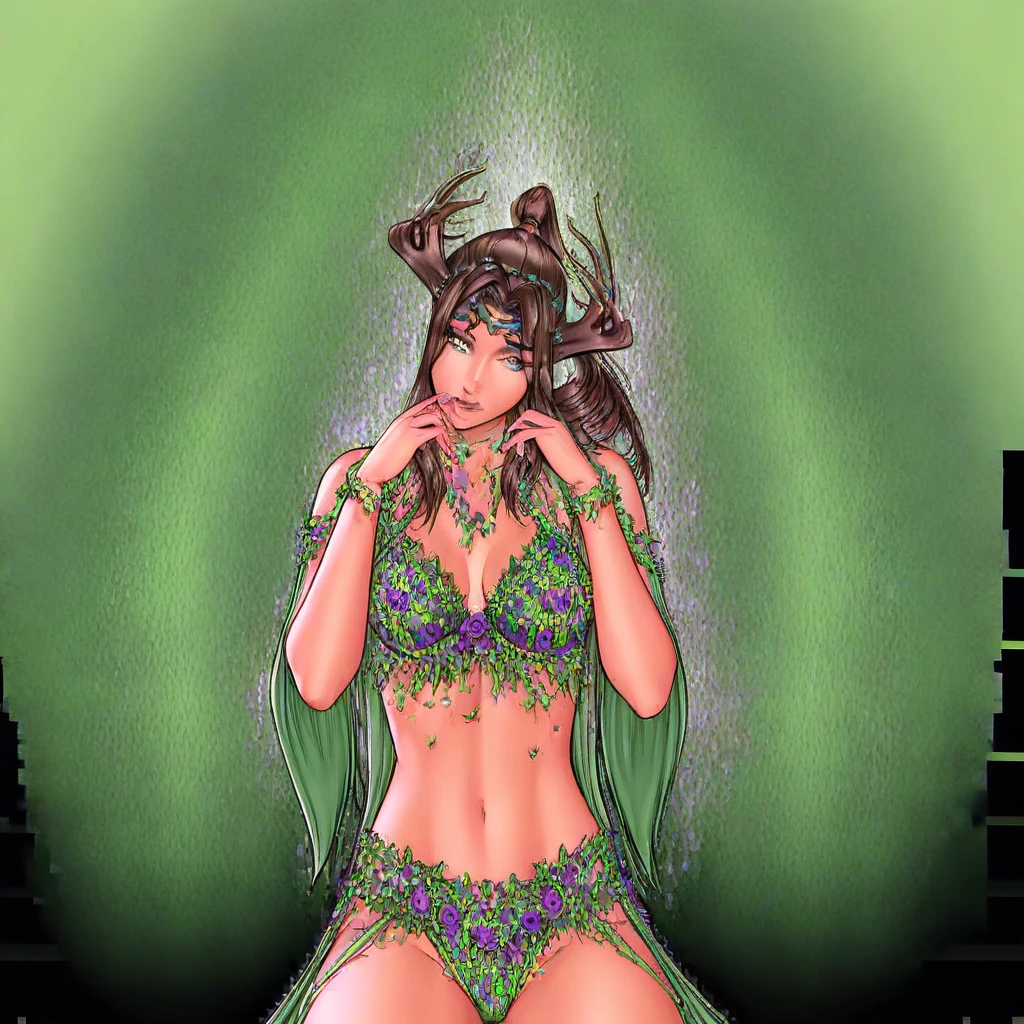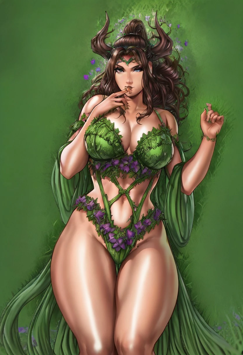1girl, selena, blue eyes, long hair, brown hair, green lingerie, purple flowers on lingerie, grass on lingerie, grass tiara, horn,