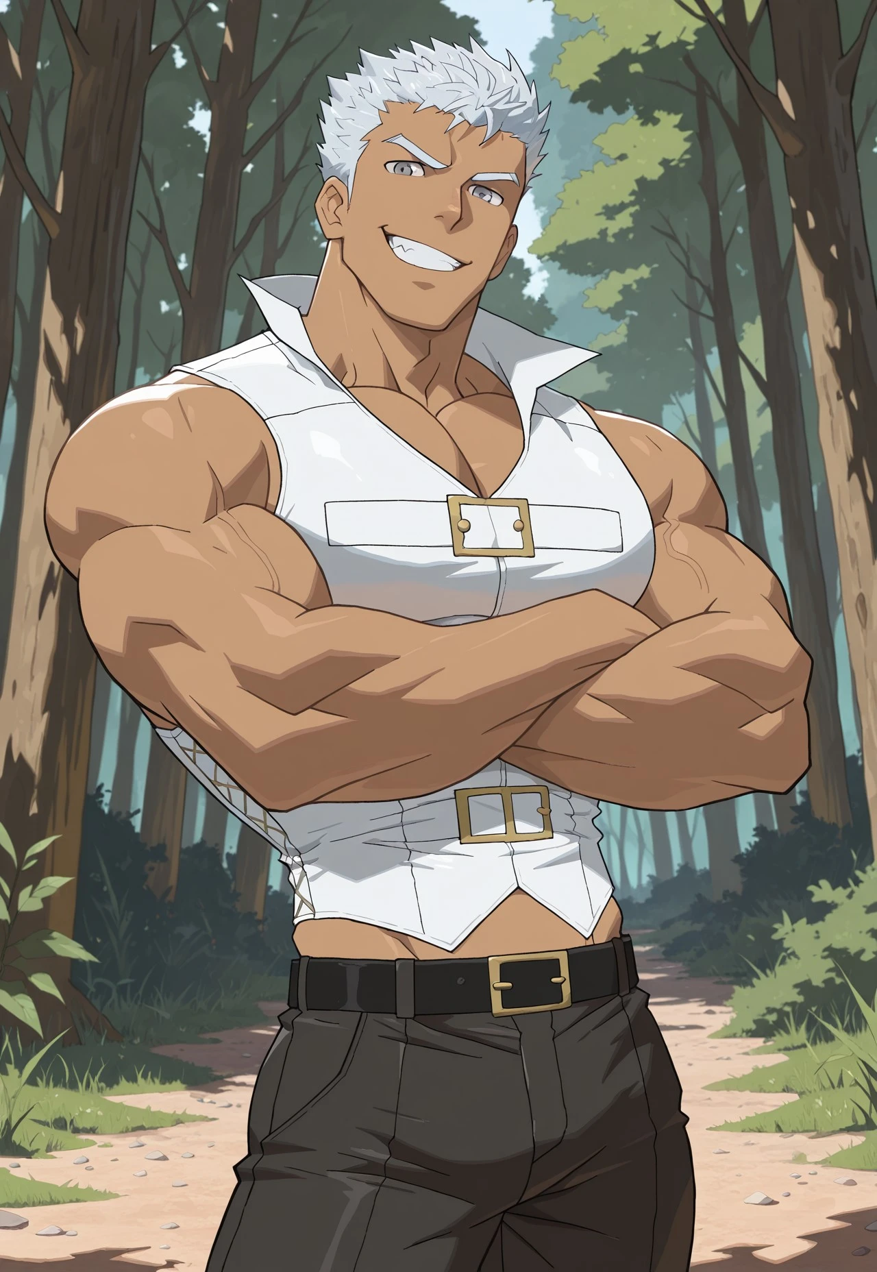 Loni, brown skin, white hair, grey eyes