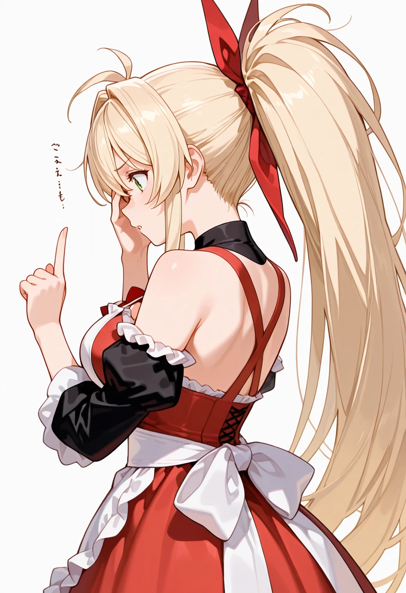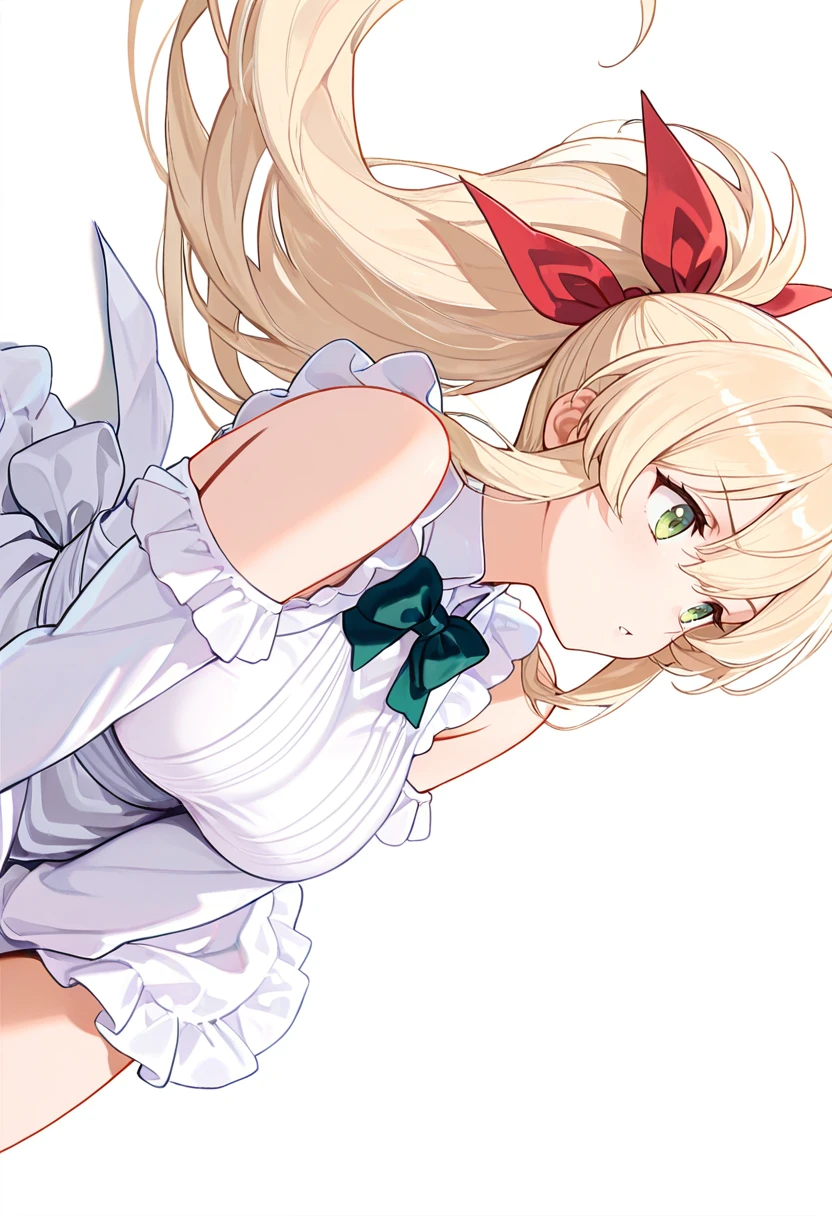 dress, frills, bowtie, ???? shoulders, apron, long sleeves, hair ribbon,