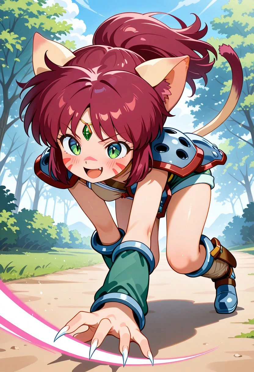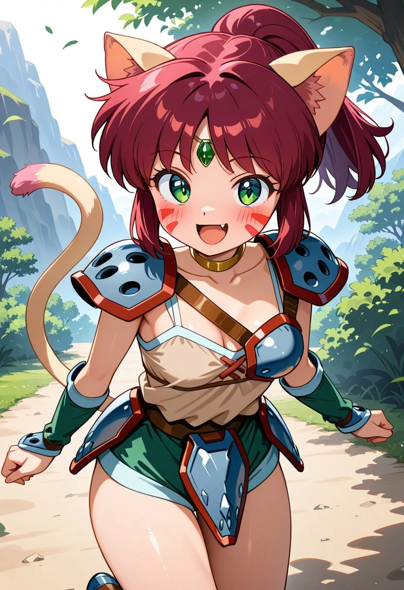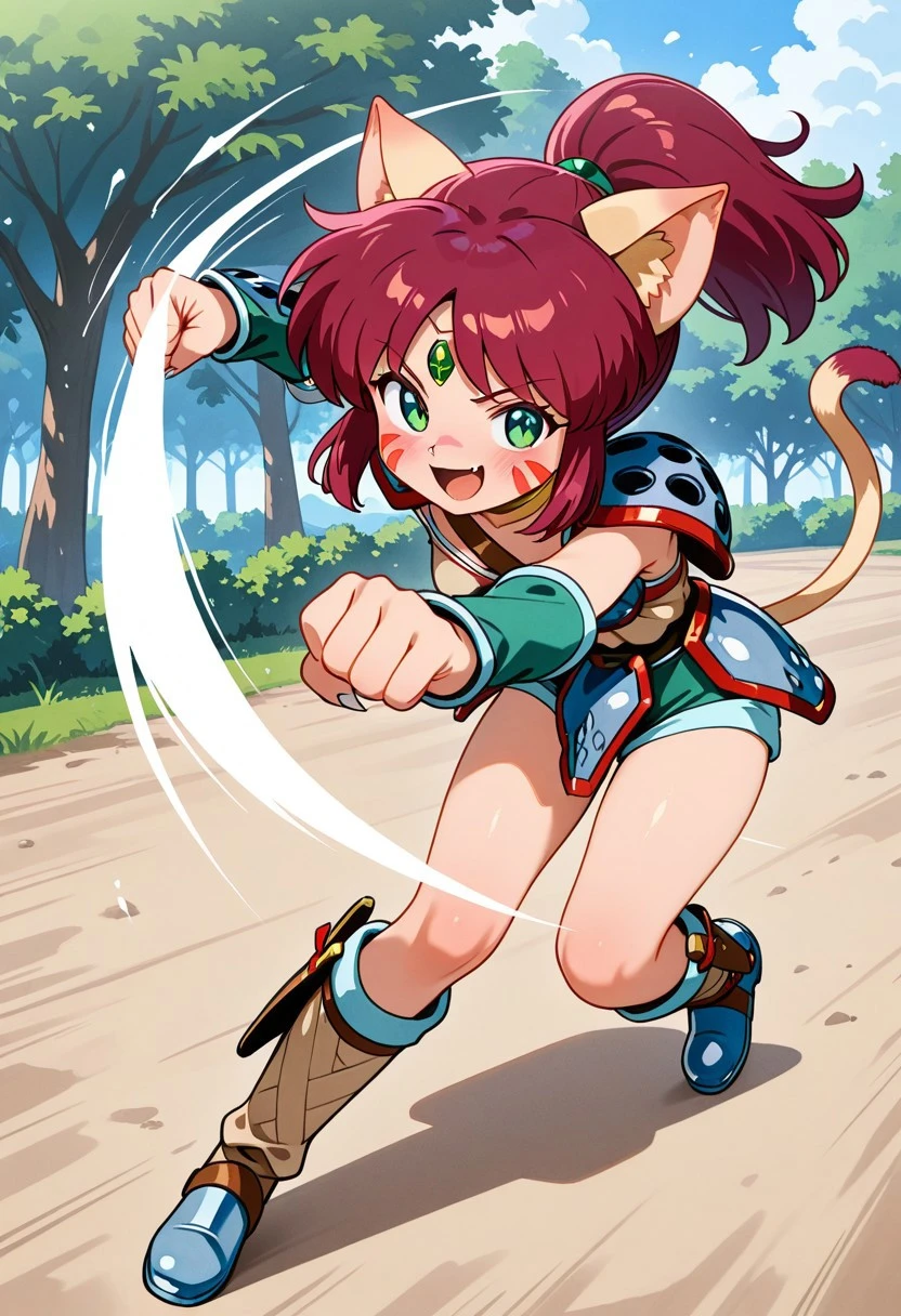 ryuquir (villgust),kouryuu densetsu villgust,facial mark,facepaint,whisker markings, choker,short hair,dark red hair,green eyes,tail,animal ears,armor, shoulder armor, pauldrons, bracer,underwear, shorts,cat ears,cat tail,ponytail, breasts,Footwear, boots,