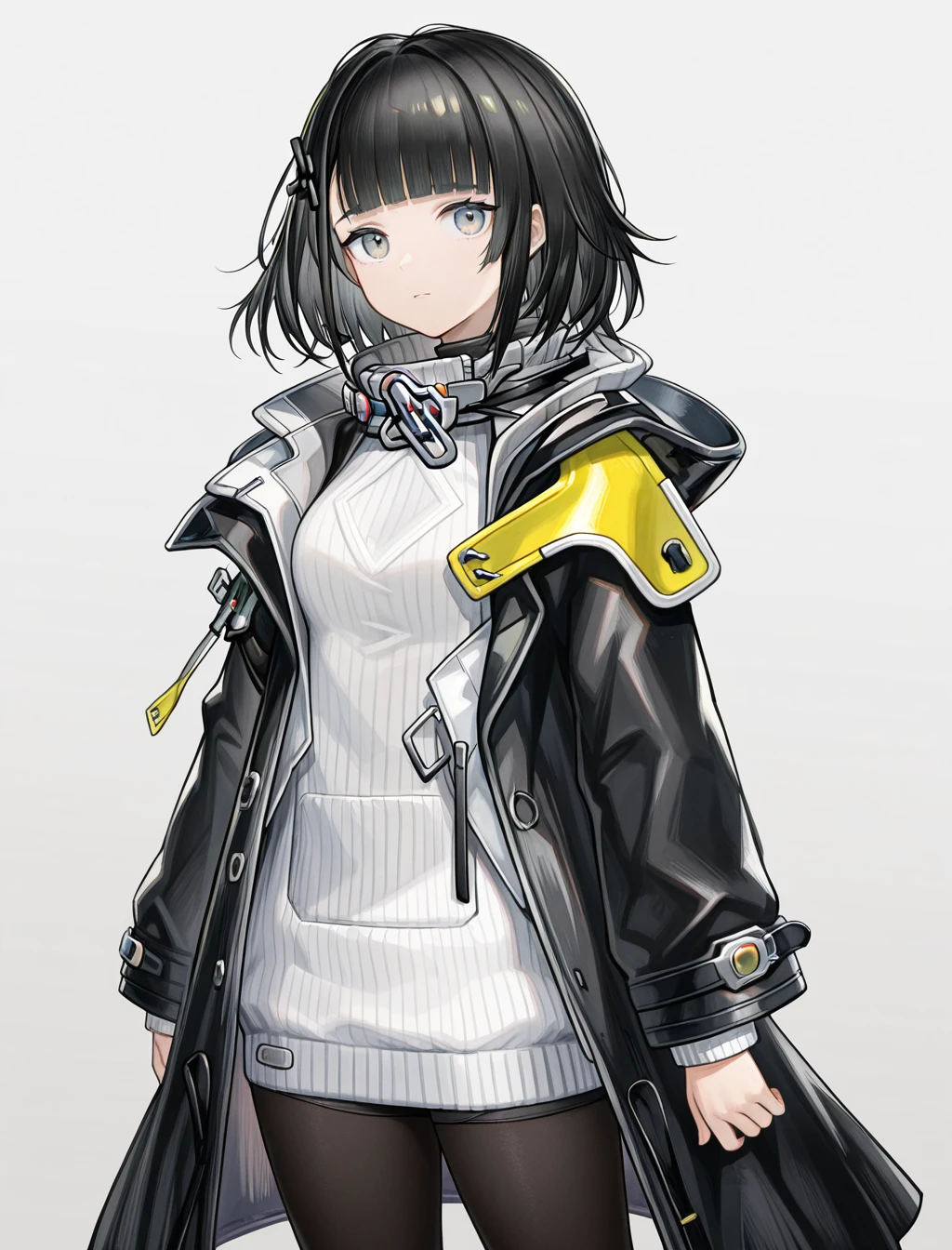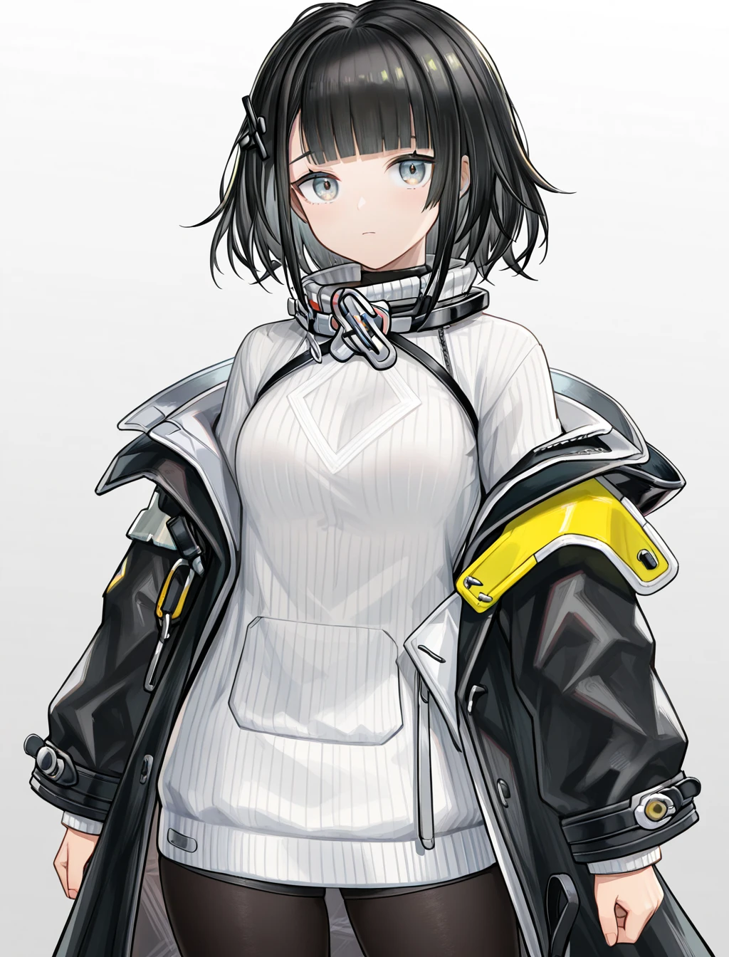 black jacket, white sweater,pantyhose,