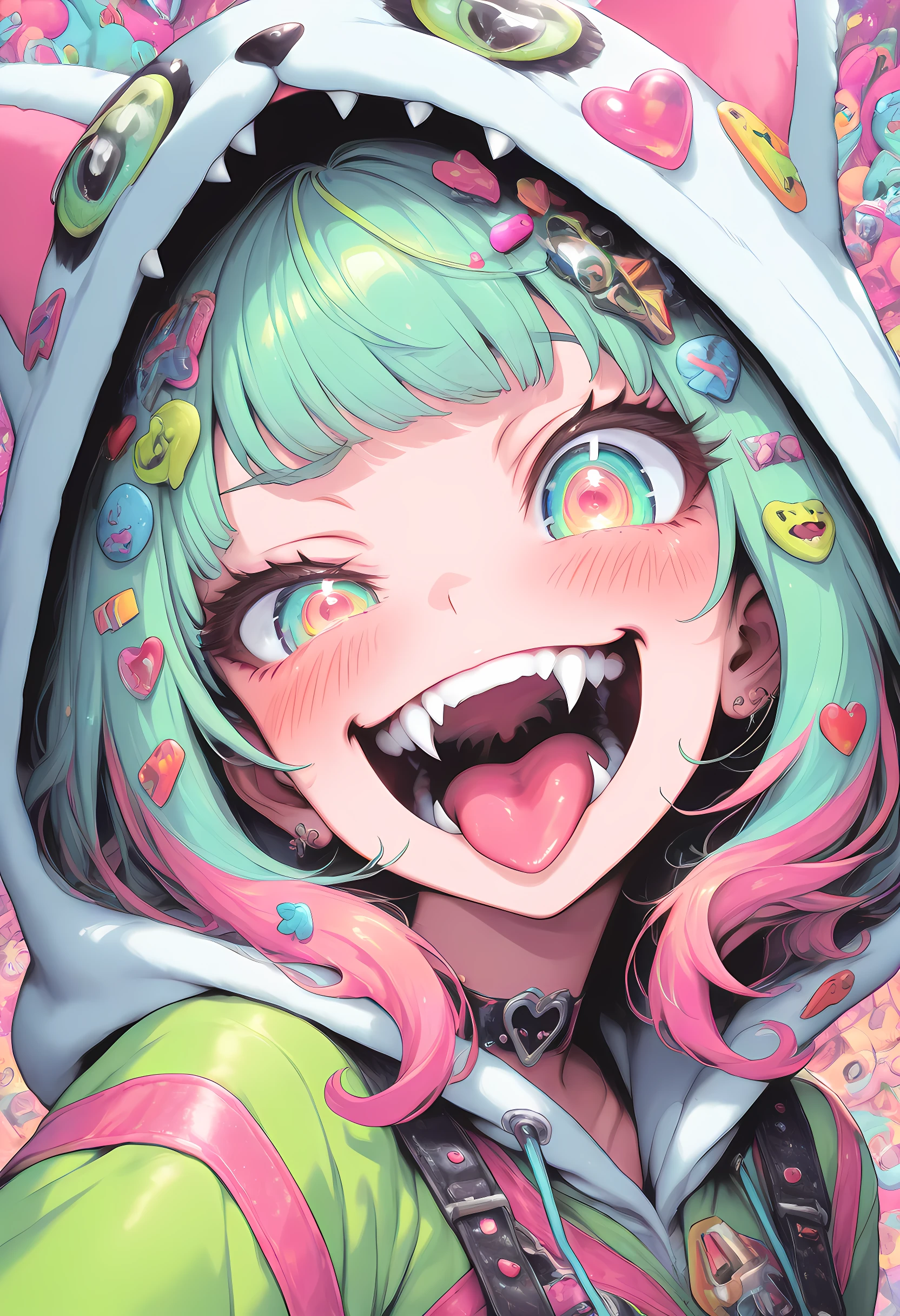 crazy smile, fangs, crazy decorations, crazy background, crazy eyes, hypnotic eyes, sharp teeth, monster helmet, kaleidoscope background