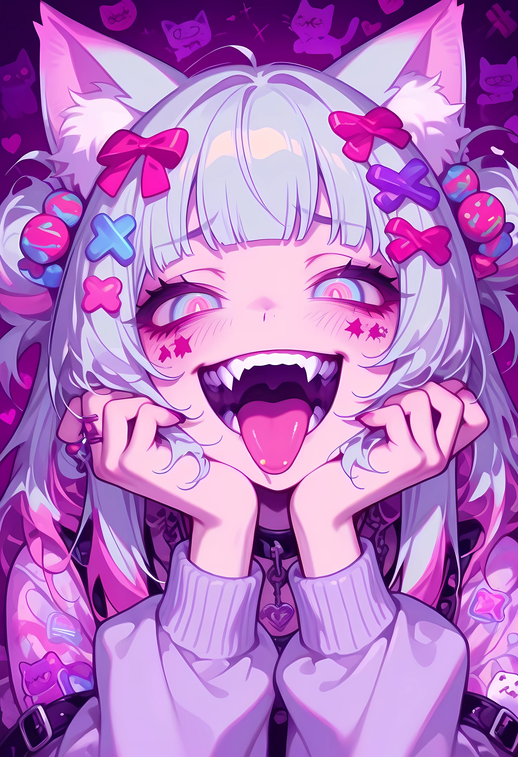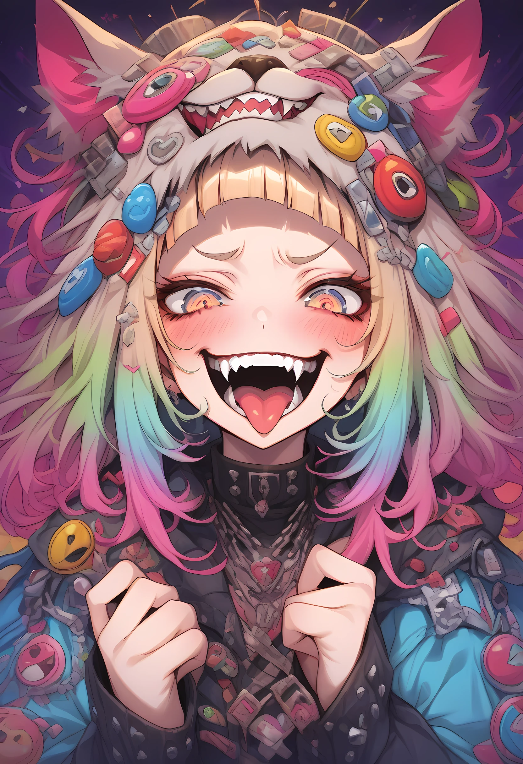 crazy smile, fangs, open mouth