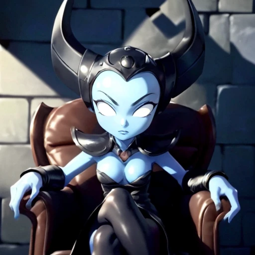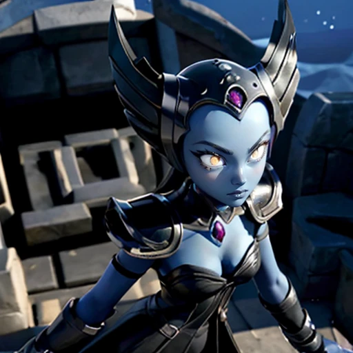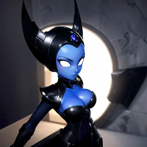 1girl, Hex, blue skin, colored skin, white eyes, no pupils, black dress, armored dress, forehead jewel, helmet,