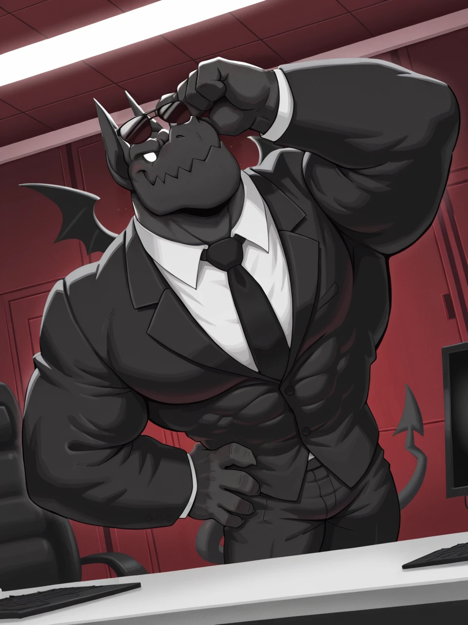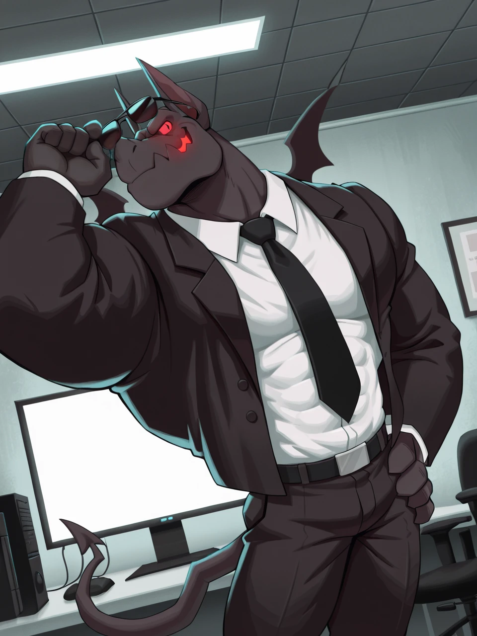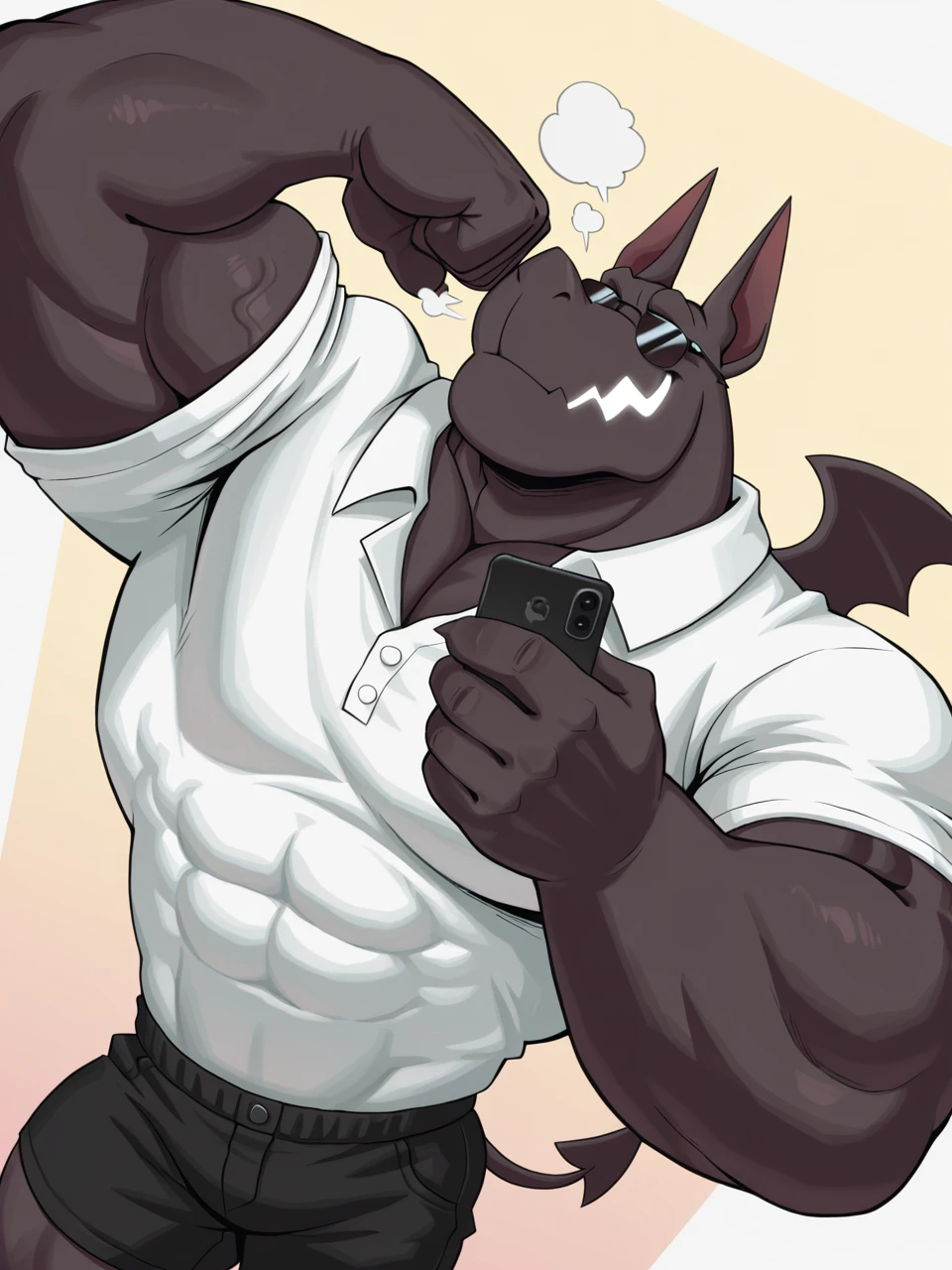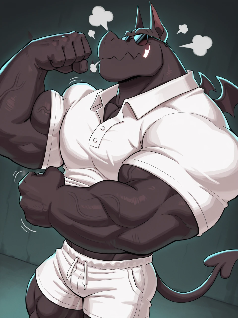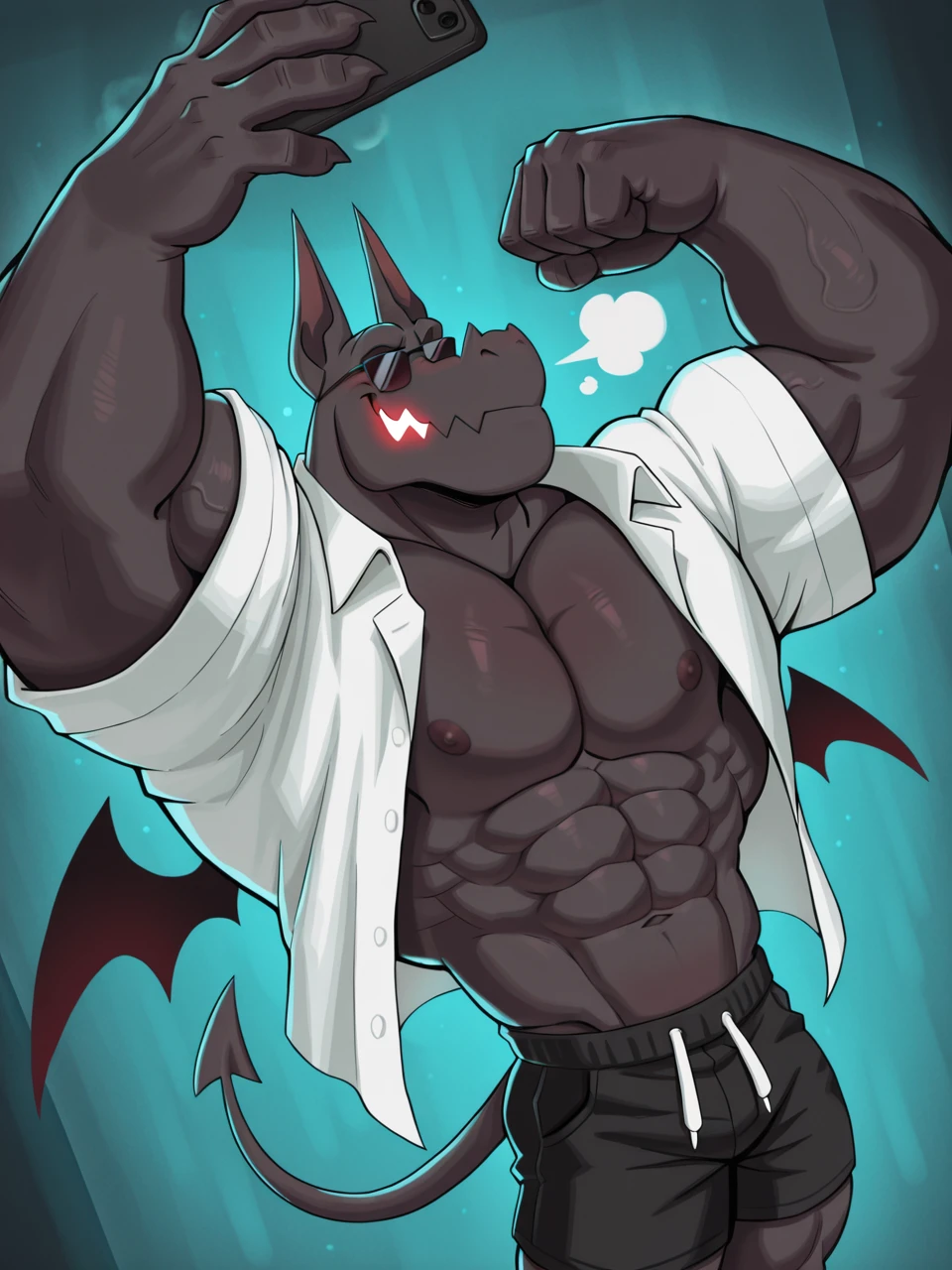 muscular male, gargoyle boy, tiny wings, shorts, white eyes, no pupils, jagged jaws, glowing mouth, black body, business attire, ear phones, sunglasses, BR4D,