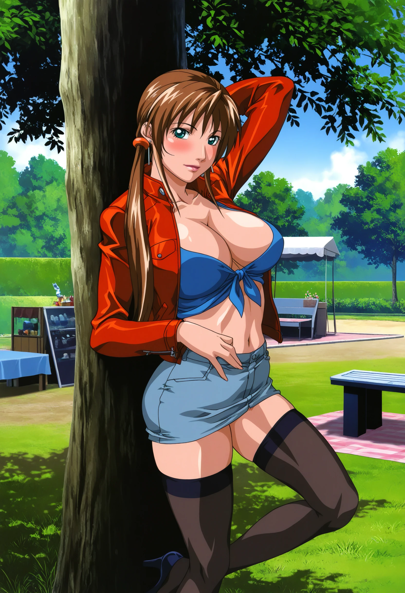 front-tie top, red jacket, denim miniskirt, miniskirt, black thighhighs,