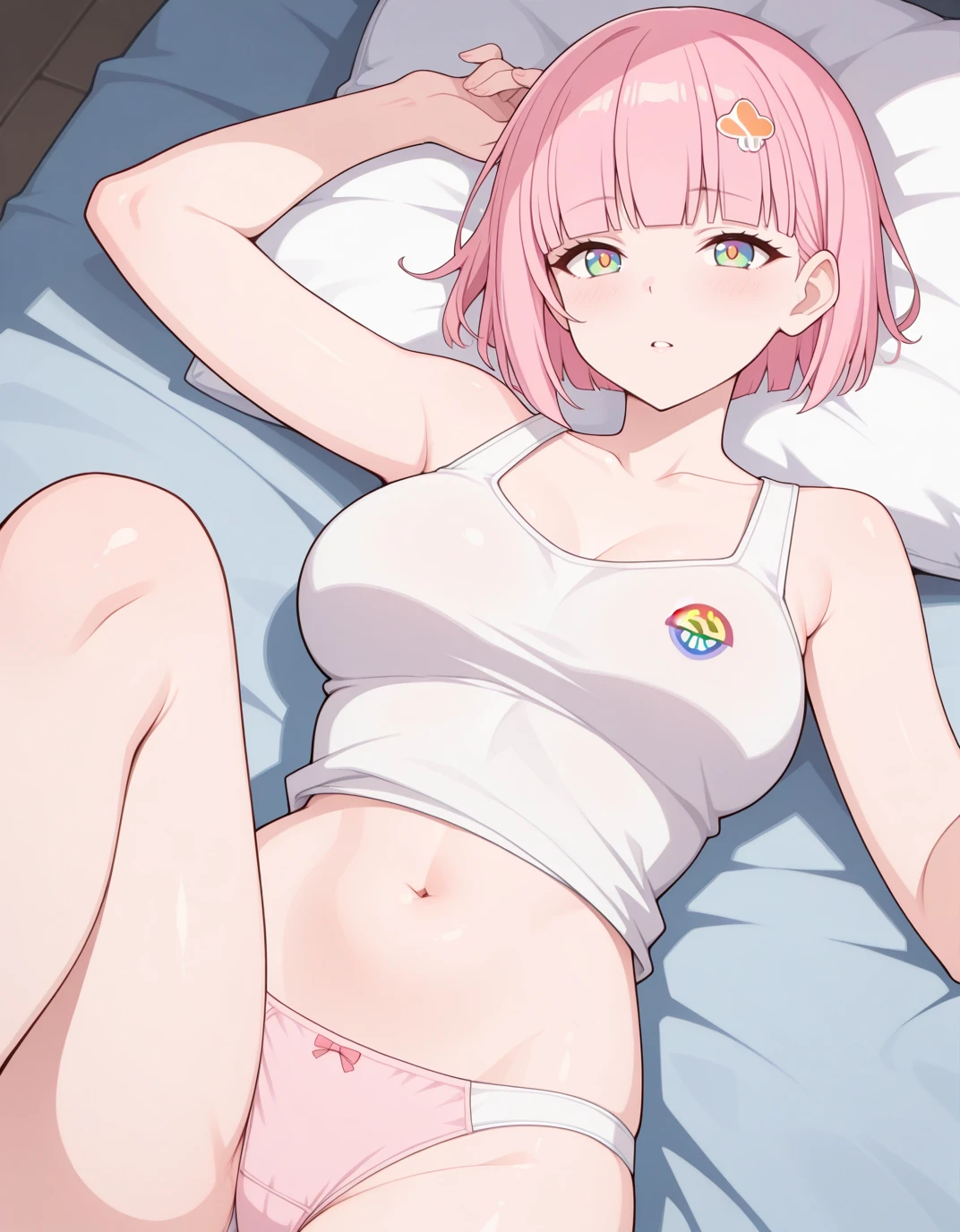 multicolored eyes, green eyes, blue eyes, blunt bangs, Pink hair, short hair, asymmetrical bangs, hair ornament, hairclip,Outfit: