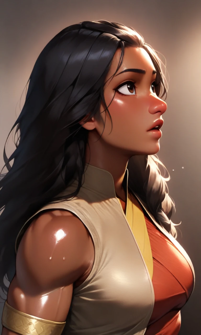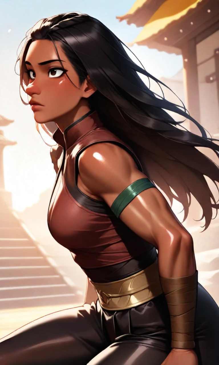 Raya, Chinese, female, dark skin, black hair, long hair, toned, brown eyes, narrow eyes, snub-nose, arm band, brown wrist_wraps, salakot,