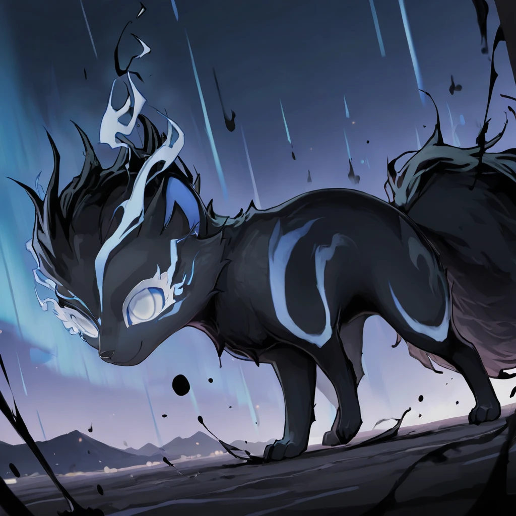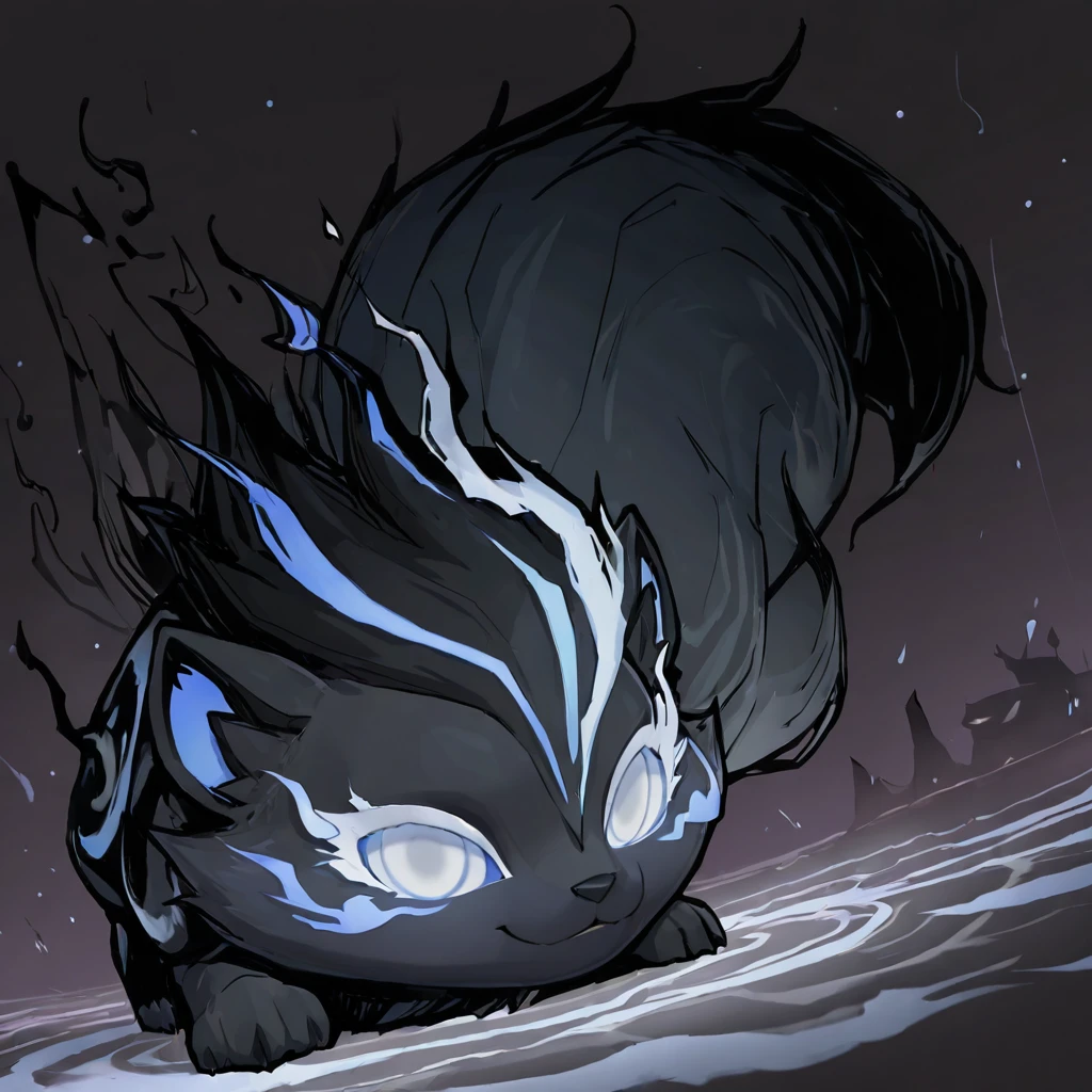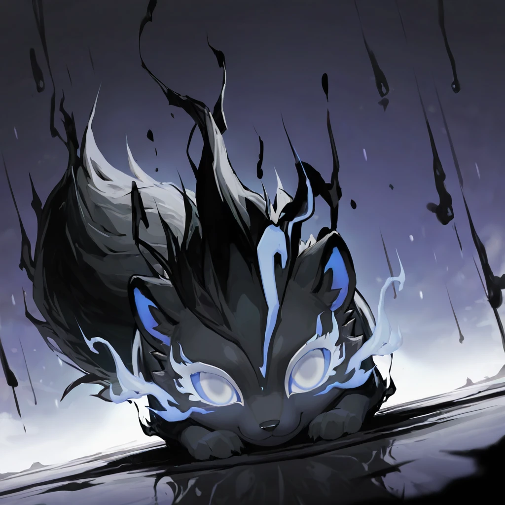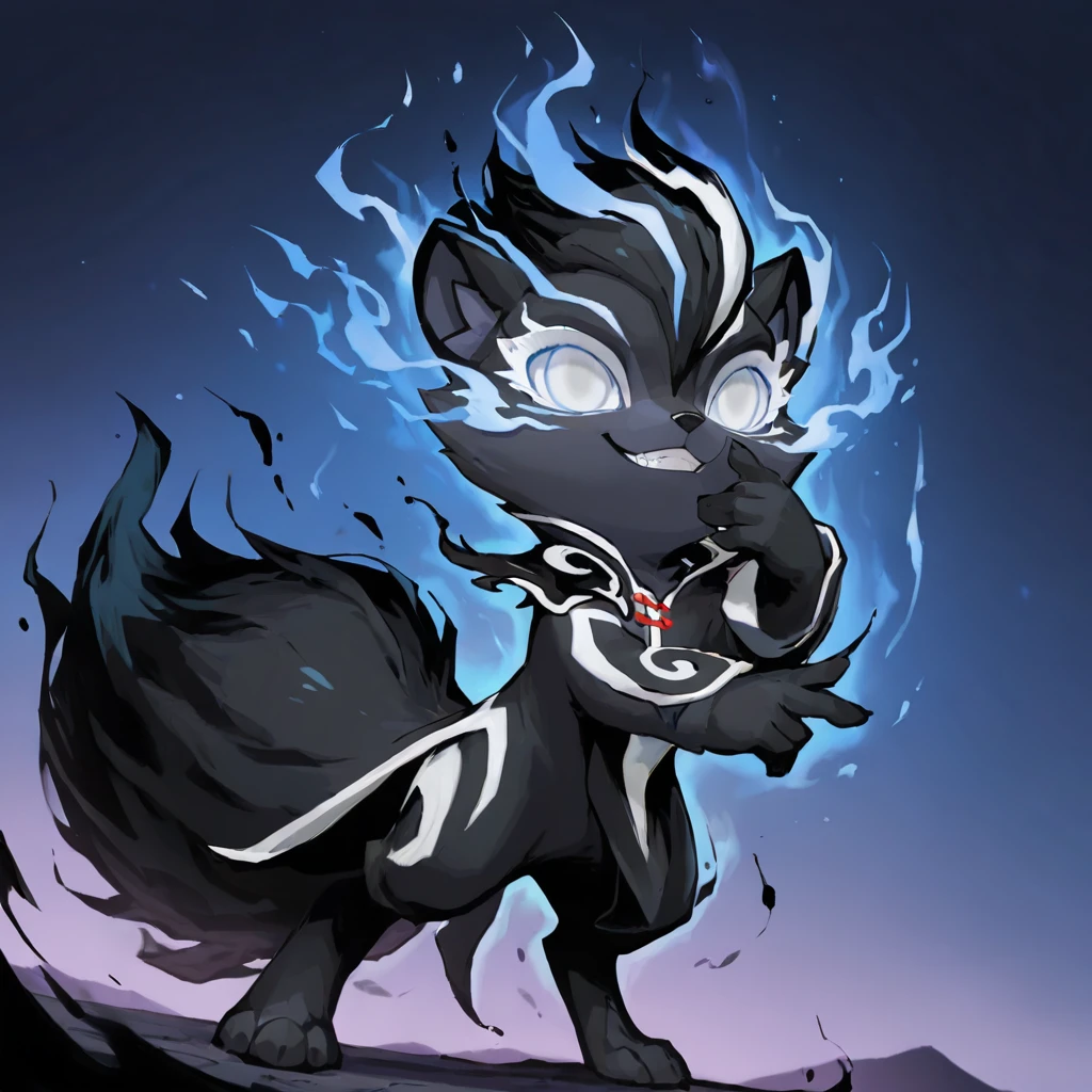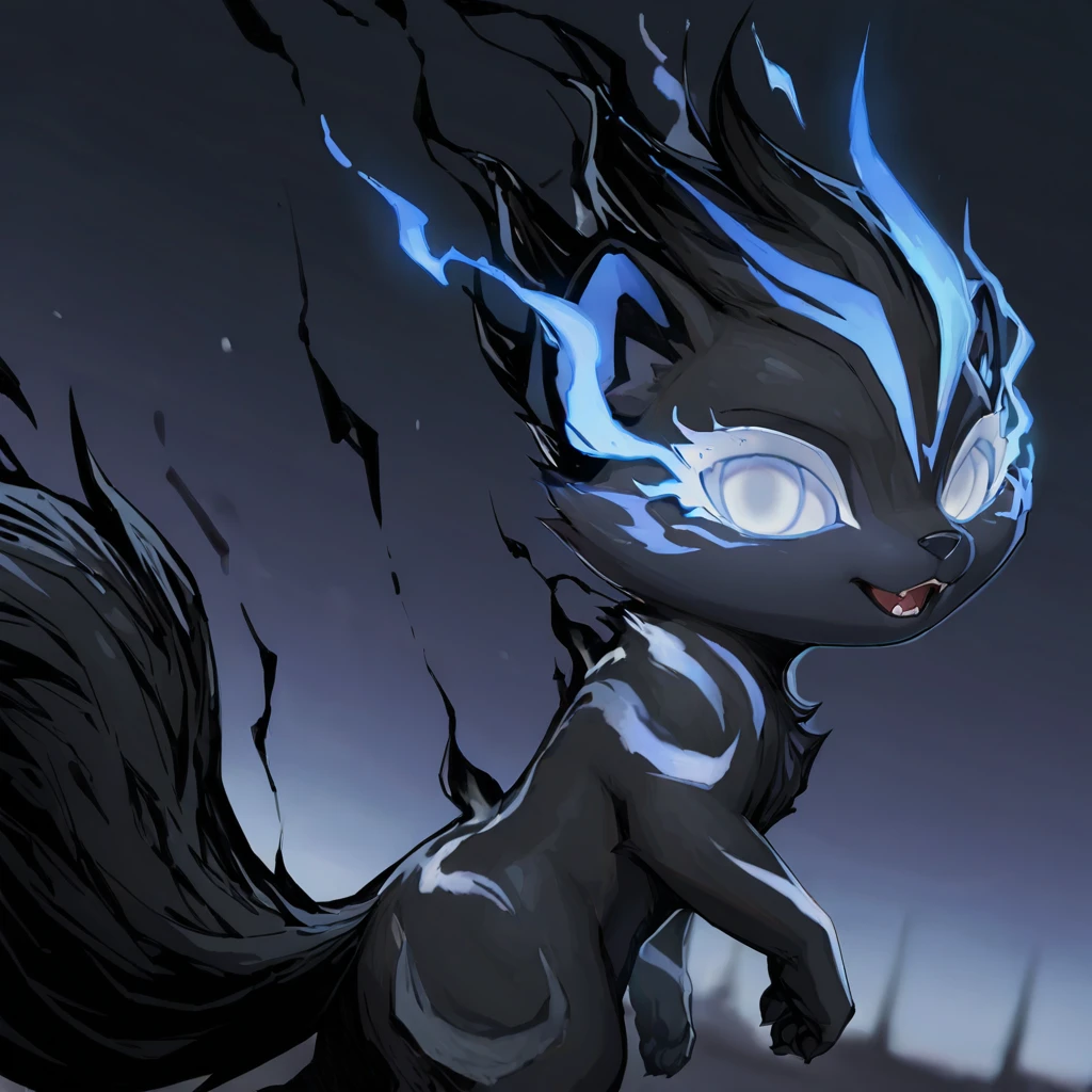 InkMoT, creature, dark grey fur, blue fire, white eyes, fluffy tail,