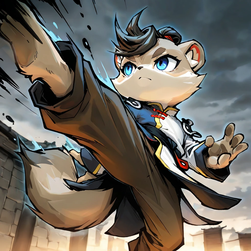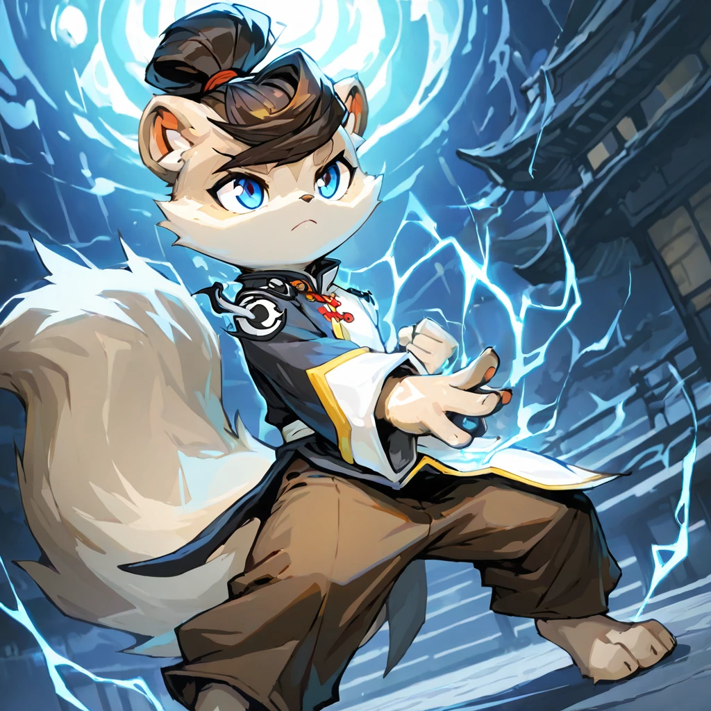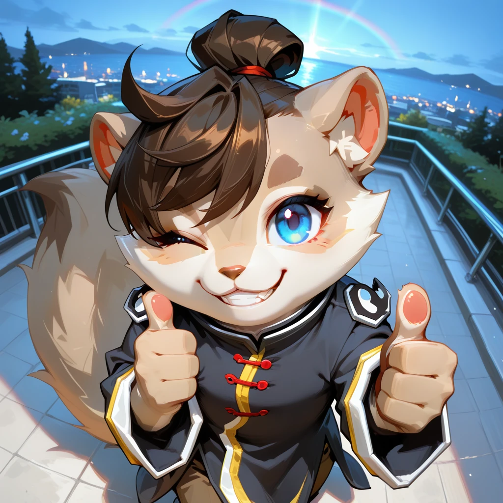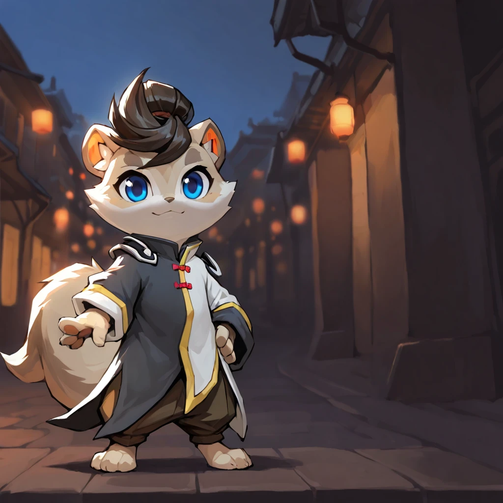 MomoGR, furry, male, tan fur, brown hair, topknot, blue eyes, tail, coat, brown pants,
