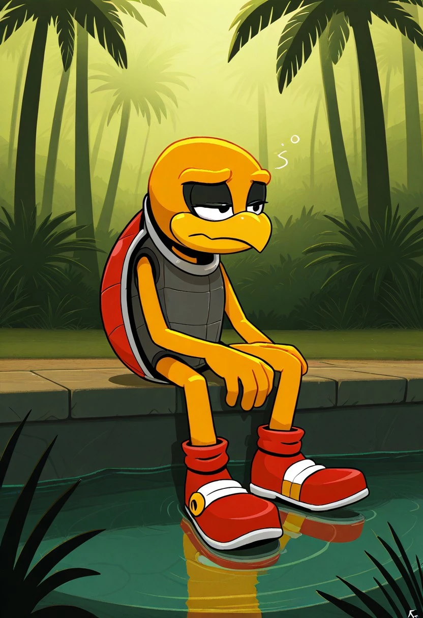 Boomer the Turtle, bald, yellow skin, yellow turtle beak, black eyes, red shell, red shoes