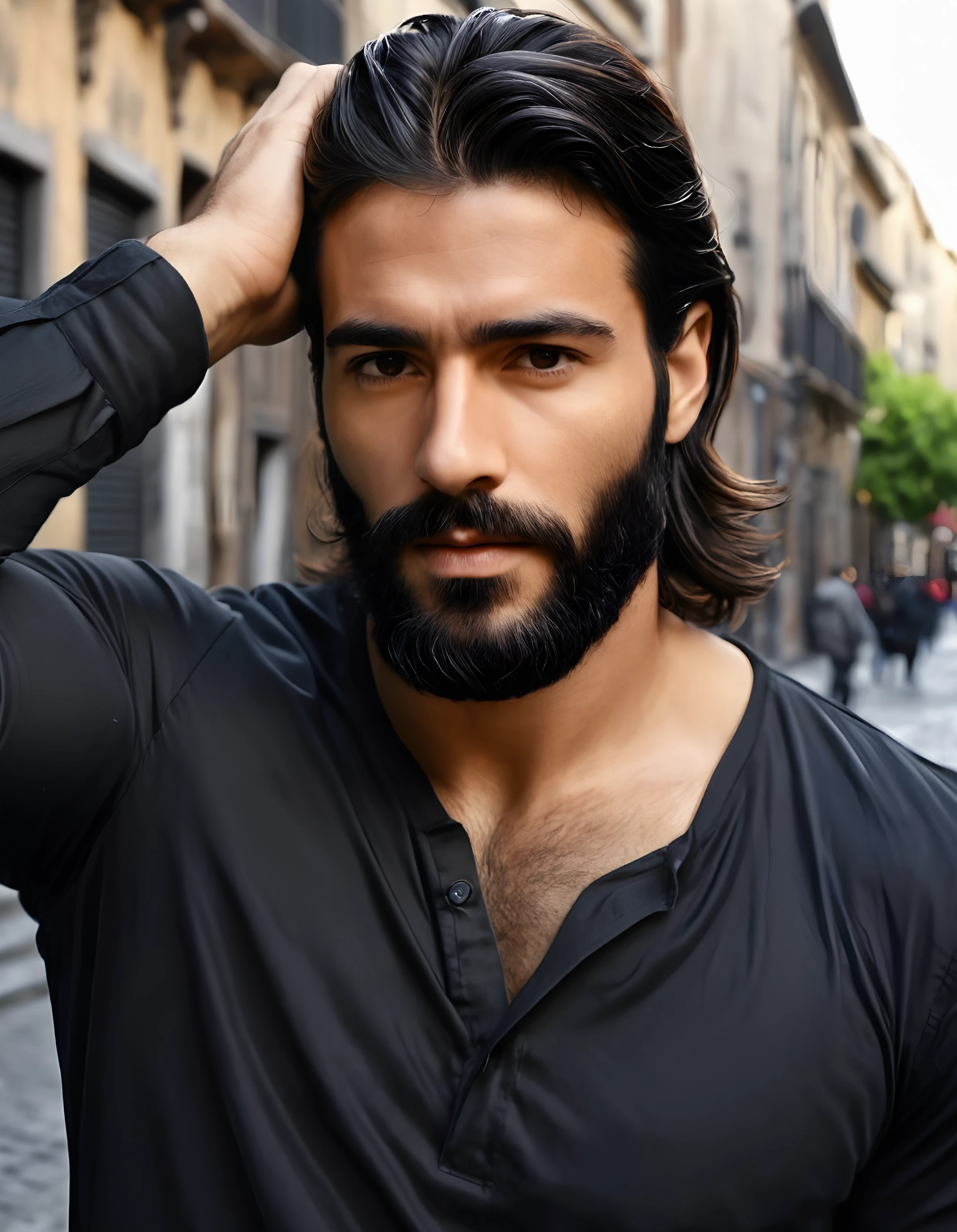 pierre_blanc, 1boy, dark brown eyes, beard, black hair,If you want him with long hair, write (otherwise he might come out with short hair)