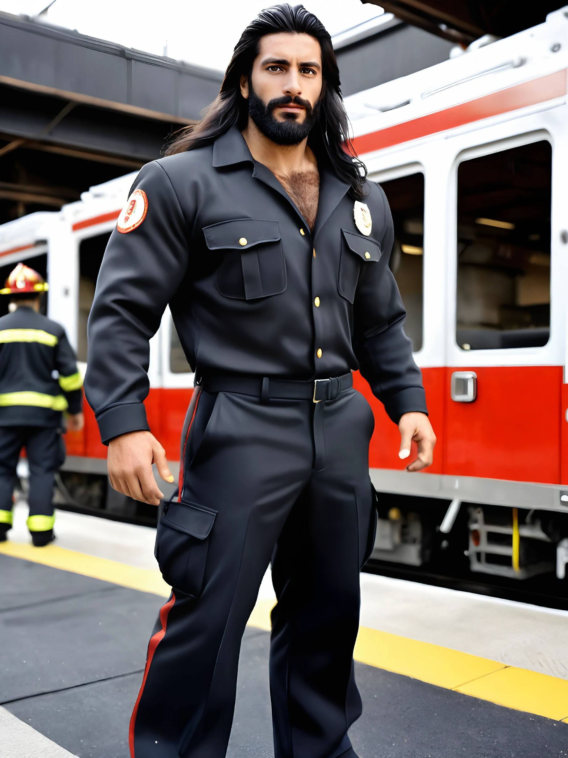 Pierre Blanc, a French boy, masculine, hairy, with a beard and long hair. He is a firefighter.