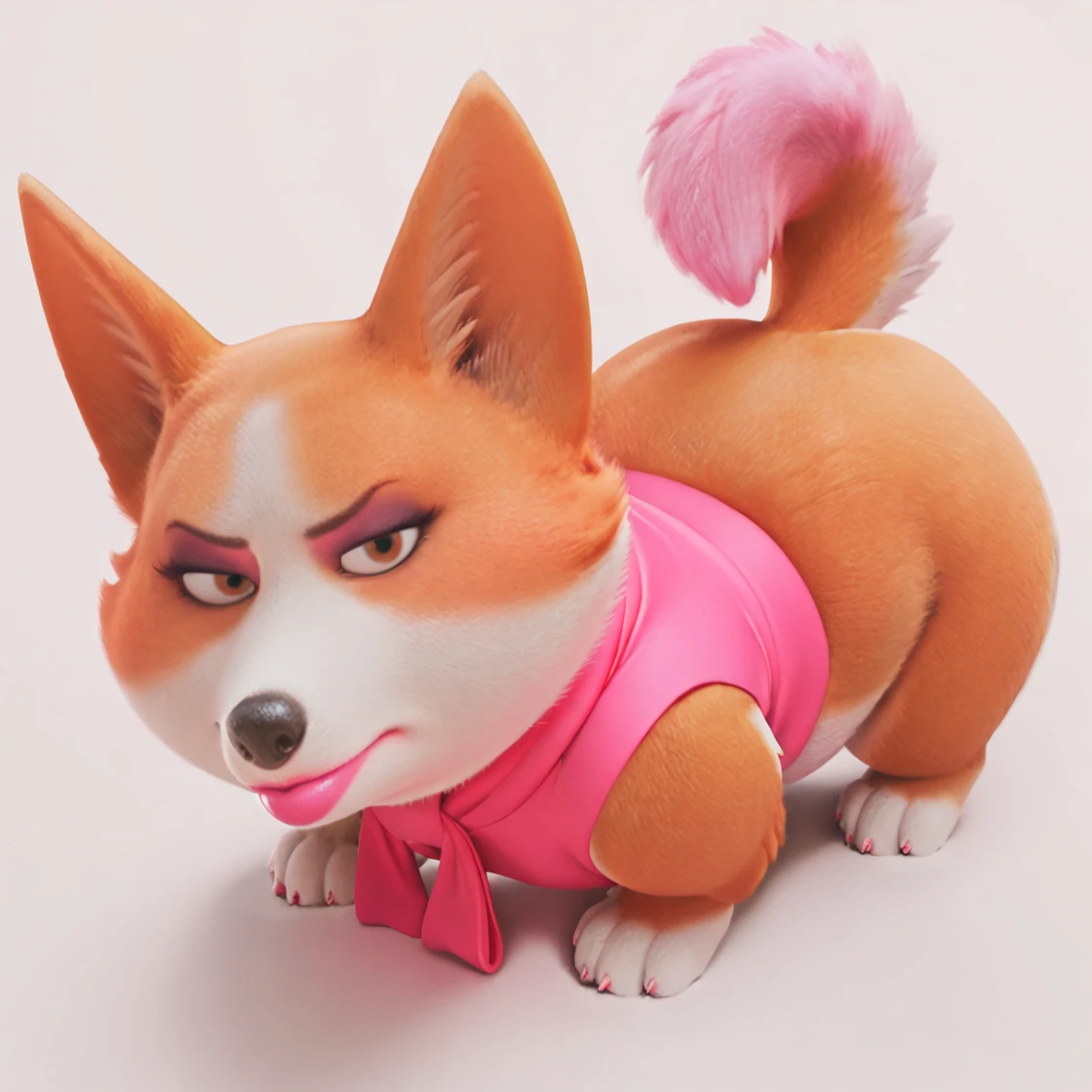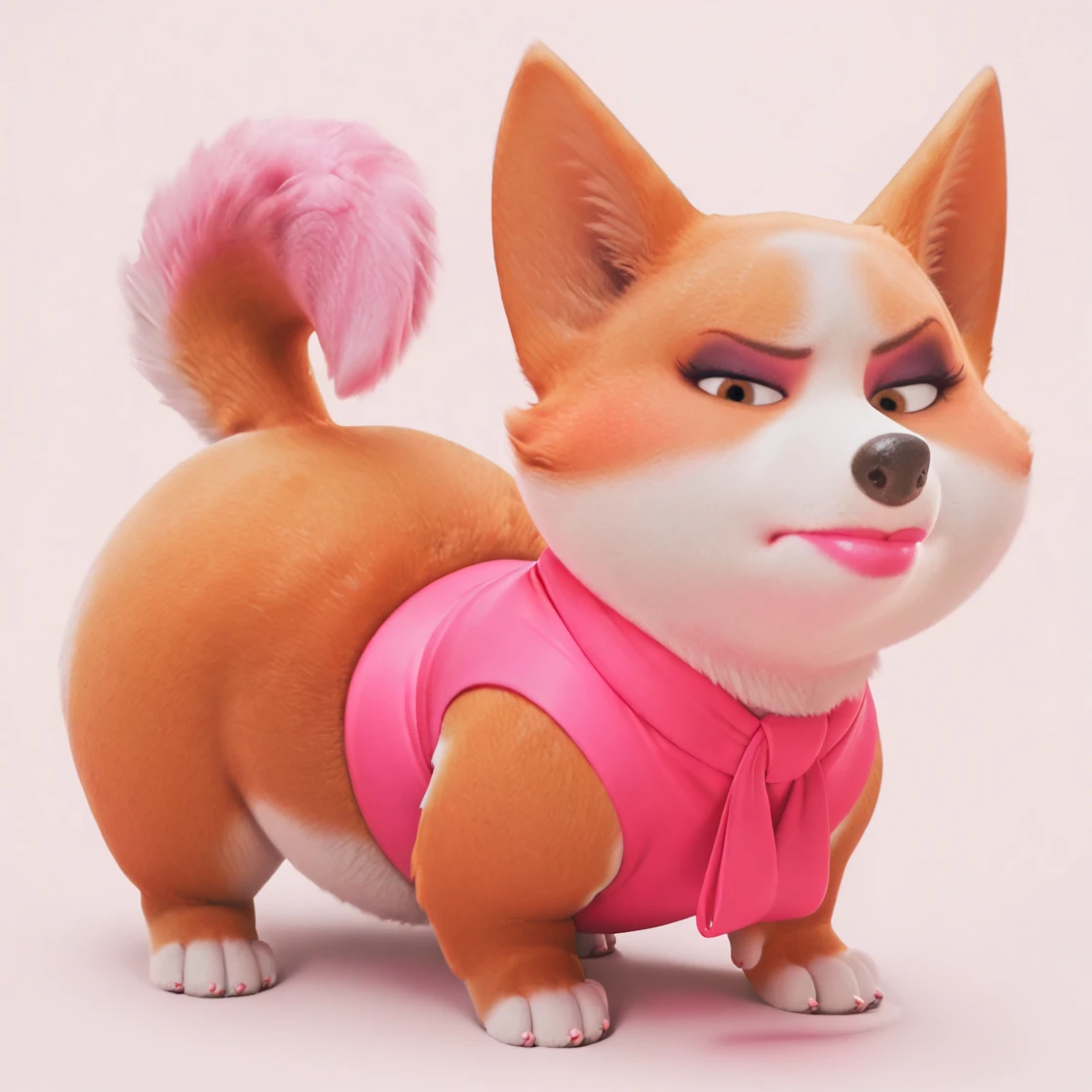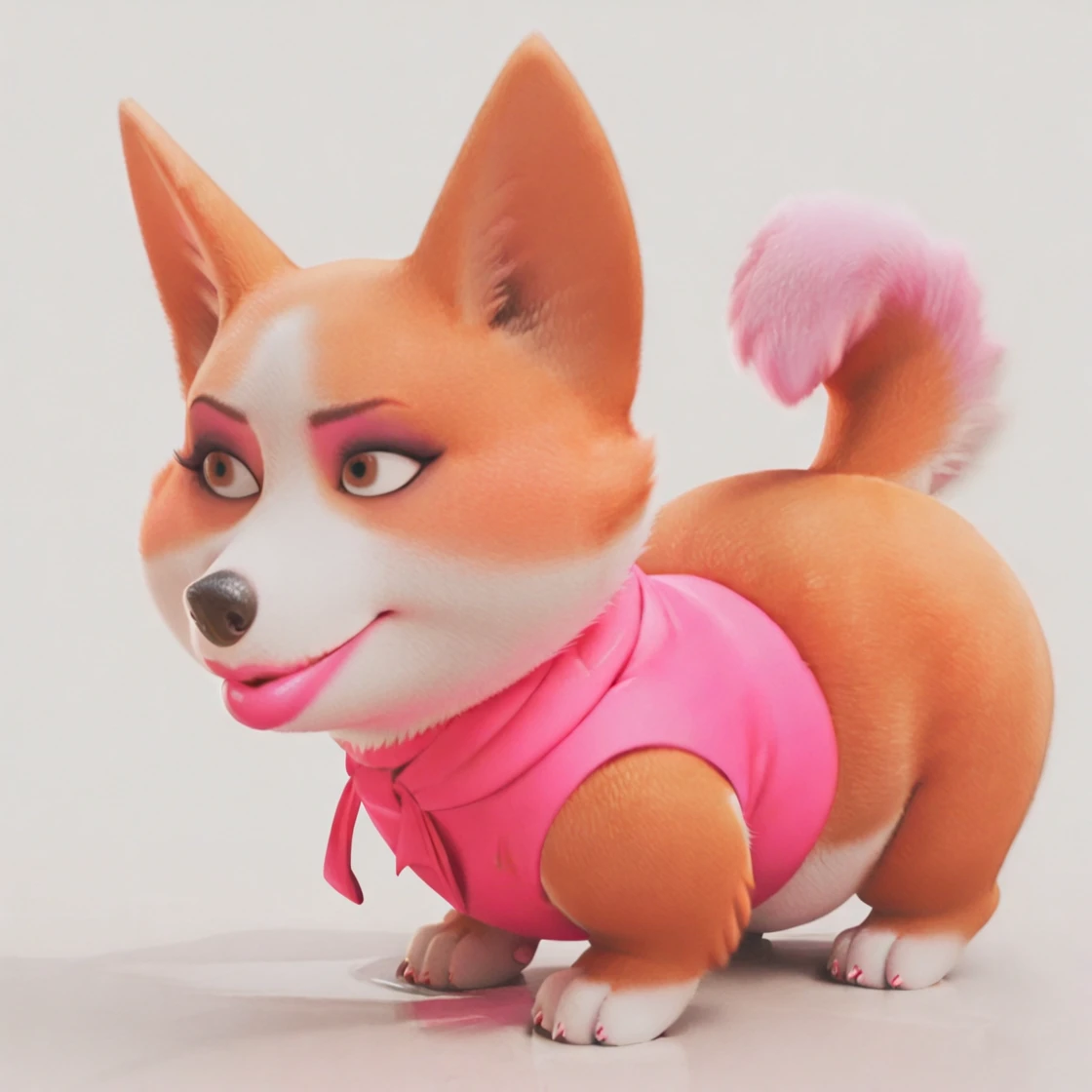 dog, female, slightly chubby, bottom-heavy, corgi, orange fur, white fur, pink tail highlights, pink eyeshadow
