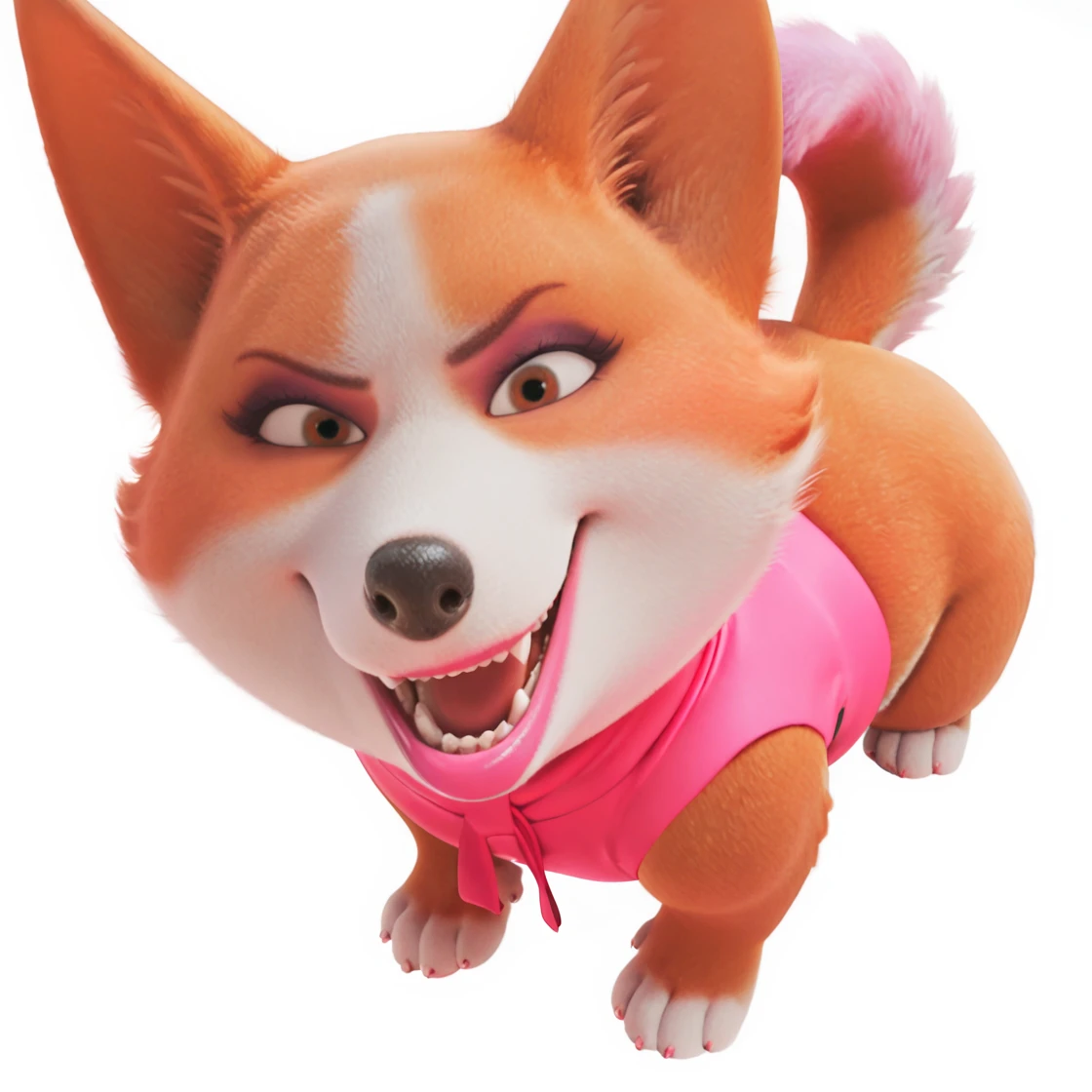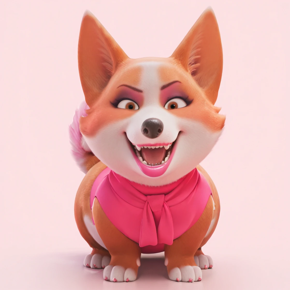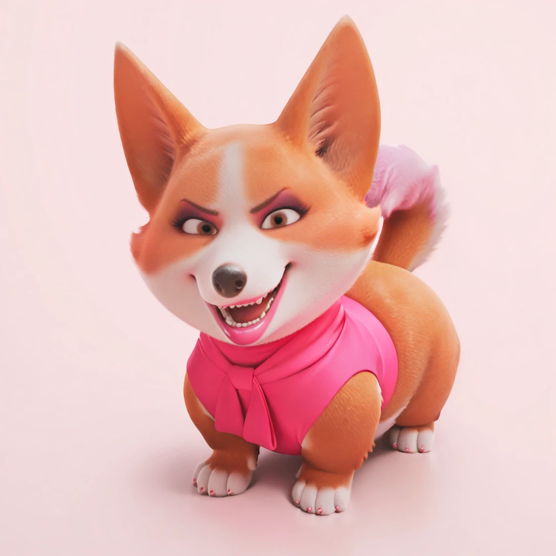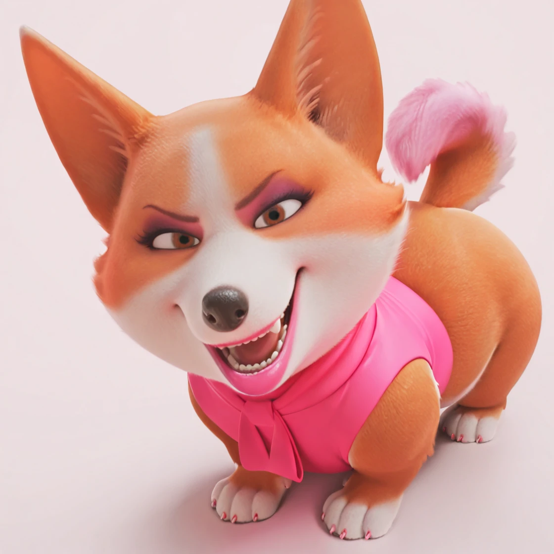 dog, female, slightly chubby, bottom-heavy, corgi, orange fur, white fur, pink tail highlights, pink eyeshadow