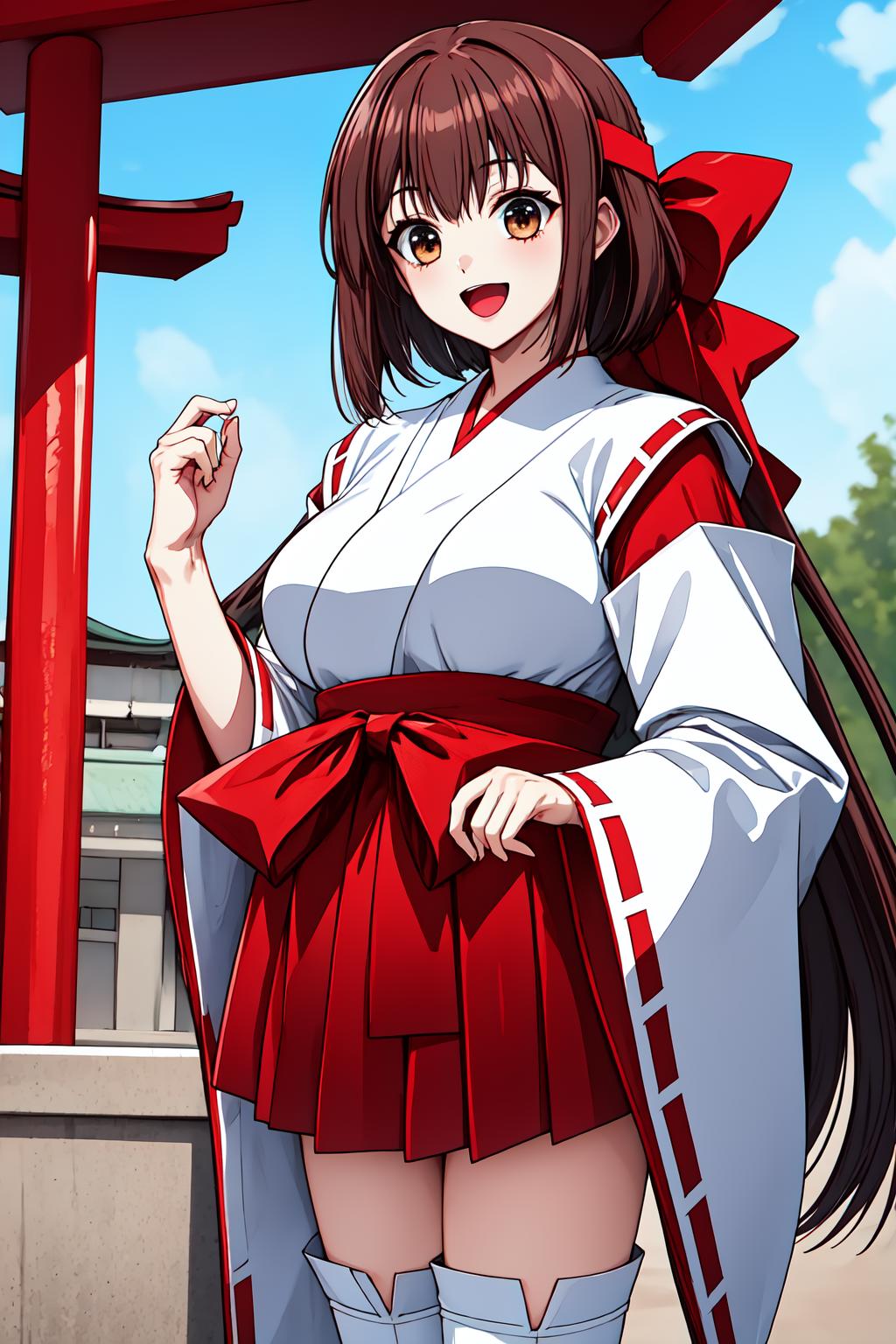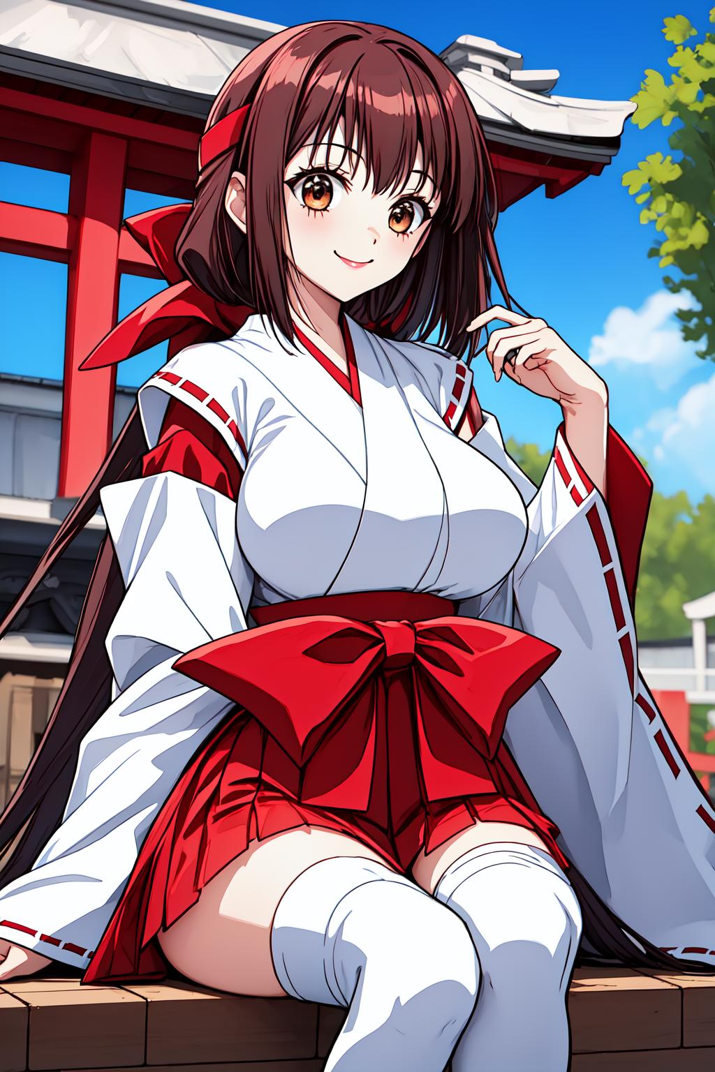 costume: red hair ribbon, headband, bow, japanese clothes, skirt, red hakama, hakama skirt, white thighhighs,