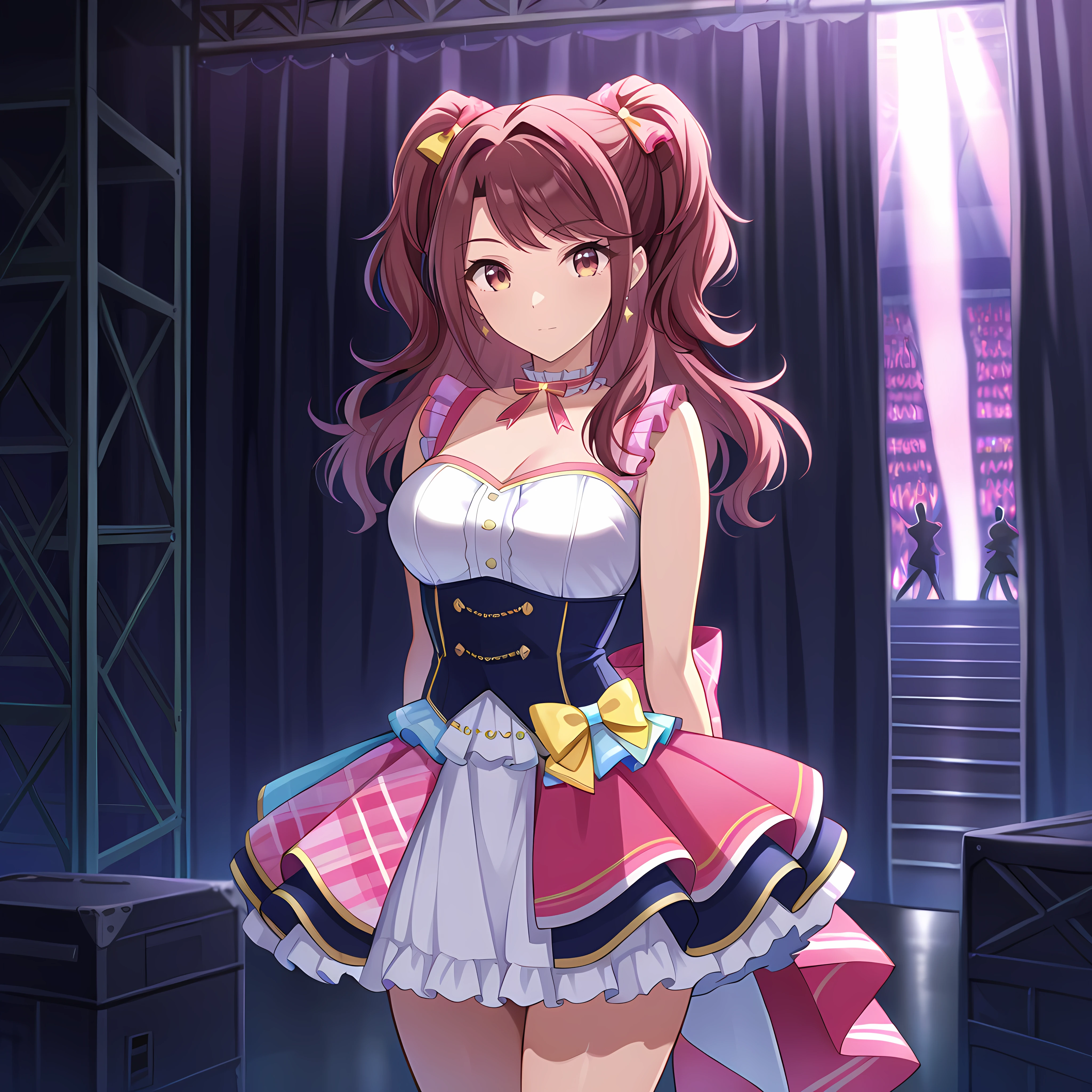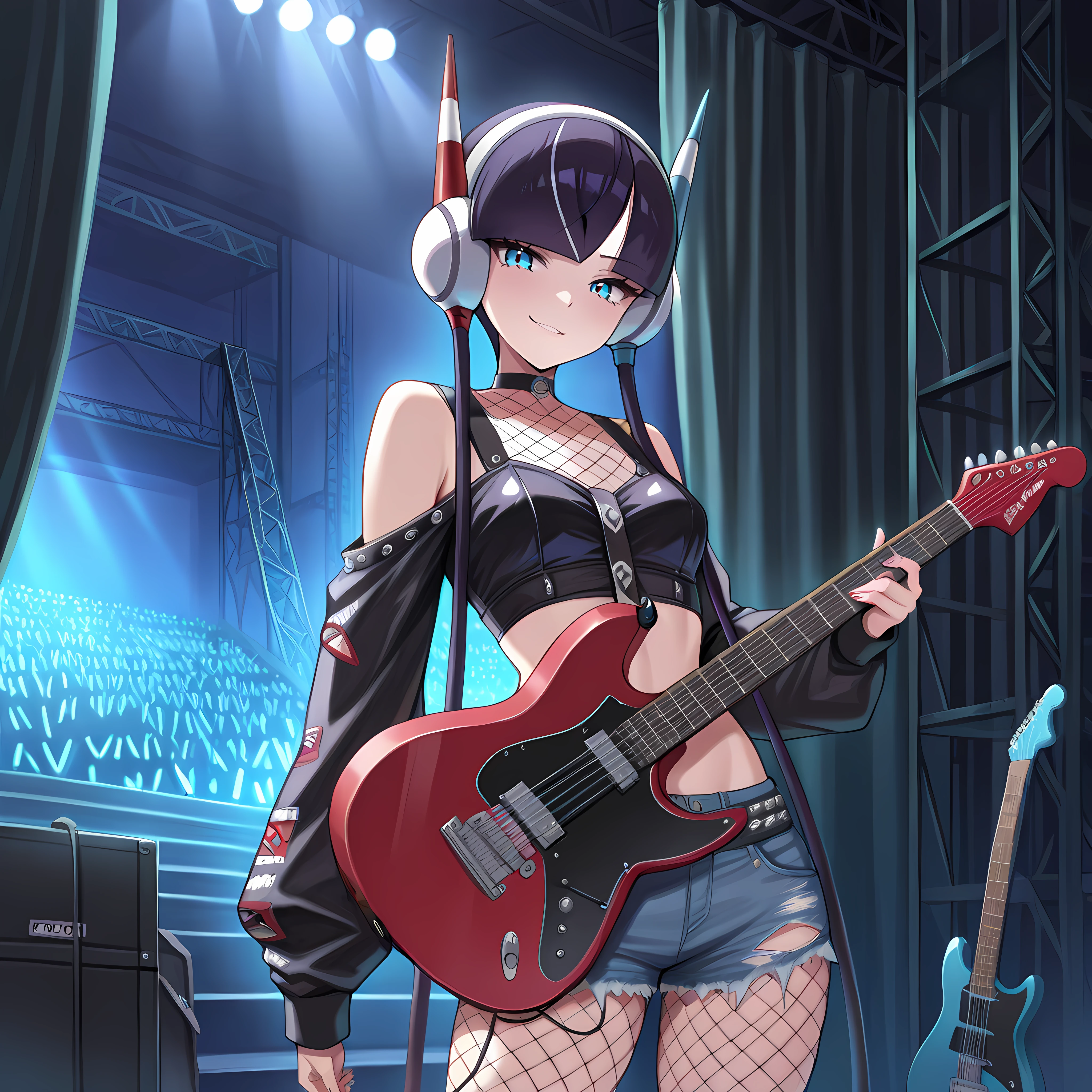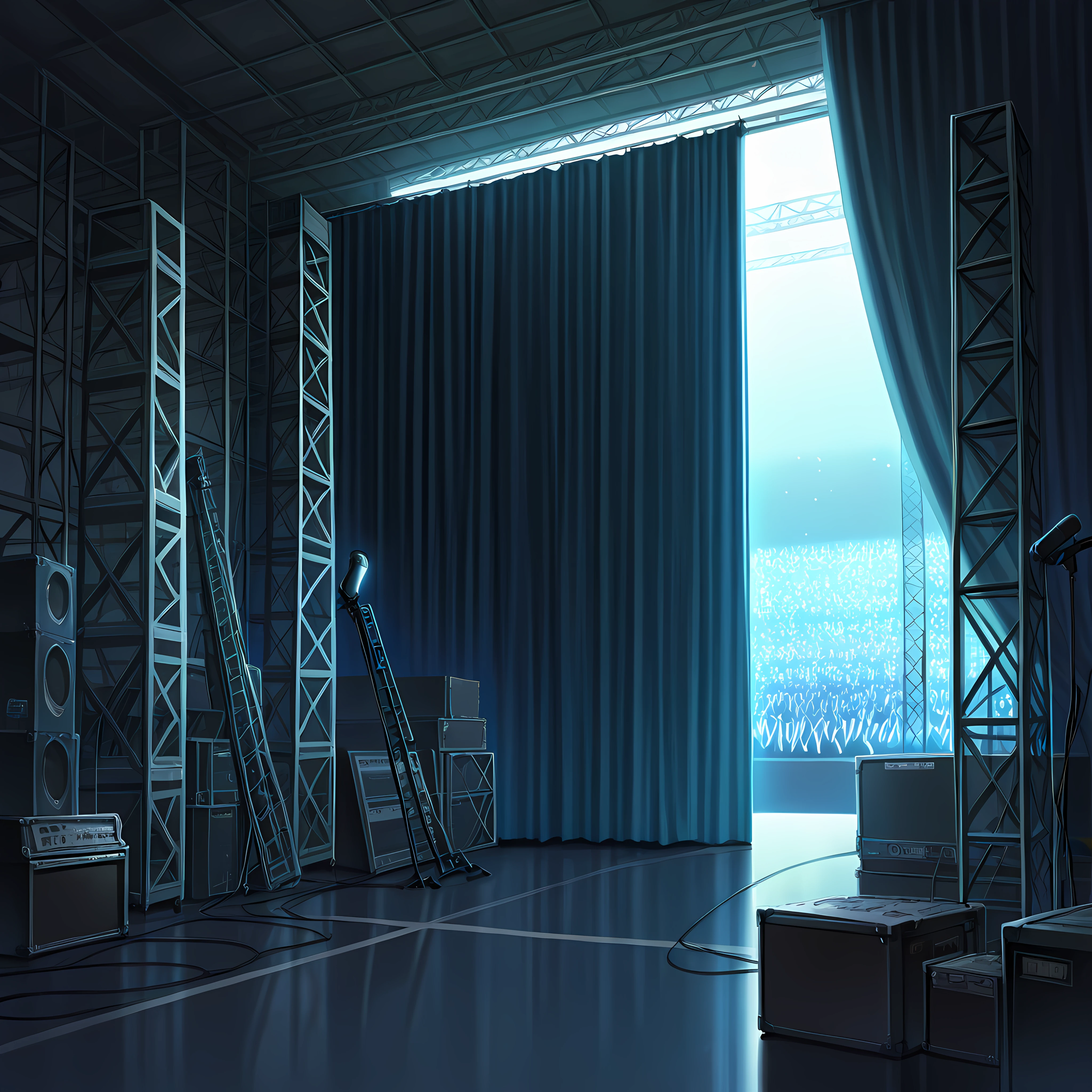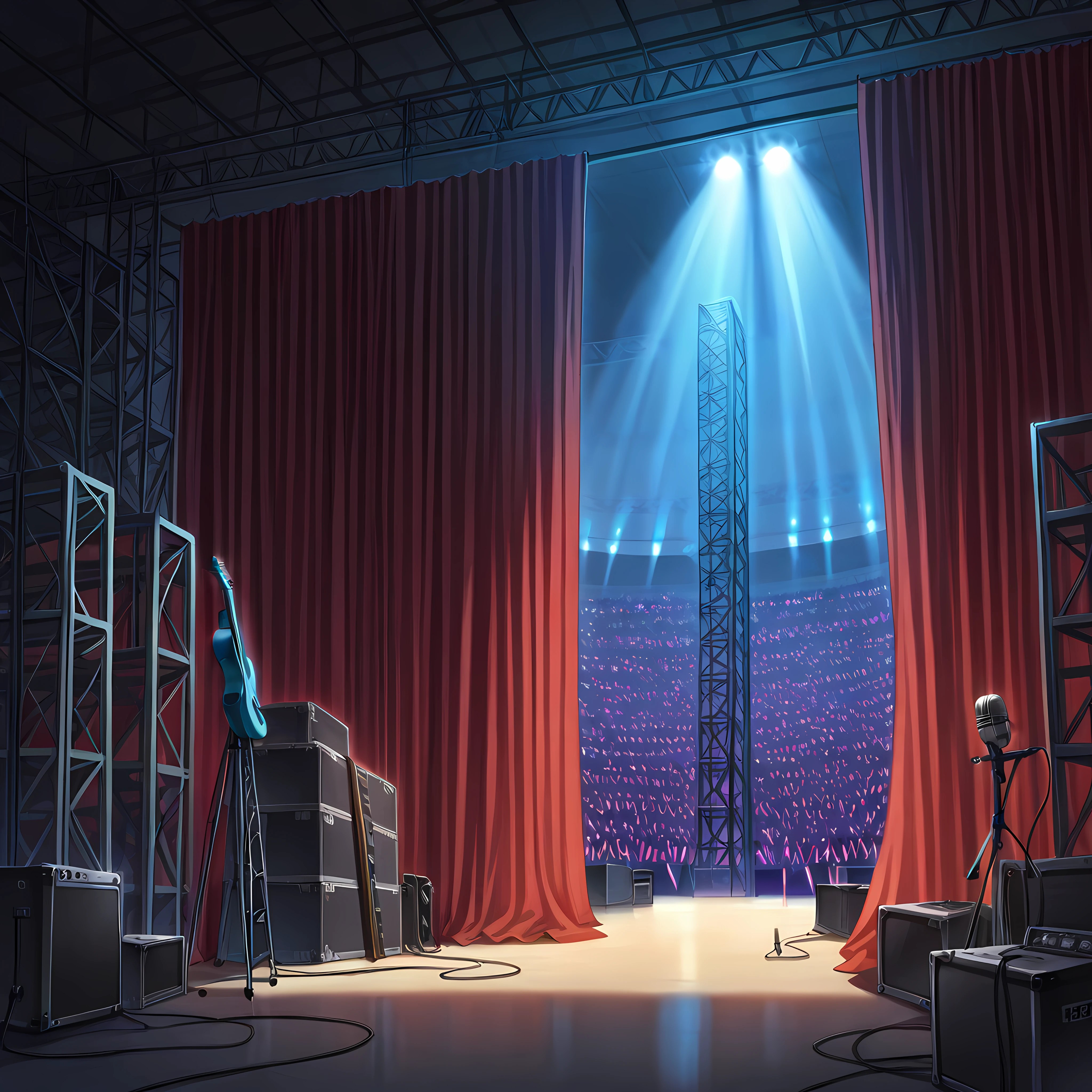 backstage, curtains, scaffolding, indoors, ,crowd behind curtains, glowsticks, , instruments, microphone stand