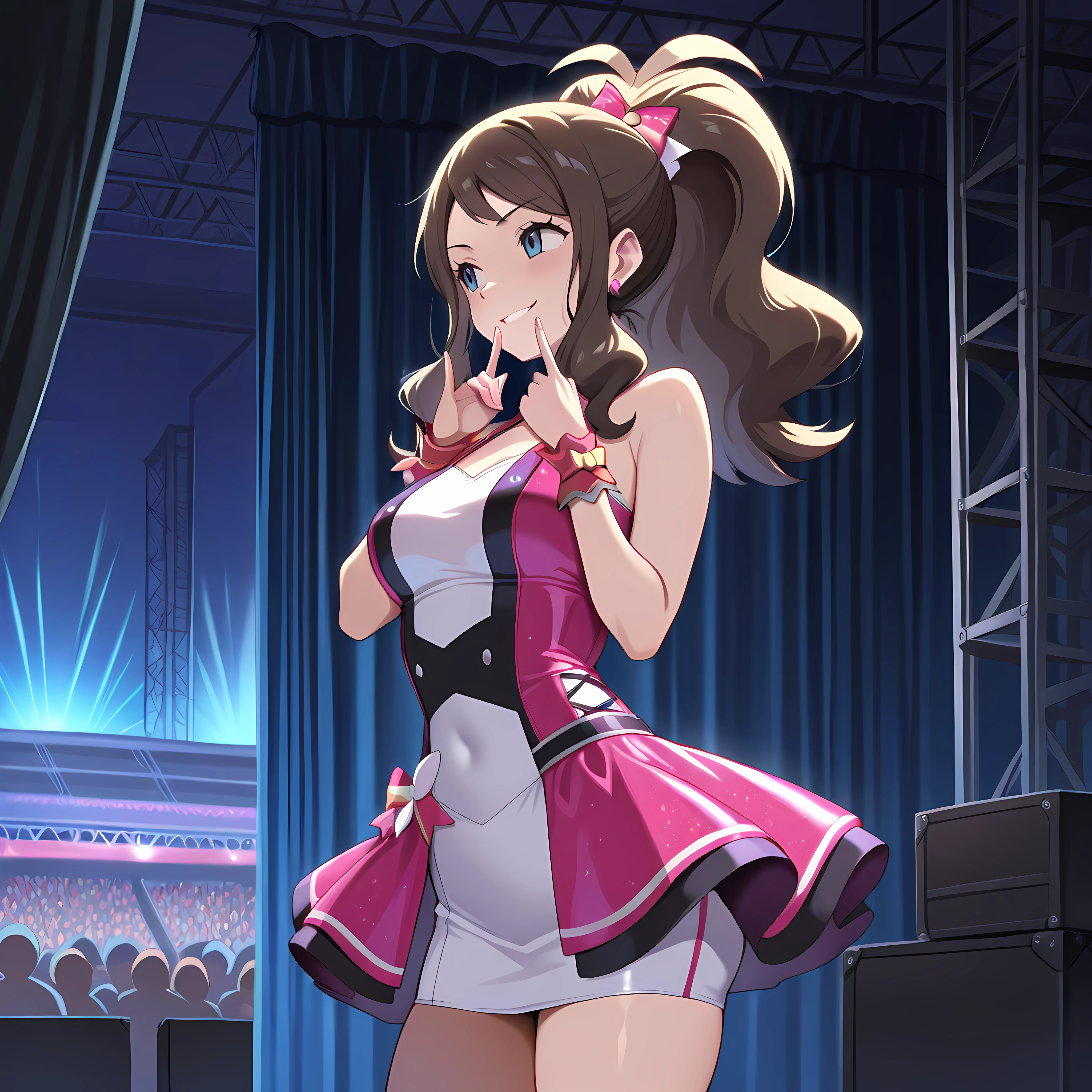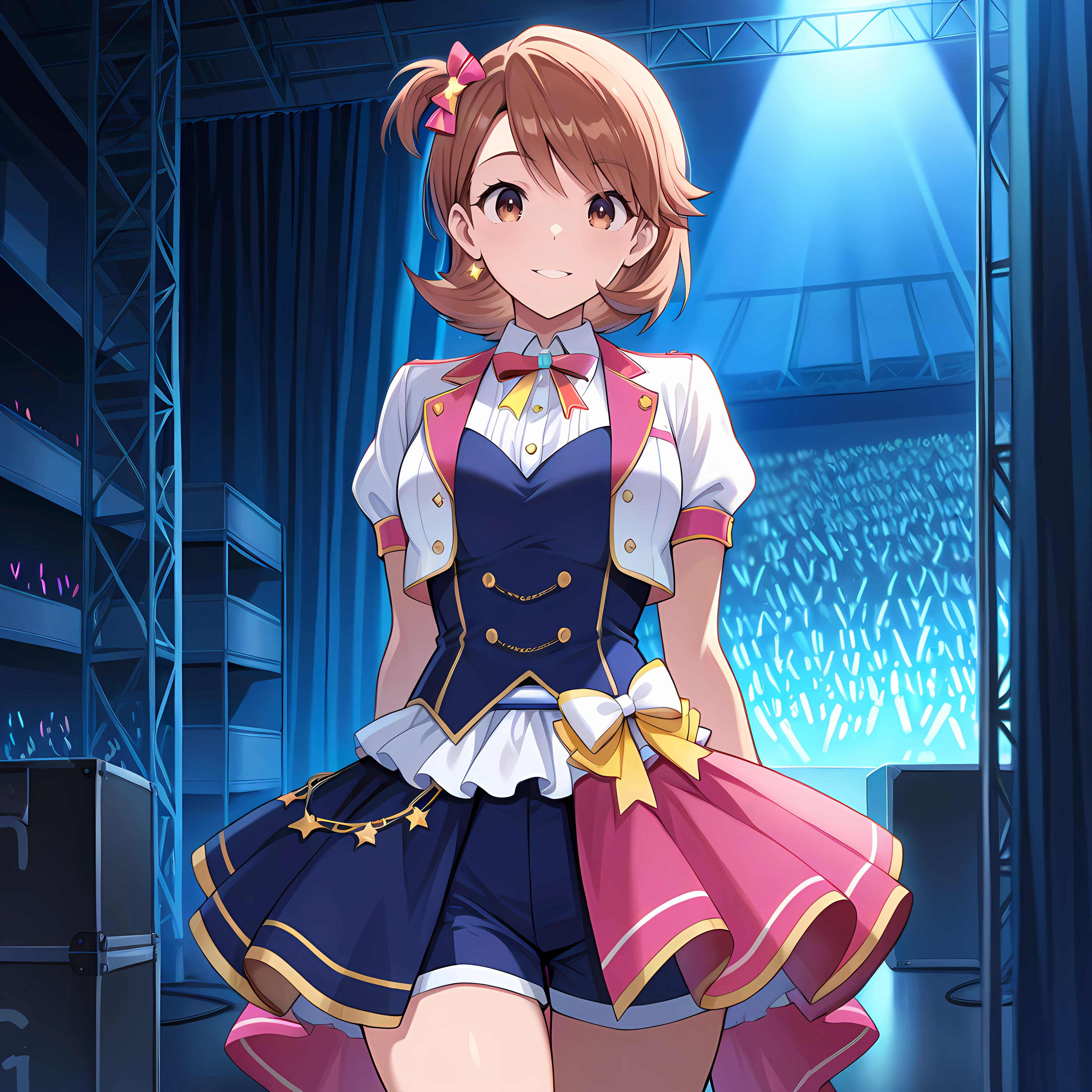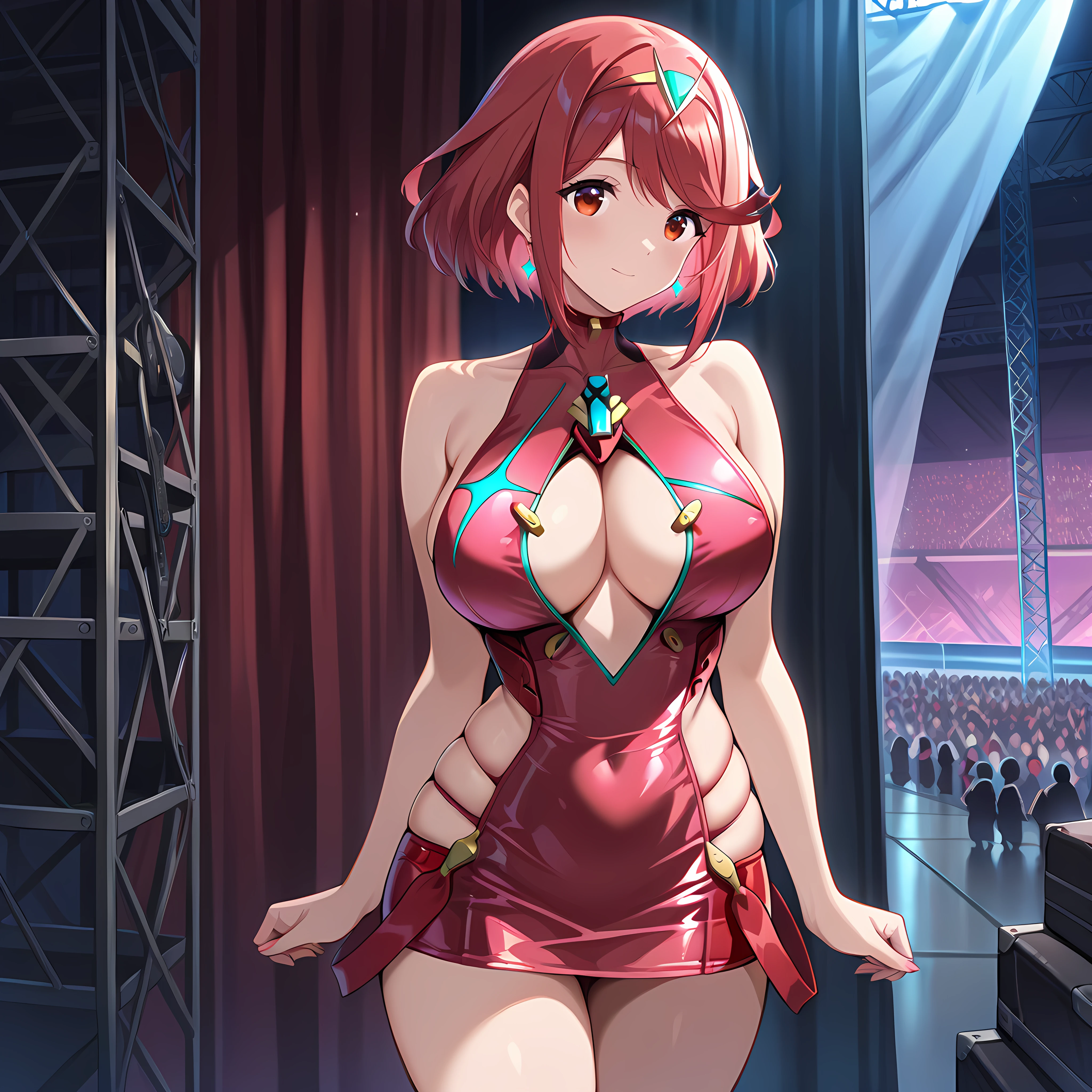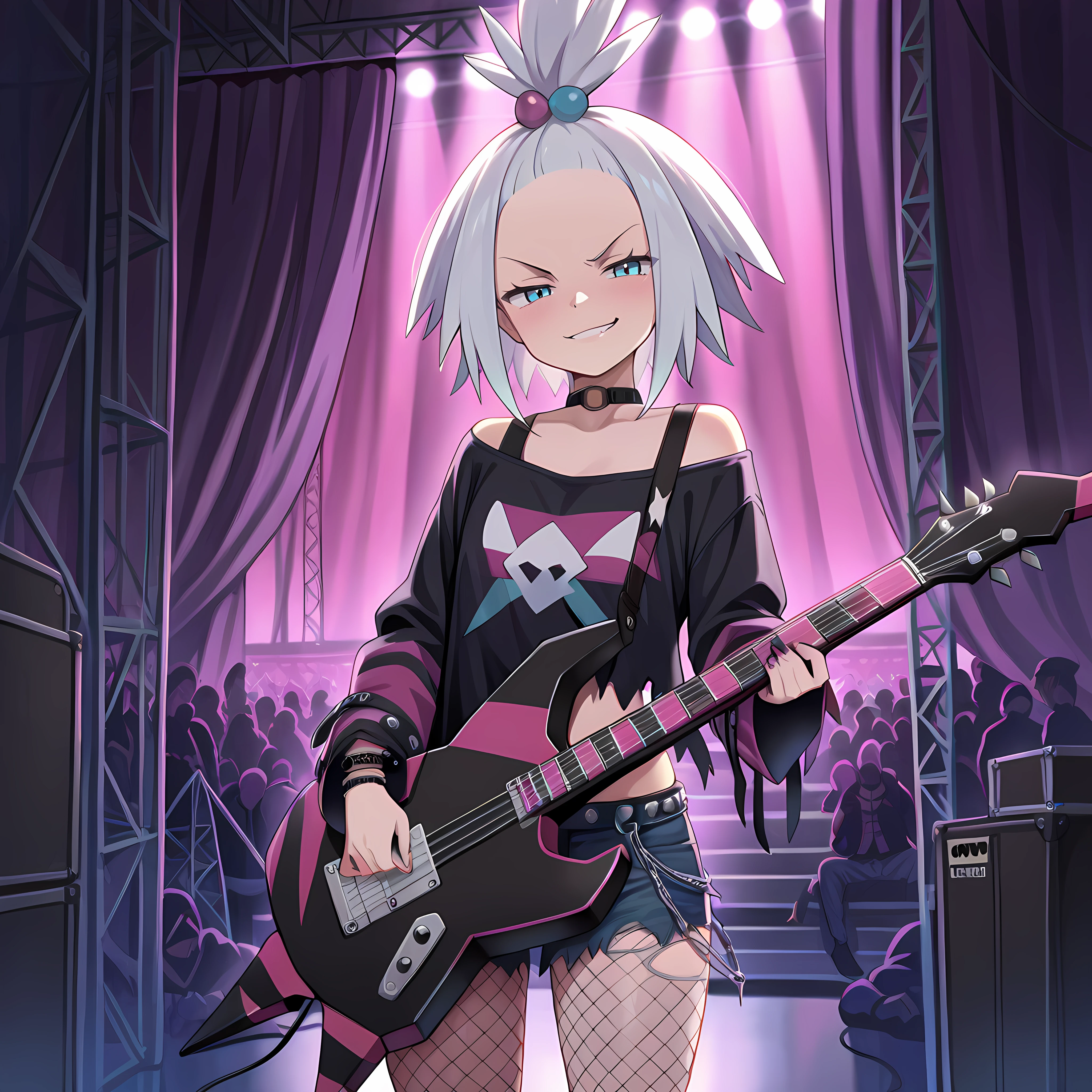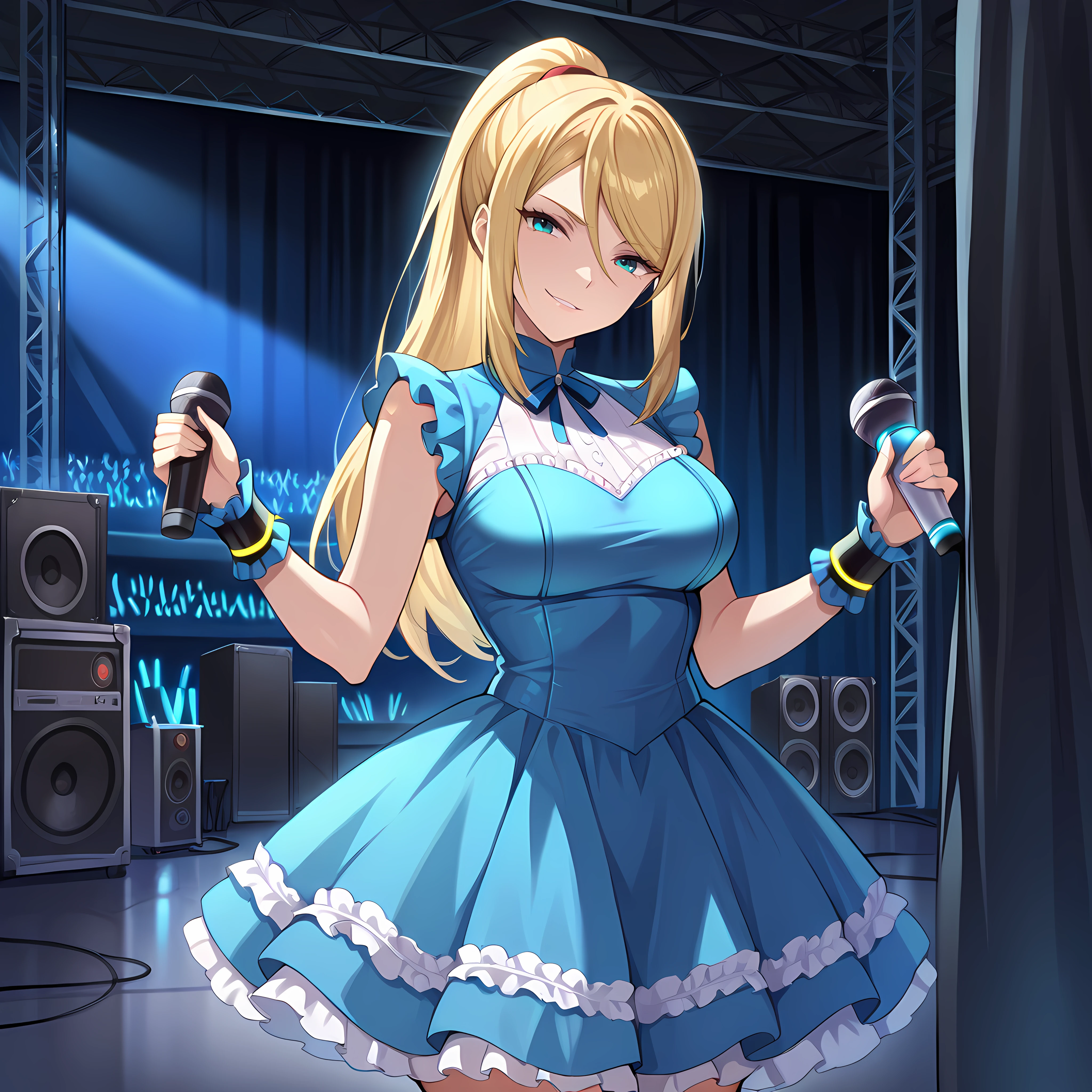 backstage, curtains, scaffolding, indoors, ,crowd behind curtains, glowsticks, , instruments, microphone stand