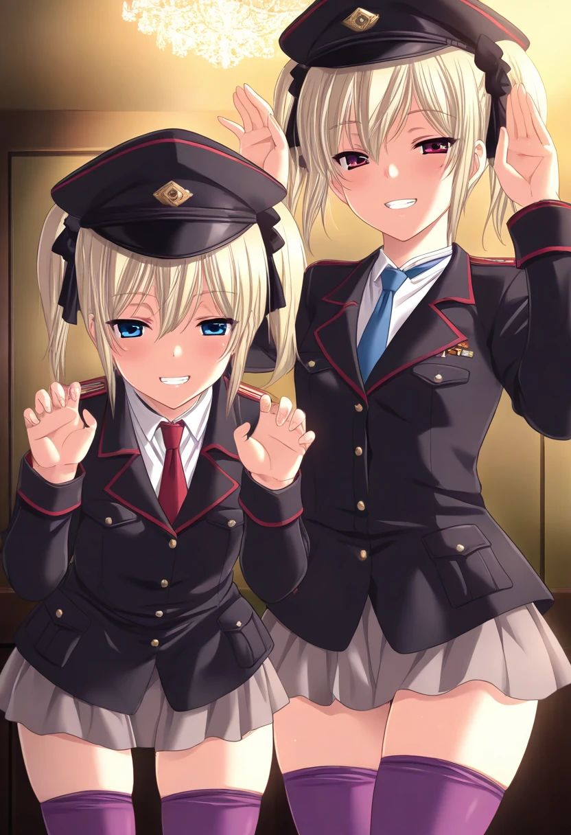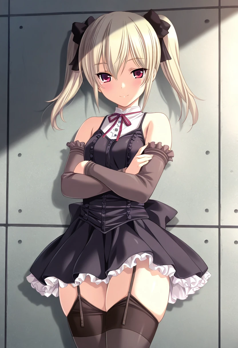 1girl, solo, black thighhighs, twintails, detached sleeves, garter straps, red eyes, black dress, ribbon, blonde hair, tsukiyomi, pleated dress
