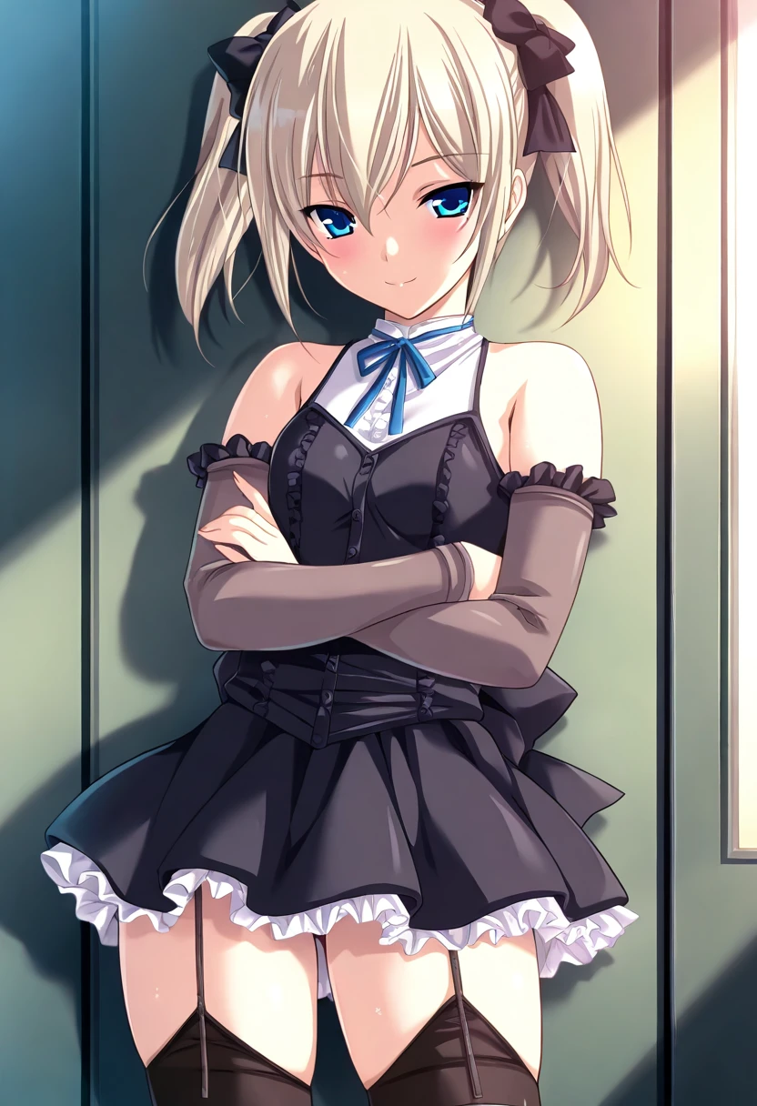 1boy, solo, blue eyes, black thighhighs, twintails, garter straps, detached sleeves, blonde hair,black dress, ribbon, short hair, bare shoulders, hoshiyomi, crossdressing