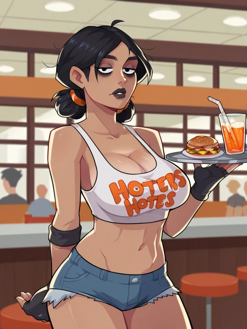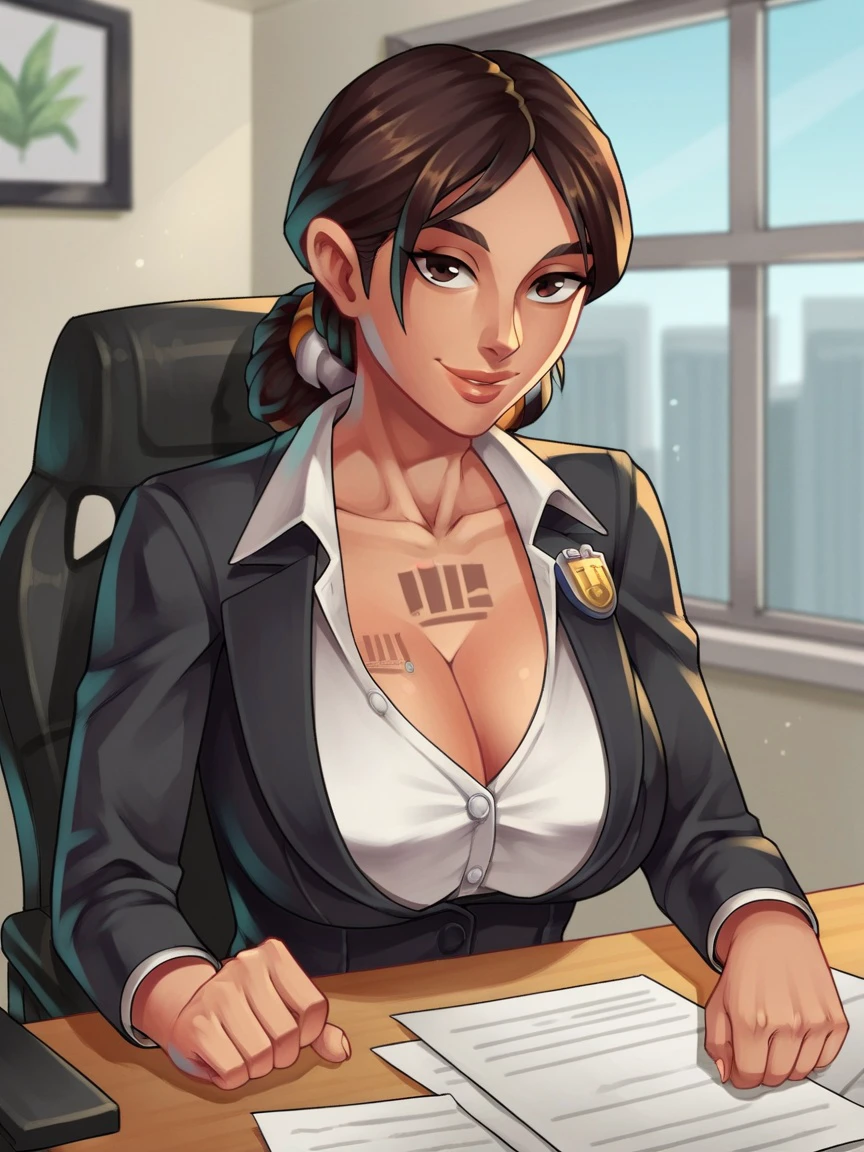 judge xanthe (mnf), dark-skinned female, double bun, hair scrunchie, brown hair, short hair, brown eyes, hoop earrings