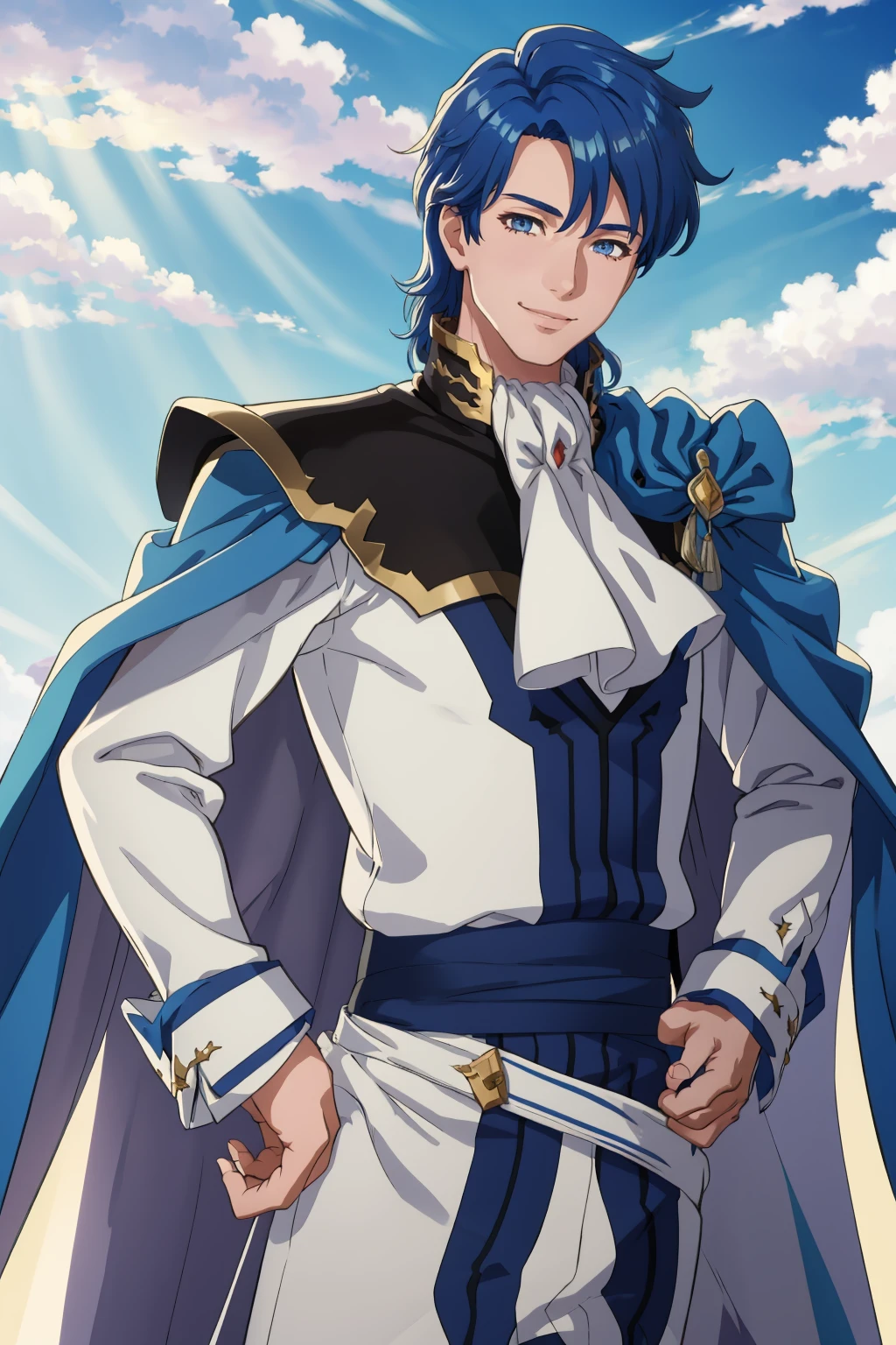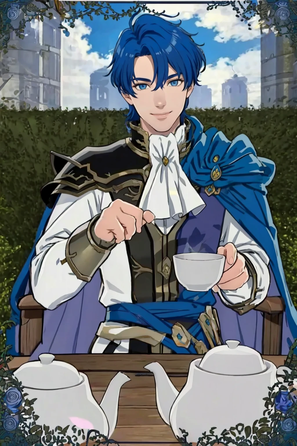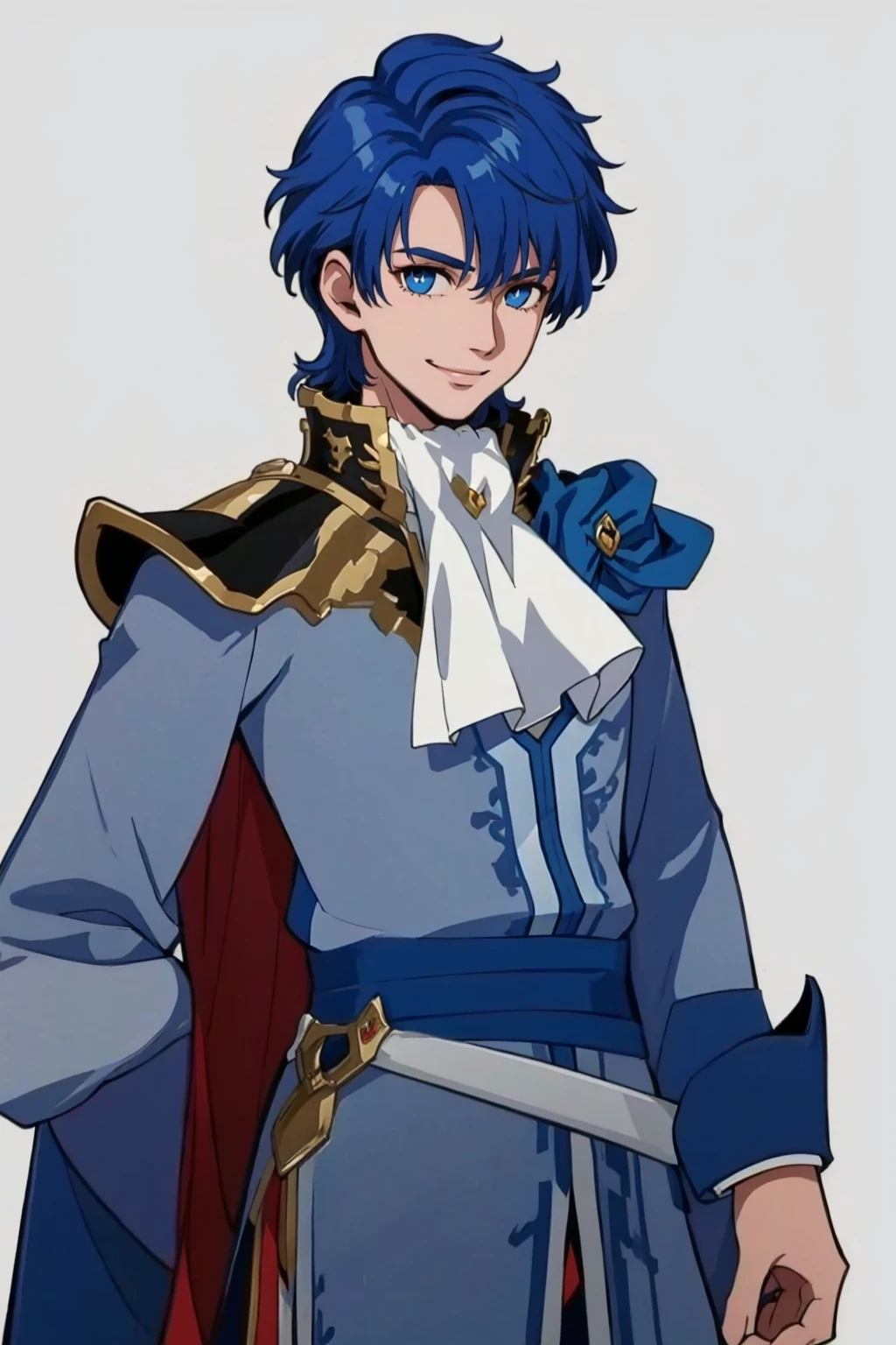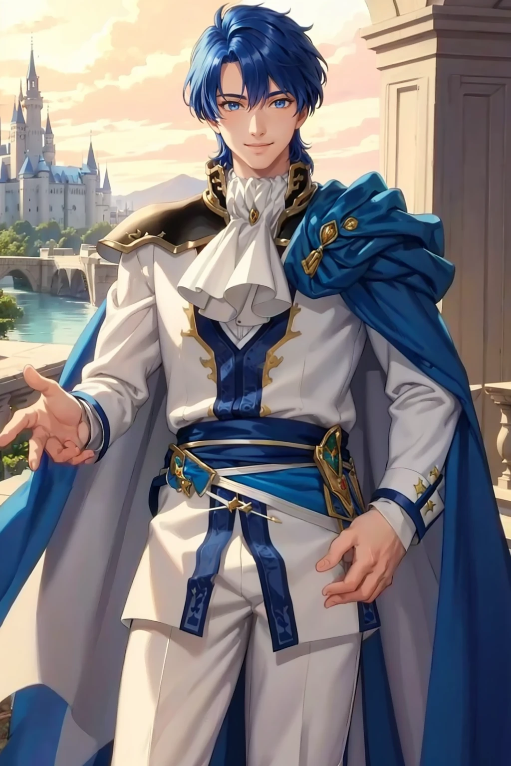For his normal outfit it's "armor, white pants, ascot, blue cape"
