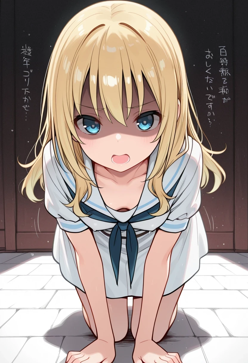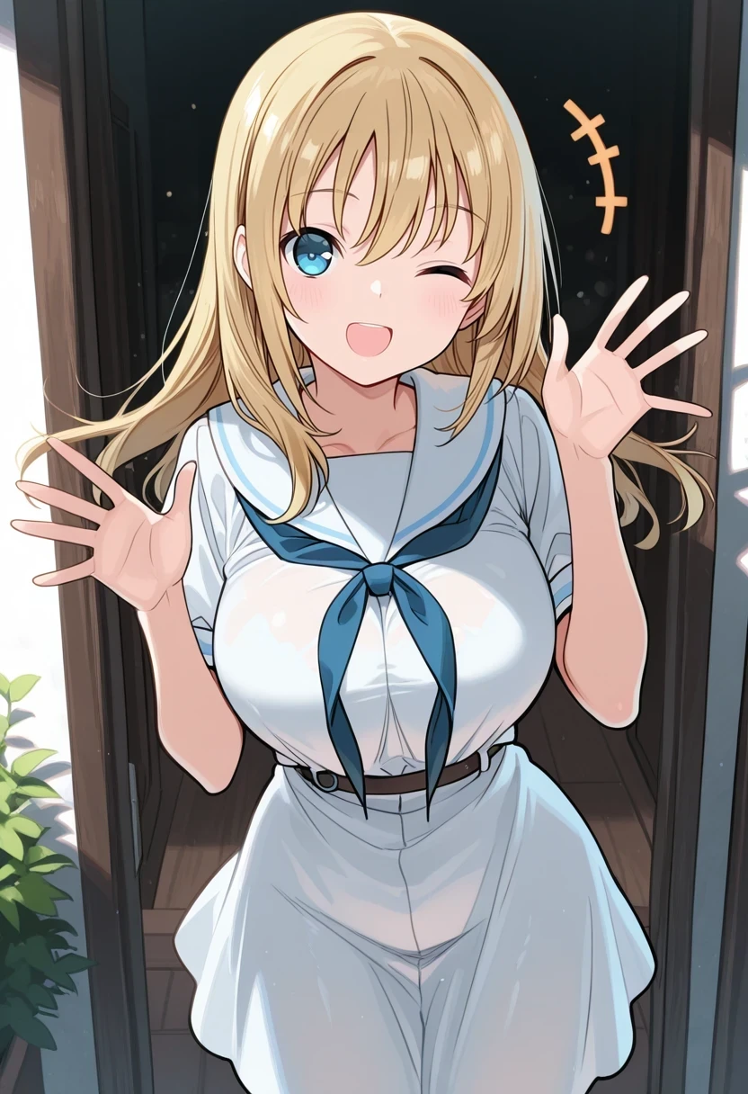 white dress,sailor collar,blue neckerchief,black belt,Description