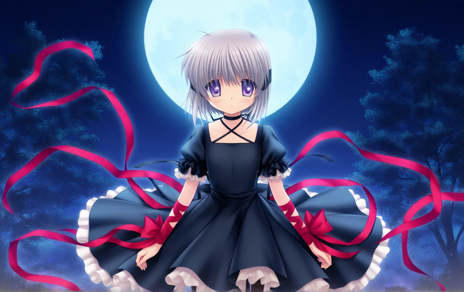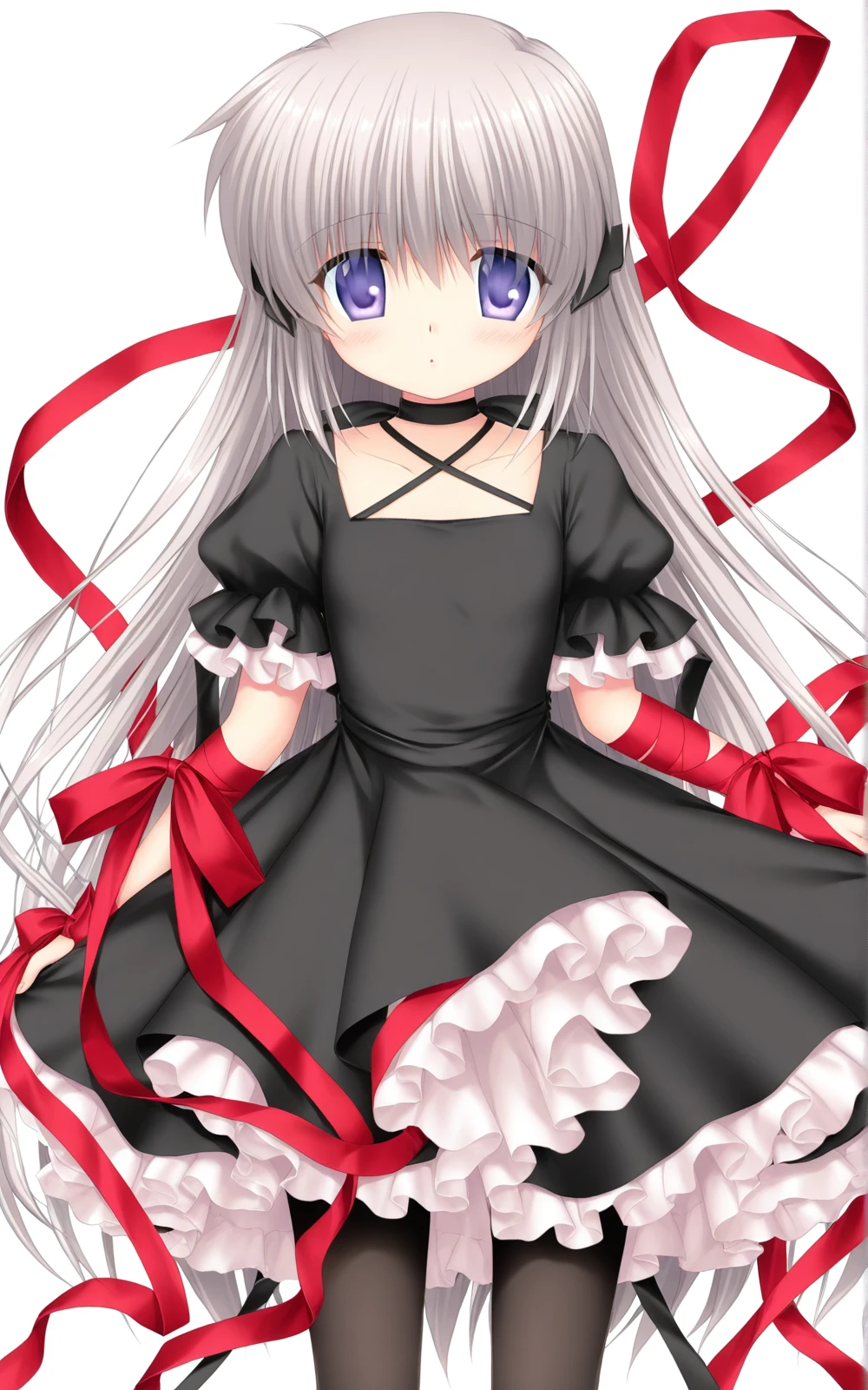 常服:black dress,ribbon,dress,long ribbon,red ribbon,arm ribbon,short sleeves,criss-cross halter,puffy short sleeves,puffy sleeves,choker,halterneck,frills,wrist bow,frilled sleeves,black pantyhose