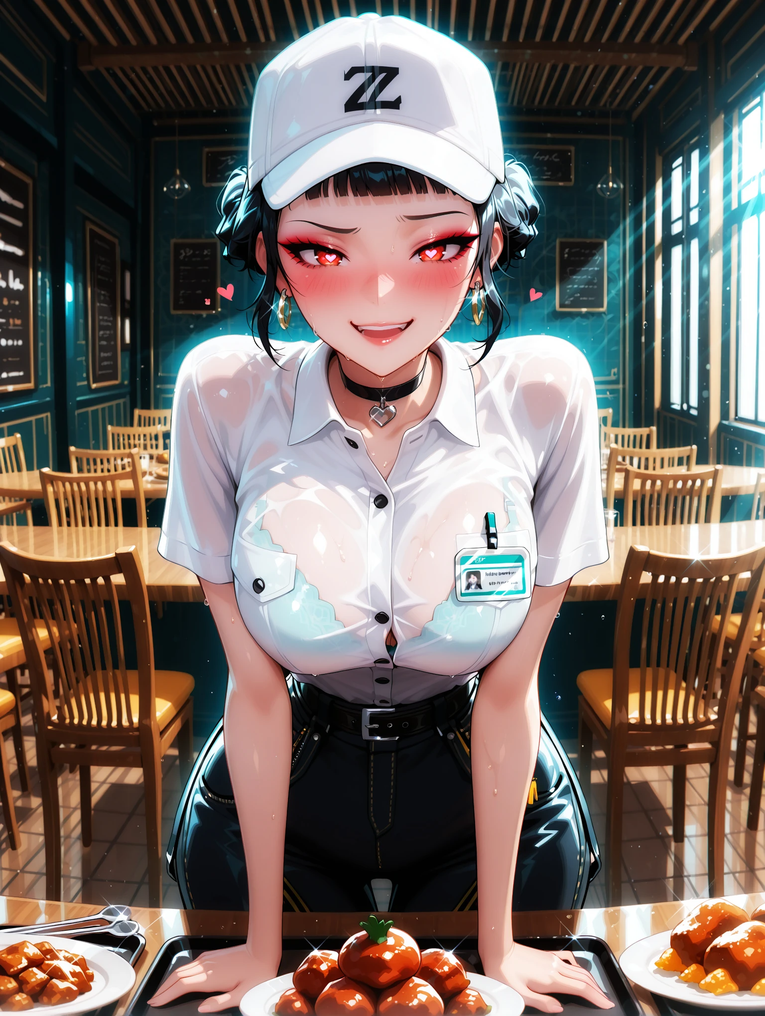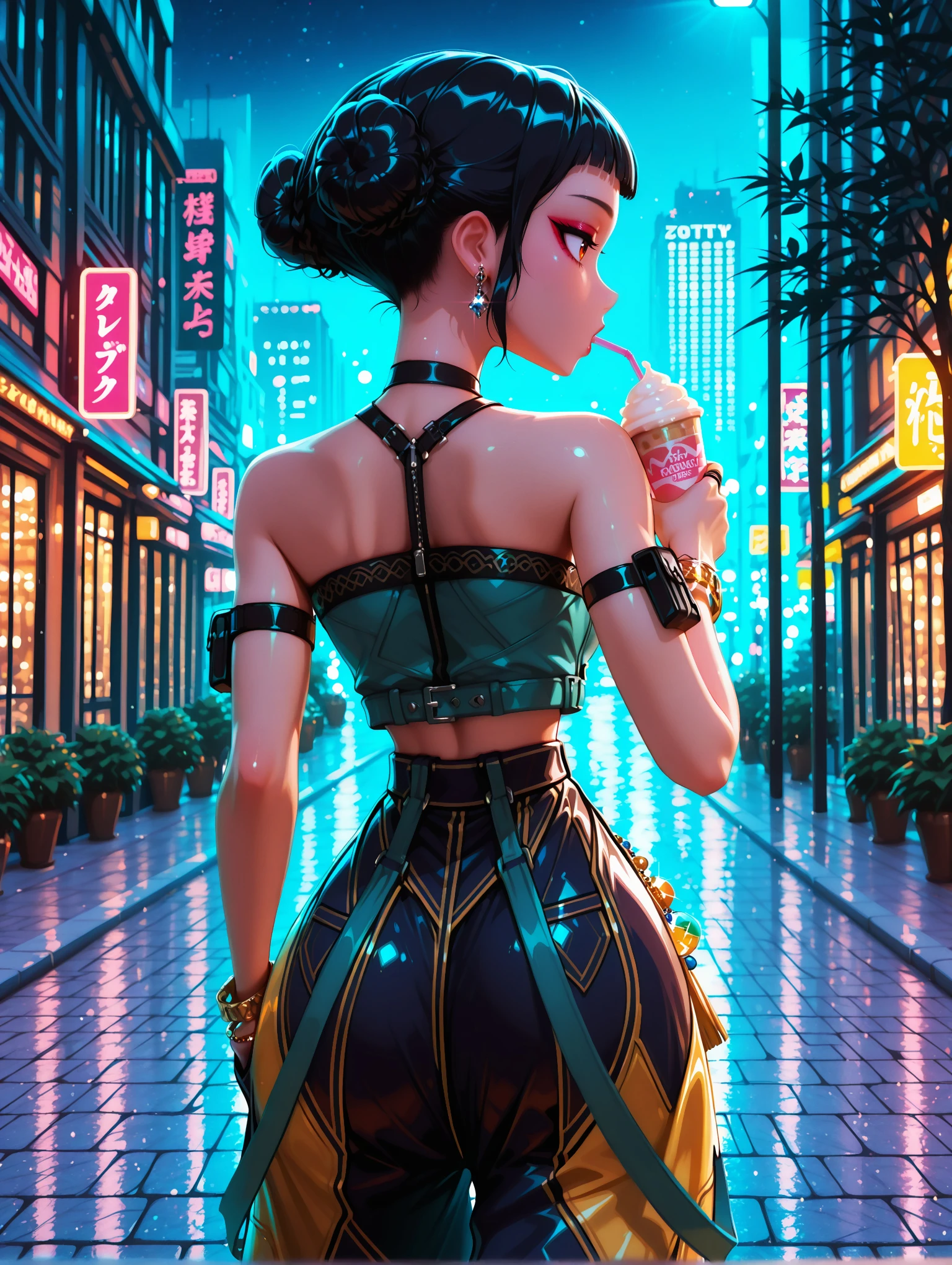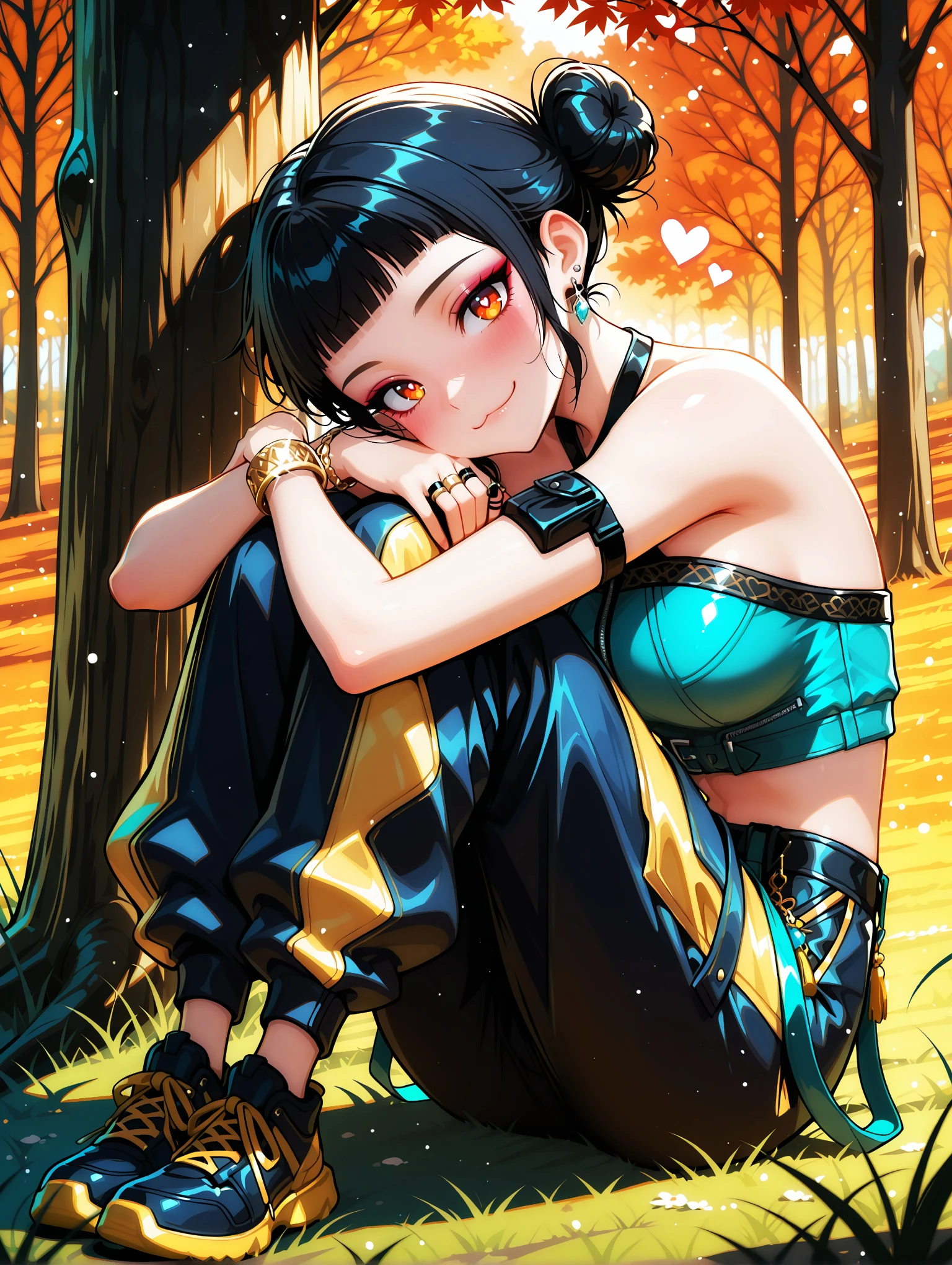 Zoey Prompts : 1girl, black hair, hair bun, double bun, short hair, brown eyes, bangs, blunt bangs, makeup, eyeshadow