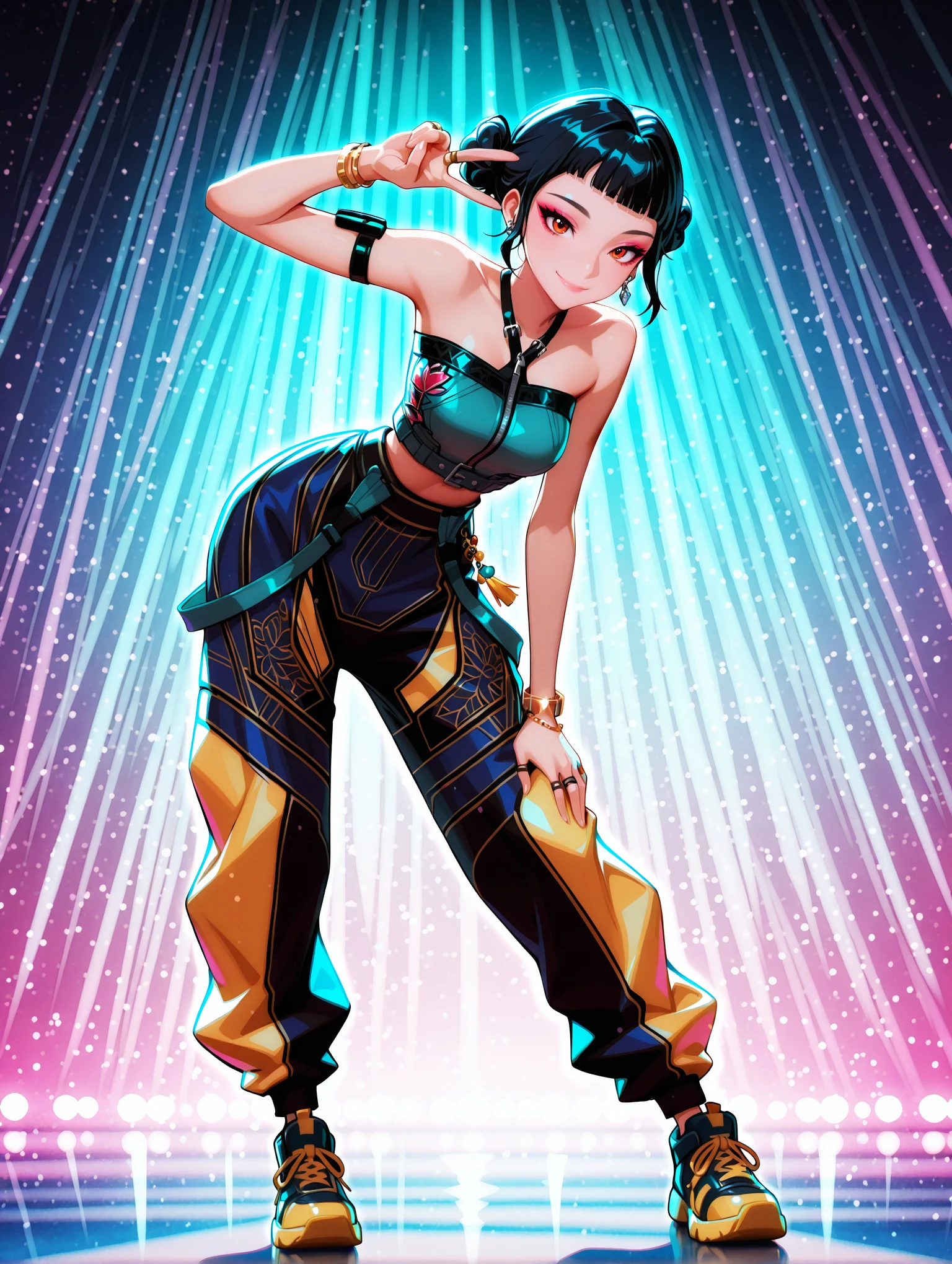 Outfit Prompts : crop top, pants, baggy pants, earrings, single arm strap, ???? shoulders, bracelet, midriff, ring, shoes, sneakers