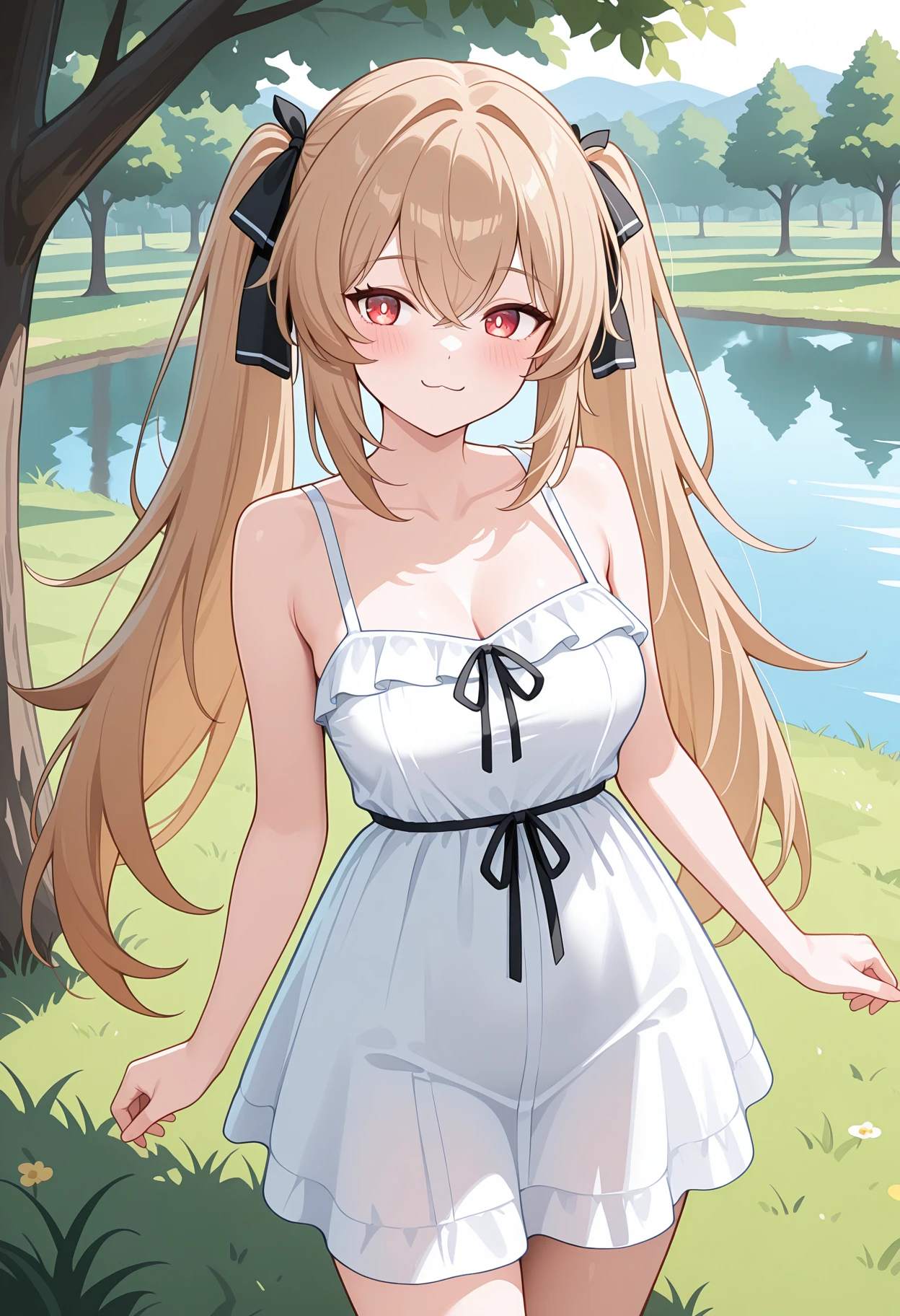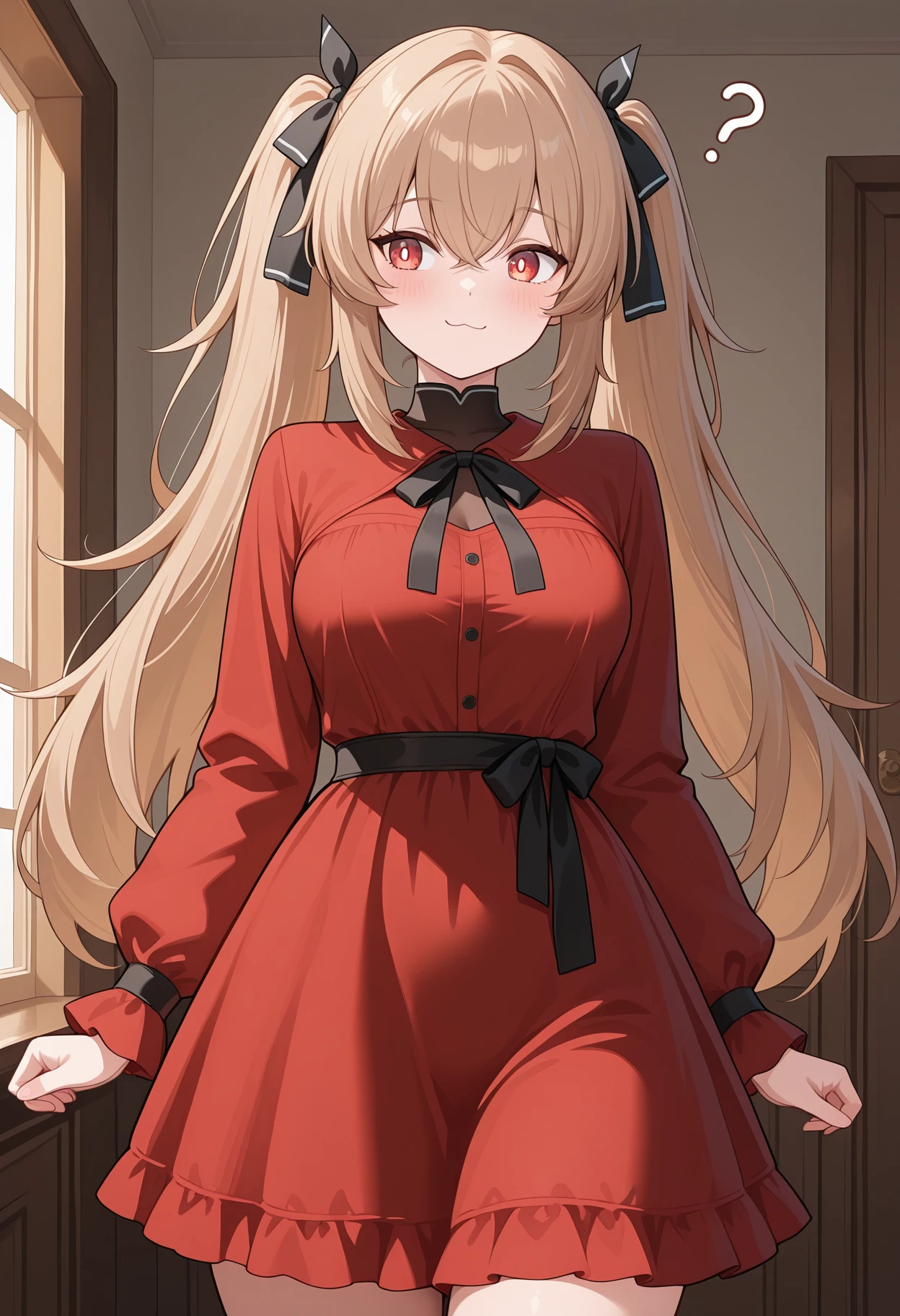 long hair, twintails, crossed bangs, hair between eyes, sidelocks, light brown hair, hair ribbon, black ribbon, red eyes, green pupils, :3