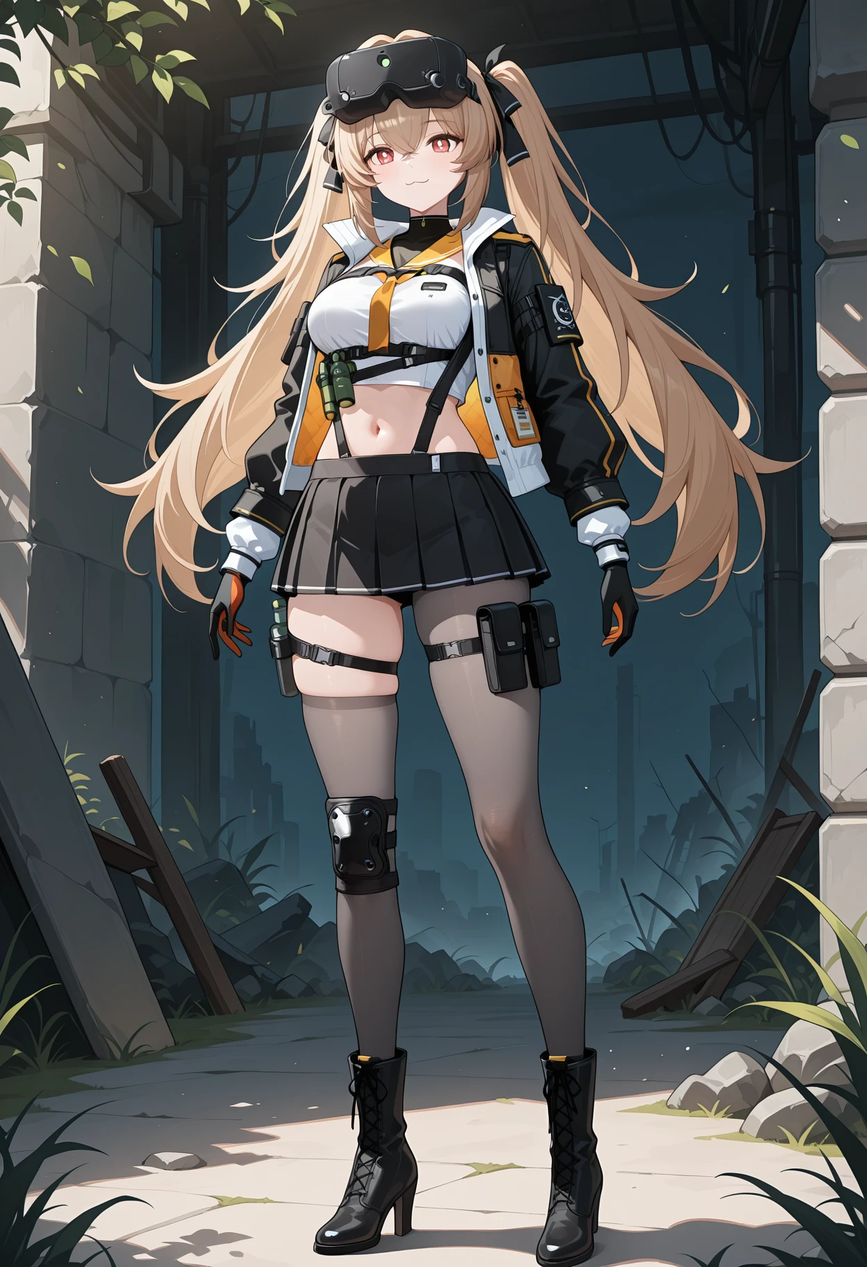 black skirt, miniskirt, pleated skirt, single thighhigh, grey thighhighs, single leg pantyhose, grey pantyhose, thigh pouch, thigh holster, single knee pad, high heel boots, black boots