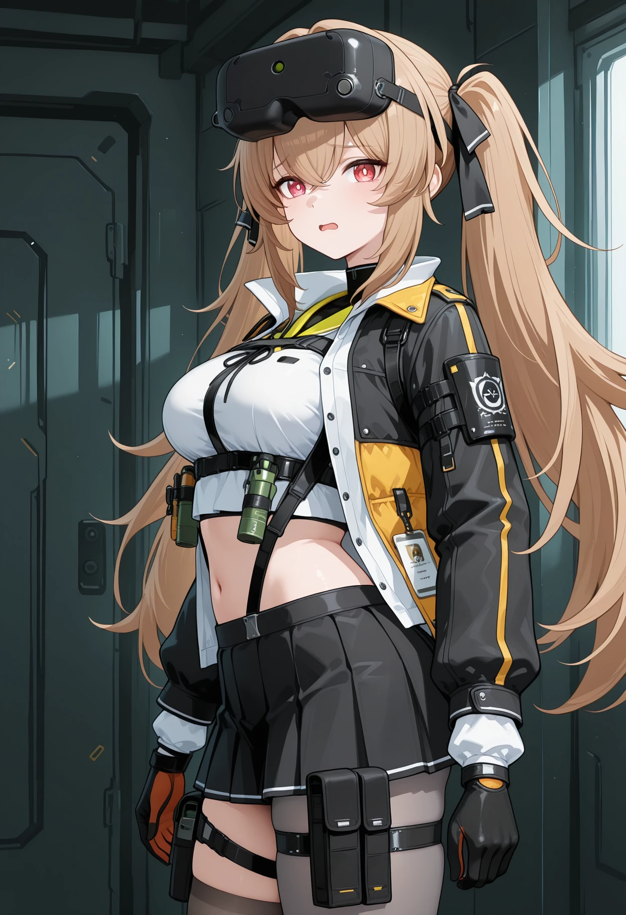 multicolored jacket, long sleeves, open jacket, id card, flashbang, white shirt, cropped shirt, chest harness, suspenders, two-tone gloves, midriff, navel, medium breasts