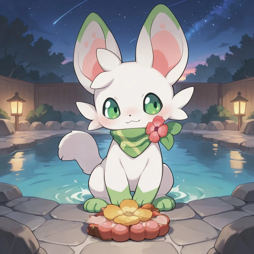 The scarf features a flower on the side,scarf, Green Feet,Big Ears,ear, White fur,furry,furry boy