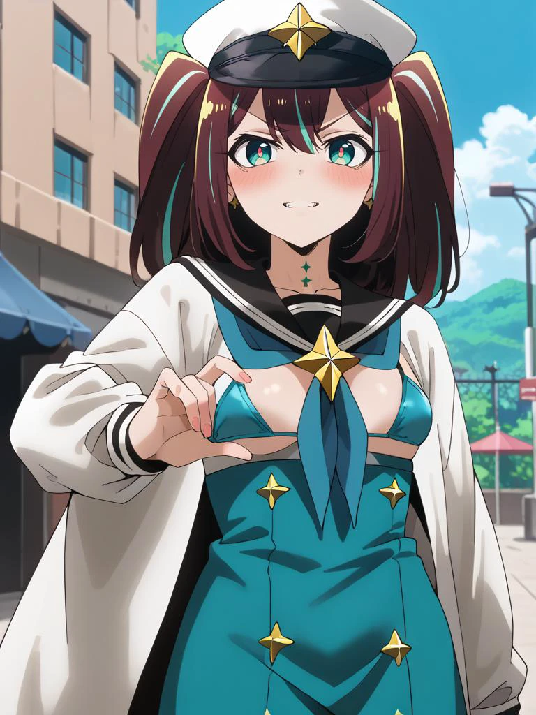 akoyadress,aqua neck tattoo,star tattoo,pink pupils, white peaked cap,black sailor collar,blue neckerchief,star (symbol),long sleeves white jacket,black micro bikini,bikini top only, bikini under clothes,high-waist aqua skirt,black thighhighs, aqua knee boots,