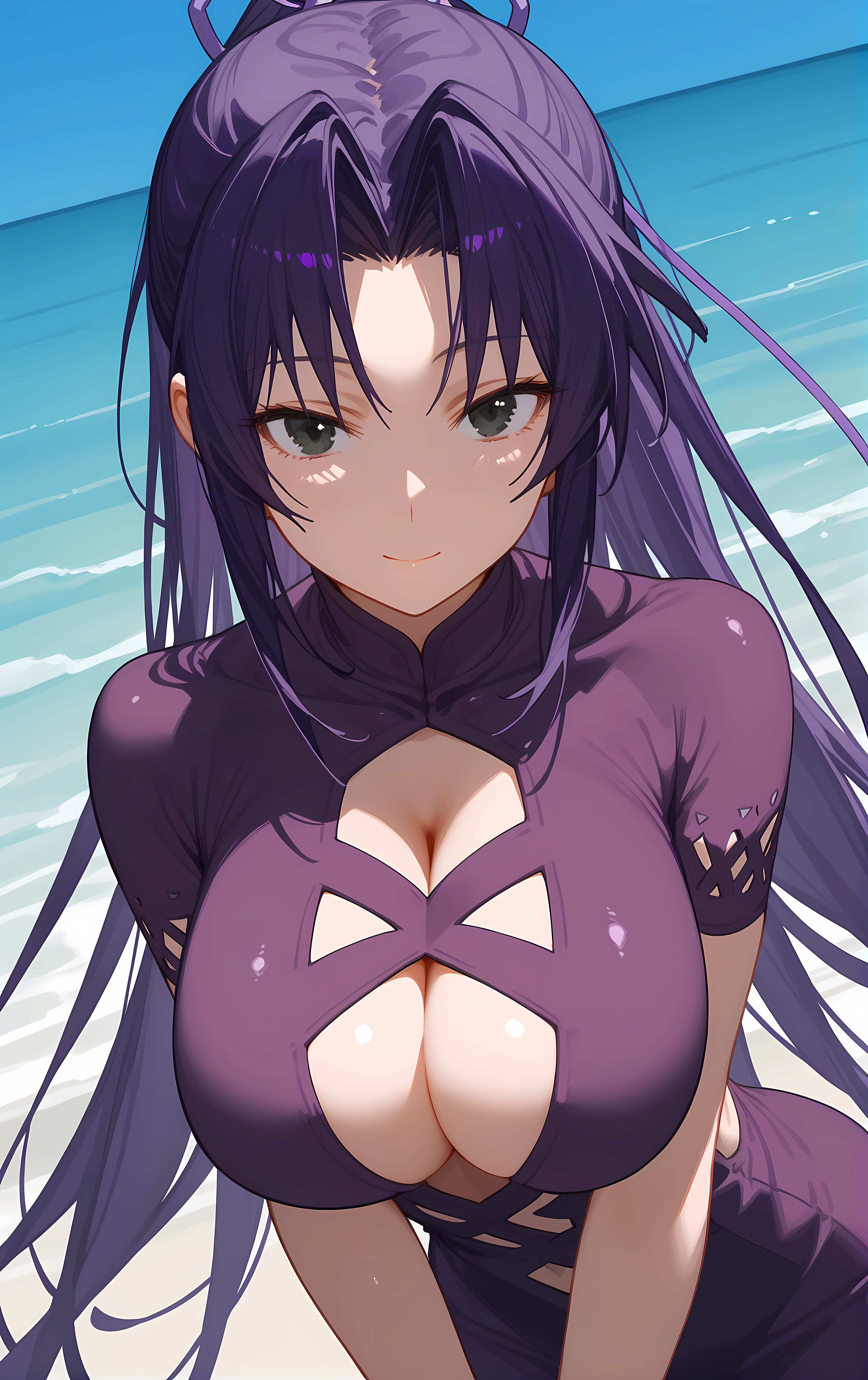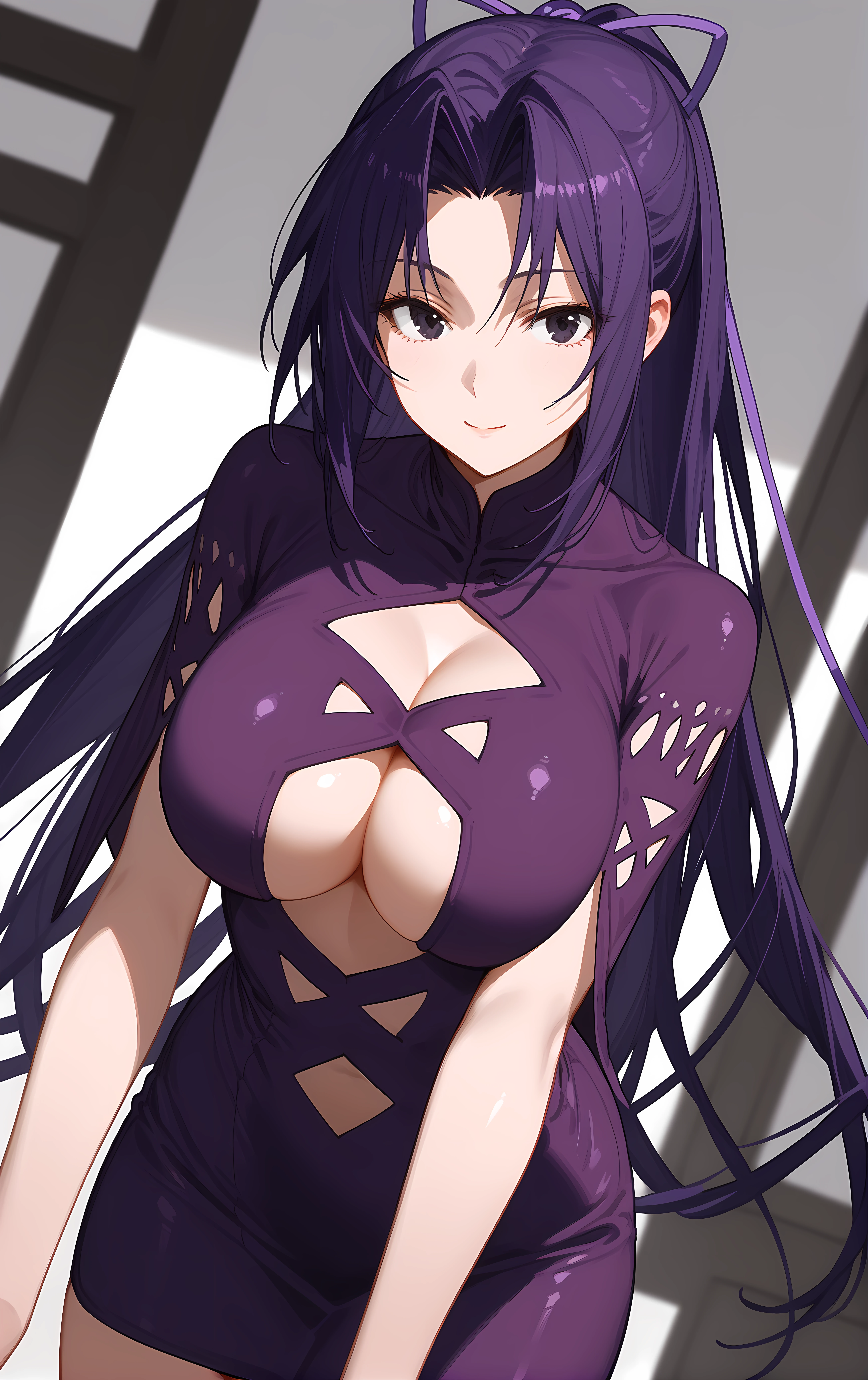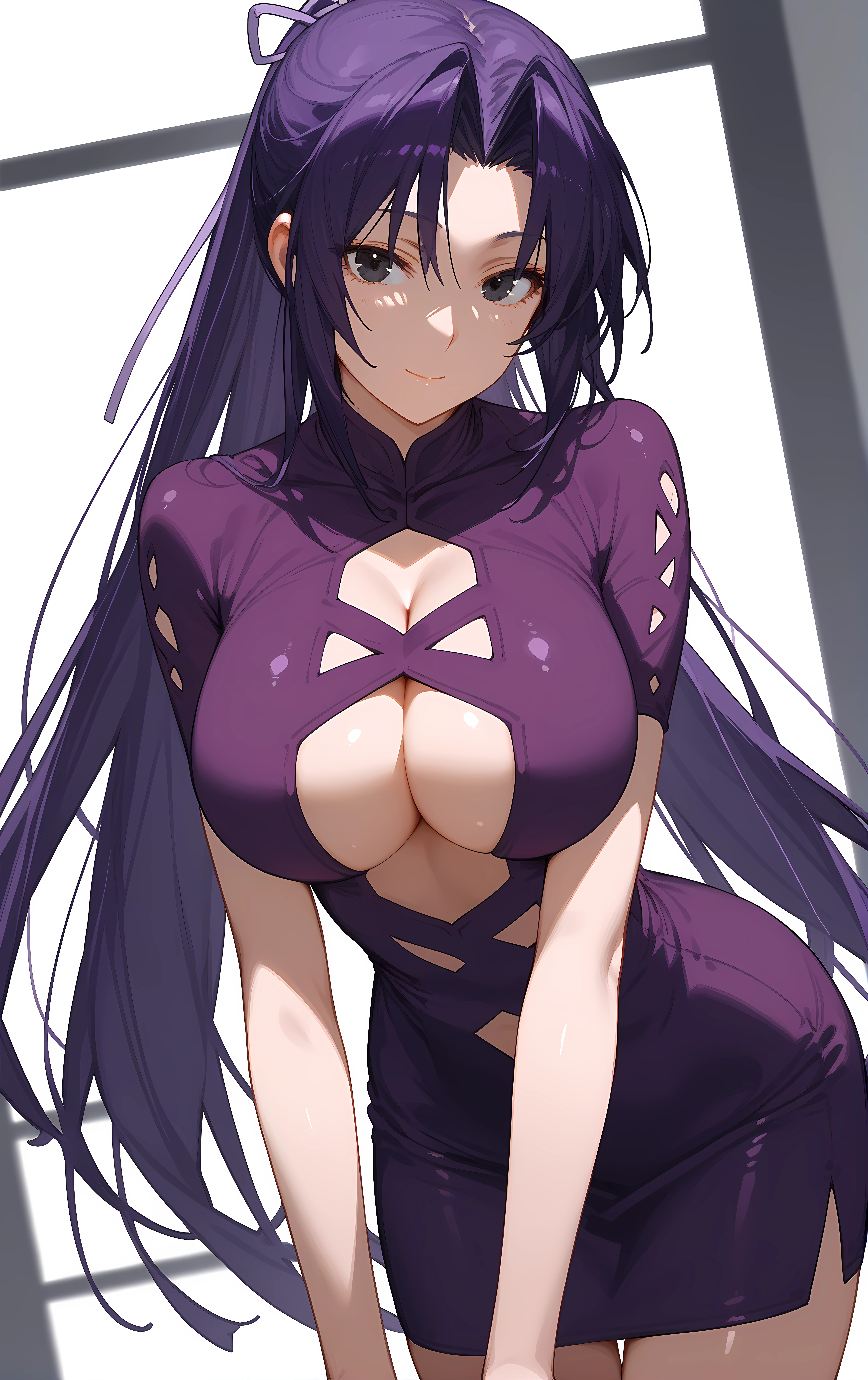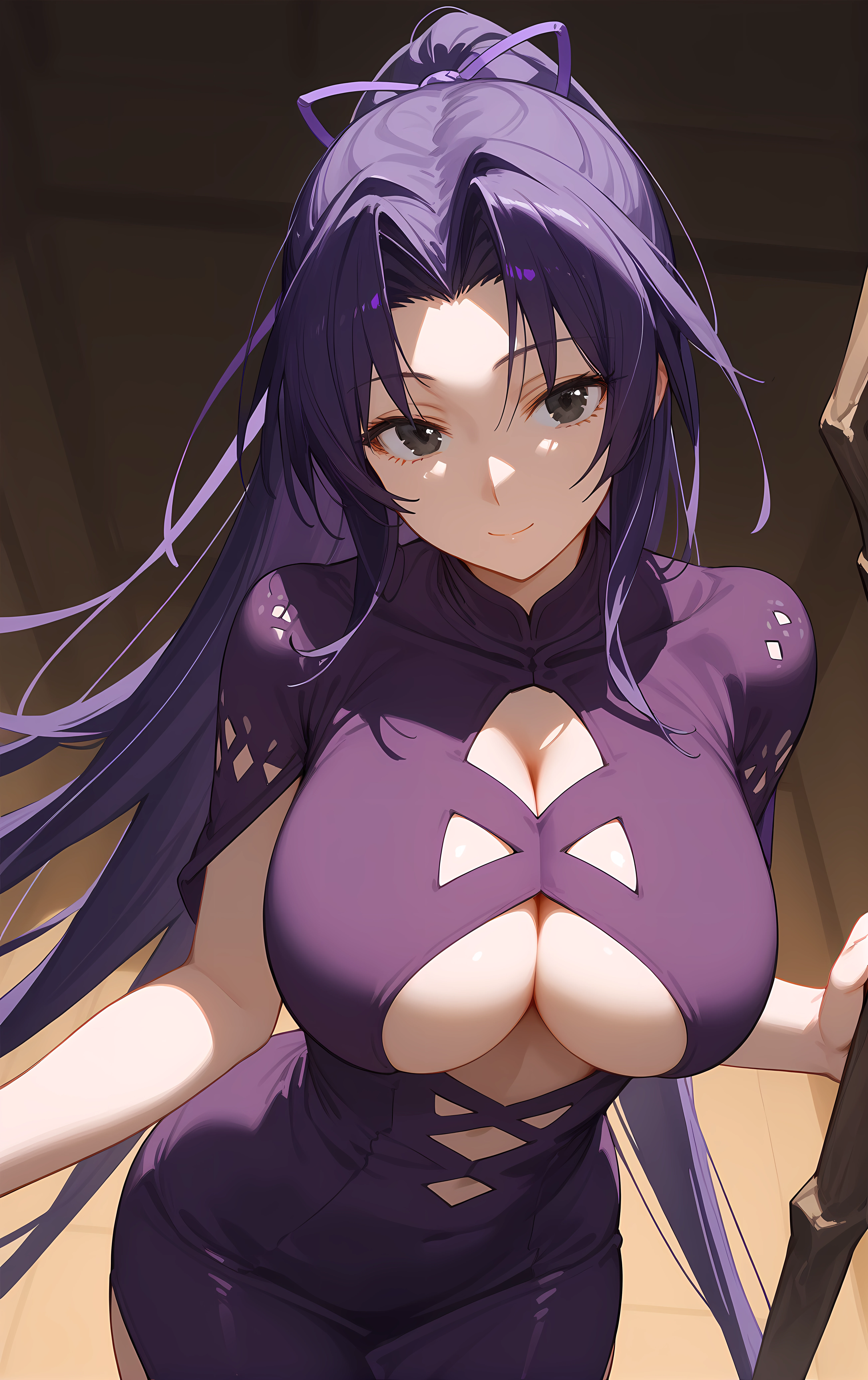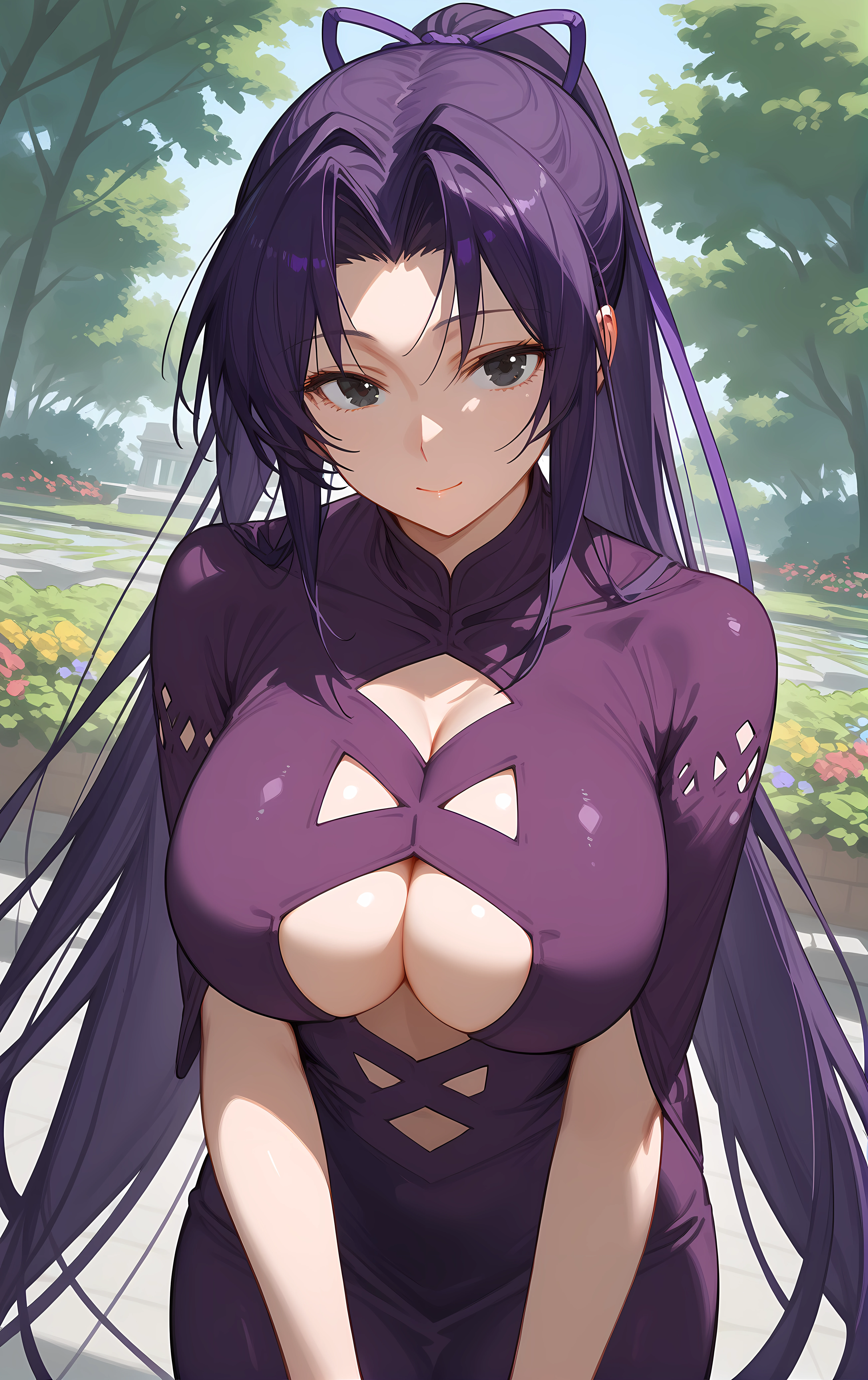 ohwx, 1girl, solo, black_eyes, breasts, long_hair, large_breasts, ponytail, hair_ribbon, ribbon, purple_hair,