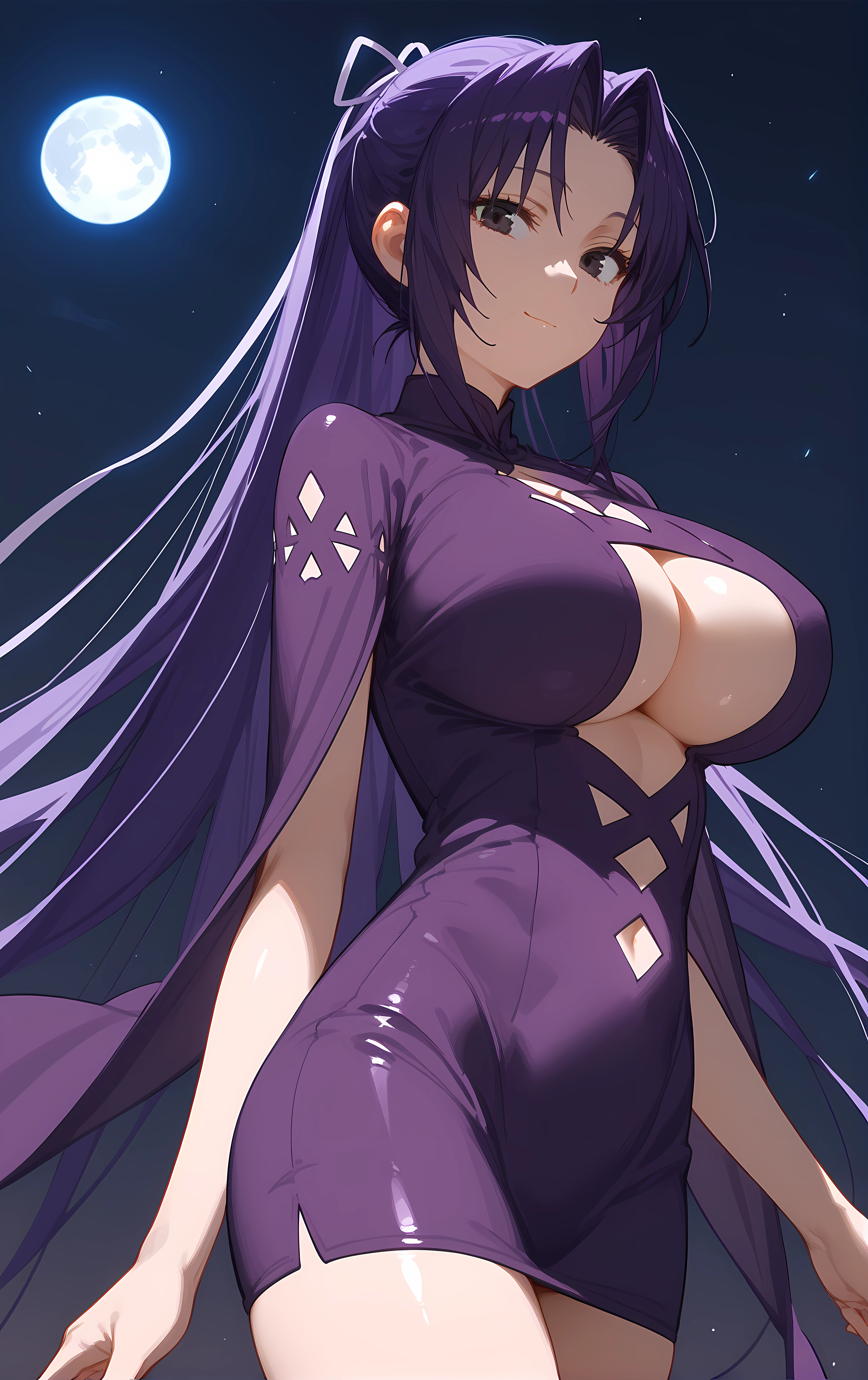 clothing_cutout, short_dress, dress, high_heels, underboob, anklet, cleavage_cutout, purple_footwear, shoes, cleavage, purple_dress, center_opening, underboob_cutout,