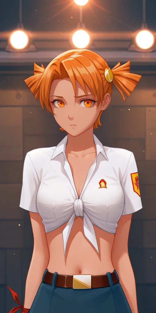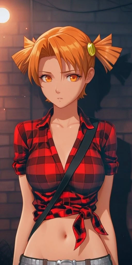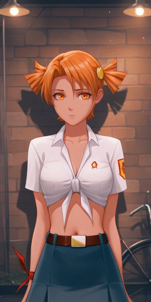 2) Sport uniform. To do this, use the following three words: orange hair, orange eyes, short twintails, Orange shorts, Orange sleeveless T-shirt with yellow straps.