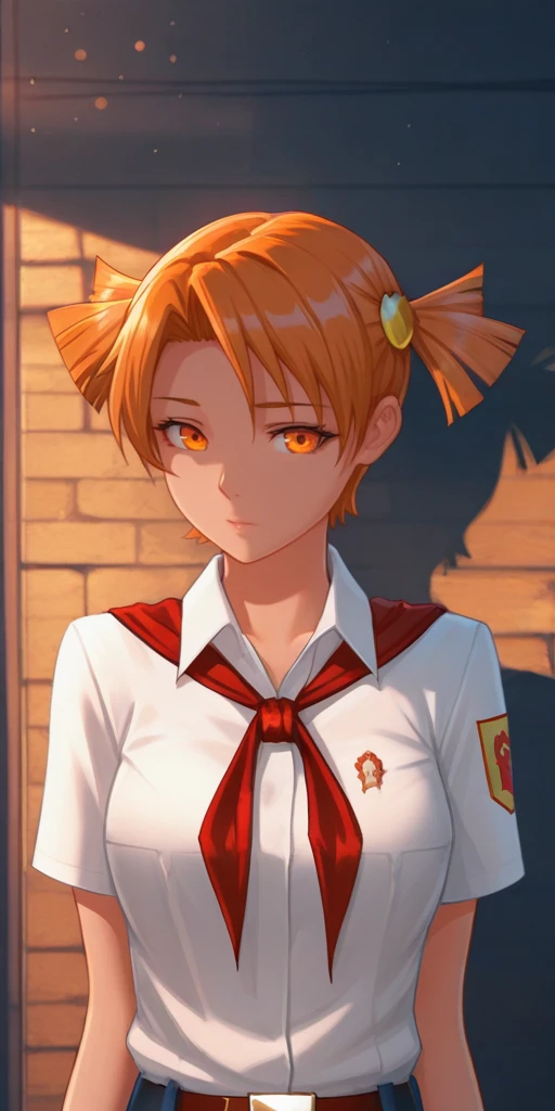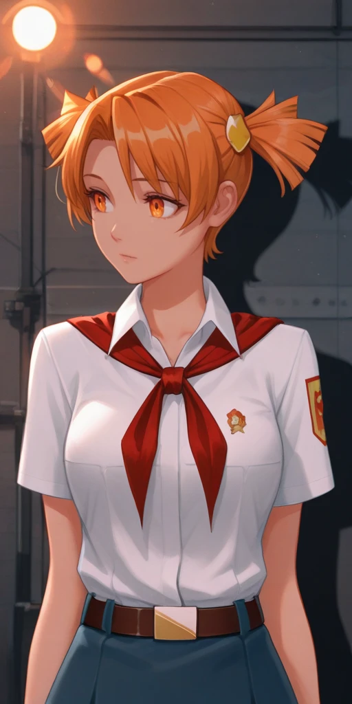 1) Pioneer uniform. To do this, use the following three words: orange hair, orange eyes, short twintails, White shirt, belt, blue skirt, white socks, red neckerchief. Or orange hair, orange eyes, short twintails, tied white shirt, belt, blue skirt, white socks, red bracelet on the right hand.
