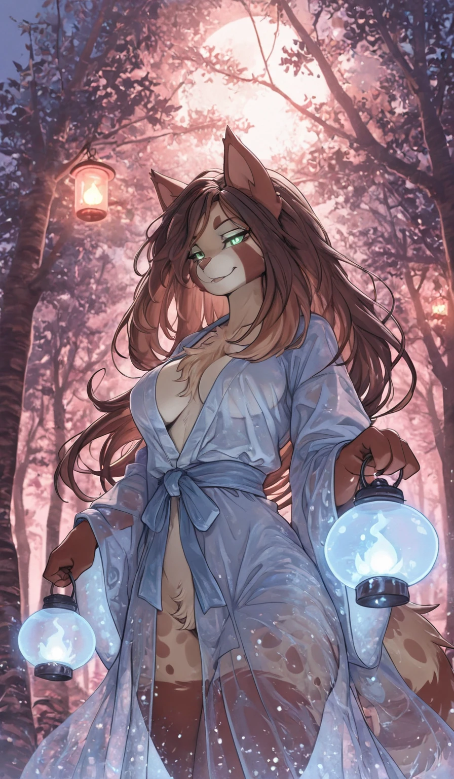 1girl,Zarielle,furry female,green eyes,caracal ears,brown fur,tail,brown hair,long hair,body fur,large breasts, fangs