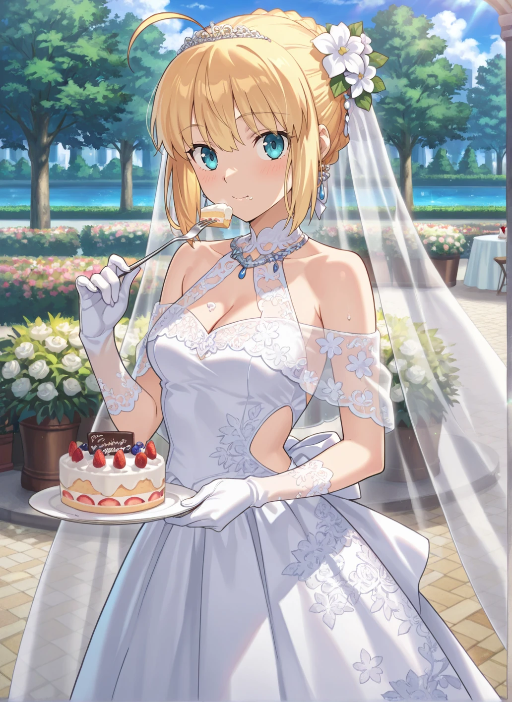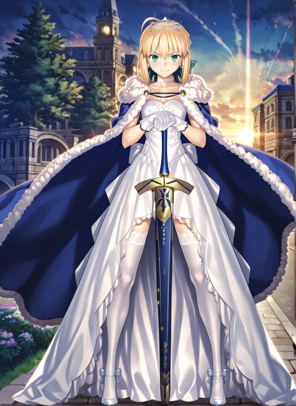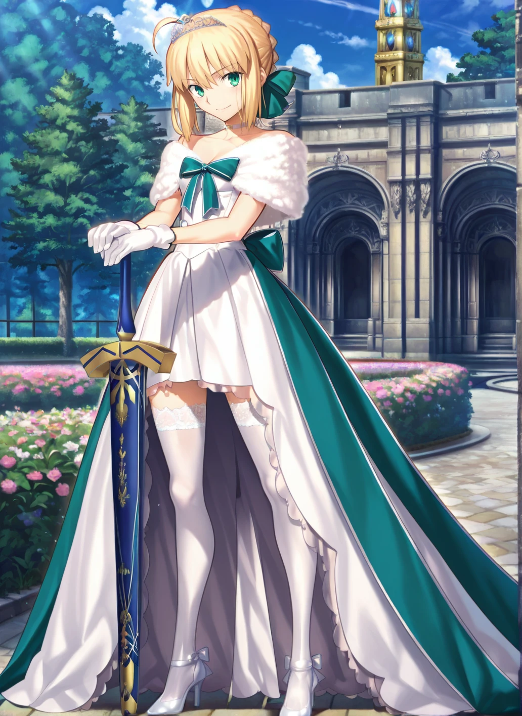 artoriapendragonfgo, 1girl, blonde hair, ahoge, green eyes, choker, bow, tiara, green ribbons, thighhighs, dress, gloves, white gloves, white dress, ahoge, white thighhighs, white footwear, high heels